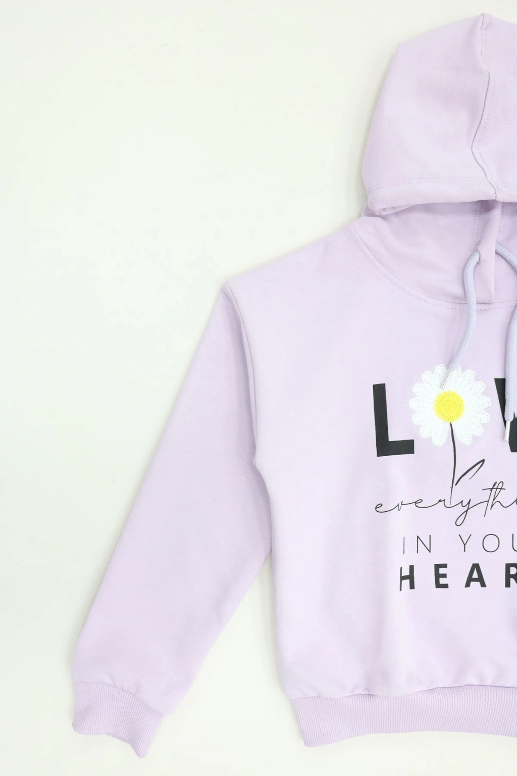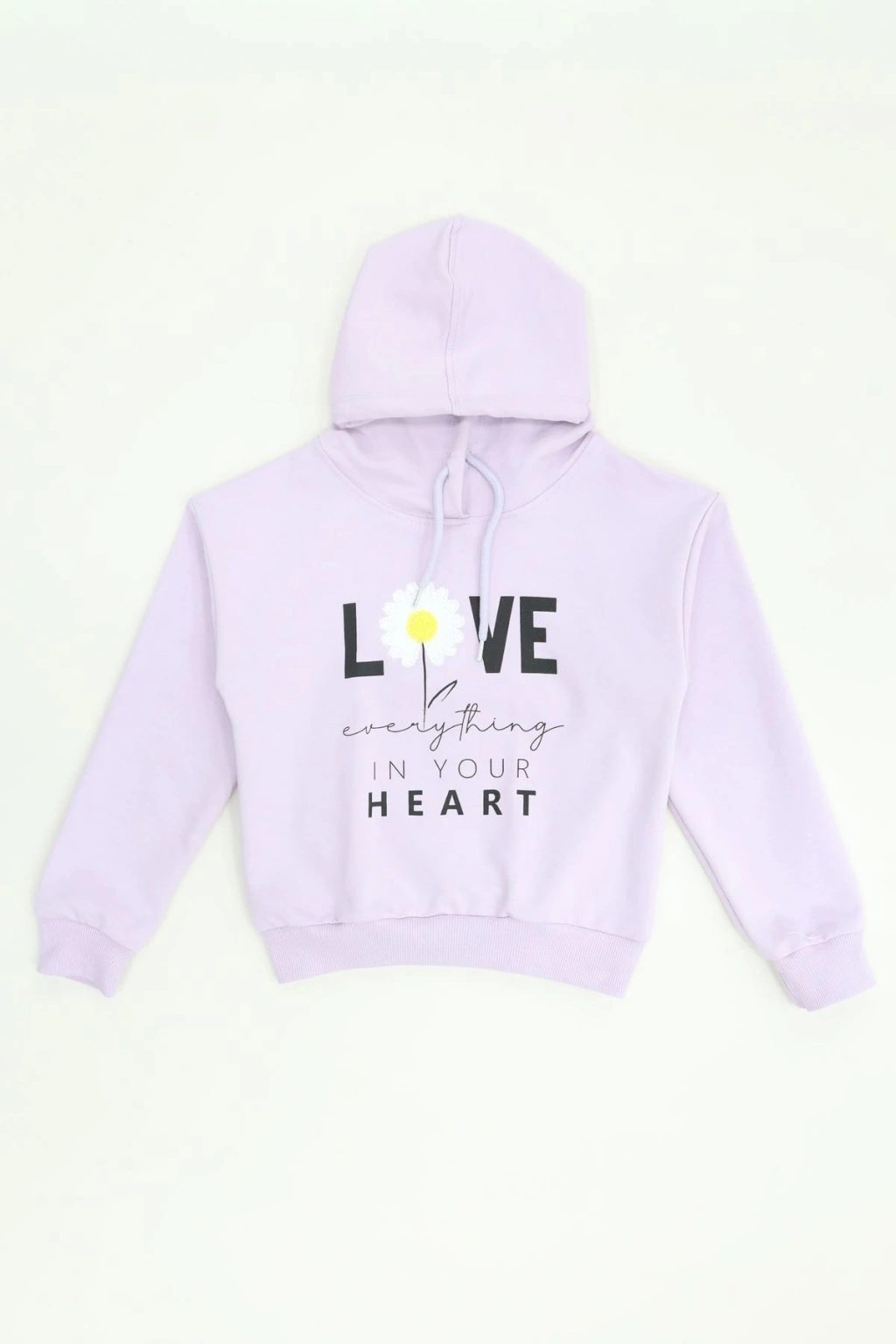 # Lila Kapüşonlu Penye Sweatshirt ## Günlük Rahatlık ve Şıklık Çocuklarınızın günlük kombinlerine neşe katacak **lila kapüşonlu penye sweatshirt**, 5-8 yaş arası minikler için ideal bir seçimdir. Bu konforlu tasarım, **2 ip şardonsuz kumaşı** sayesinde mevsim geçişlerinde hafif ve nefes alabilir bir yapı sunar. Modelimiz, üzerinde bulunan "LOVE IN YOUR HEART" yazılı ve papatya detaylı baskısıyla çocukların enerjisini yansıtır. Özellikle **rahat çocuk kıyafeti arayanlar** için bu parça, kalitesiyle öne çıkıyor. %70 pamuk, %25 polyester ve %5 elastan içeriğiyle hazırlanan bu lila sweatshirt, gün boyu hareket özgürlüğü sağlar. Esnek ve **pamuklu dokusu** sayesinde oyun oynarken veya günlük aktivitelerde rahatlık sunan bu model, çocukların hassas cildine dosttur. Normal kalıbı ile rahat bir oturuş sağlayan bu tasarım, uzun süreli kullanım için dayanıklılık vadediyor. Ekonomik seçeneklerden biri olan bu ürün, çocuk gardıroplarının vazgeçilmezi olmaya aday. Hemen sepete ekleyin.