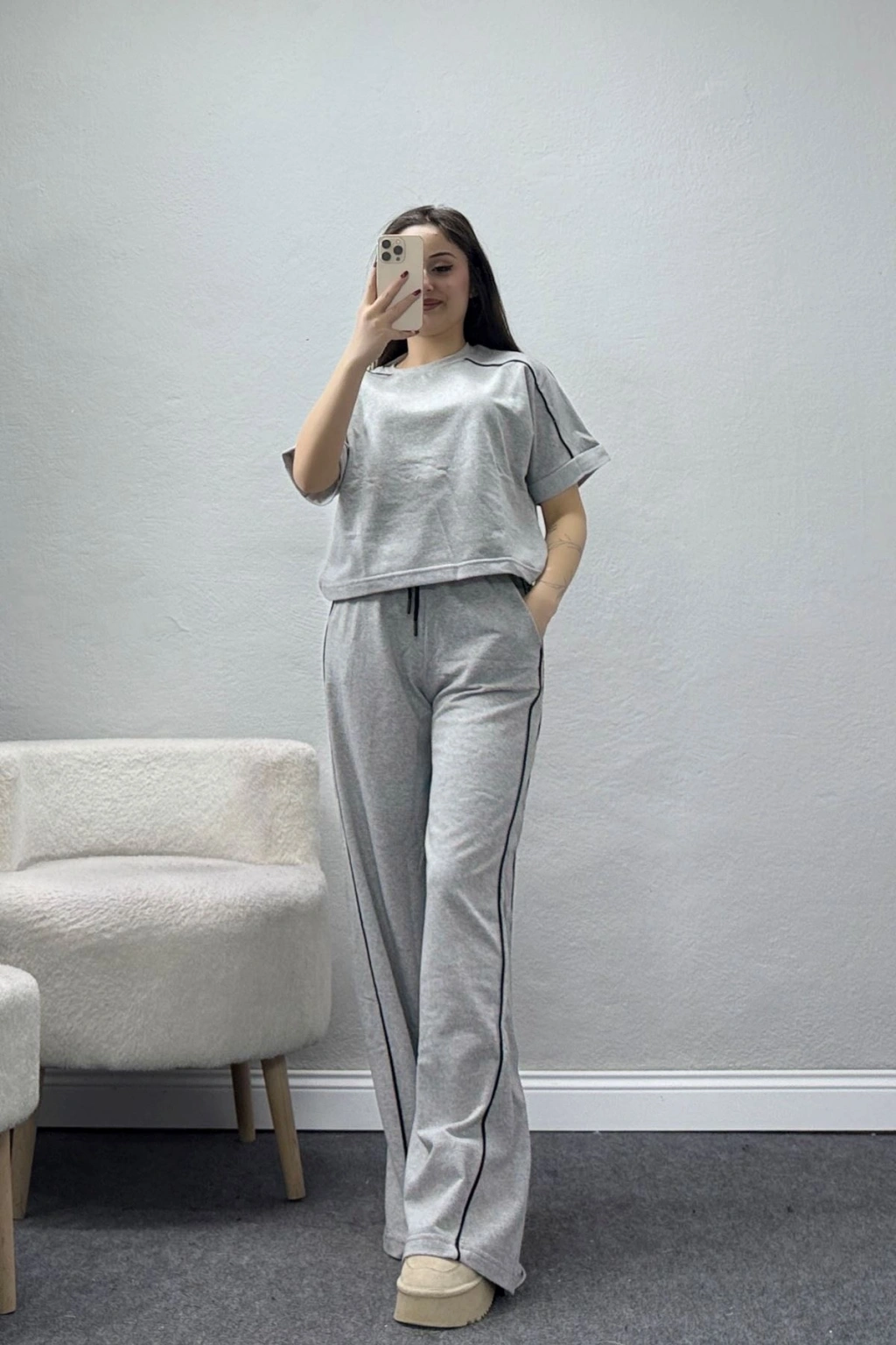 # Biyeli Gri Eşofman Takımı ## Rahat Kesim ve Esnek Yapı Konforu ve sportif şıklığı bir araya getiren bu **iki iplik eşofman takımı** ile her adımda hareket özgürlüğünün ve yumuşak dokunun keyfini gün boyu çıkarın. Bu parça, içeriğindeki likra sayesinde vücudun doğal hareketlerine uyum sağlayarak gün boyu süren bir rahatlık hissi uyandırır. Gri rengin sakinliğini taşıyan bu tasarım, modern kesimiyle stil sahibi bir duruş sergilemenize olanak tanır. Özellikle **gri eşofman** modellerinde aranan yumuşak pamuklu doku bu üründe belirgin şekilde hissedilir. Rahat bir eşofman takımı arayanlar için tasarlanan bu set, kaliteli dokusuyla dikkat çeker. Modelimiz, omuzlardan paça ucuna kadar inen ince siyah biye detaylarıyla estetik ve sportif bir görünümü aynı anda sunar. Kısa kollu üst bölümün ferah yapısı ile **geniş paça eşofman altı** tasarımının dökümlü duruşu, fiziksel kısıtlama yaratmadan hafiflik hissi bırakır. Bel bölgesindeki ayarlanabilir kordon detayı, bu tasarımın kullanım kolaylığını artırarak kişisel konforunuzu destekler. Dayanıklı iki iplik örme kumaşıyla hazırlanan bu ürün, ekonomik fiyat performans dengesine sahiptir. Satın almak için sepete ekleyin.