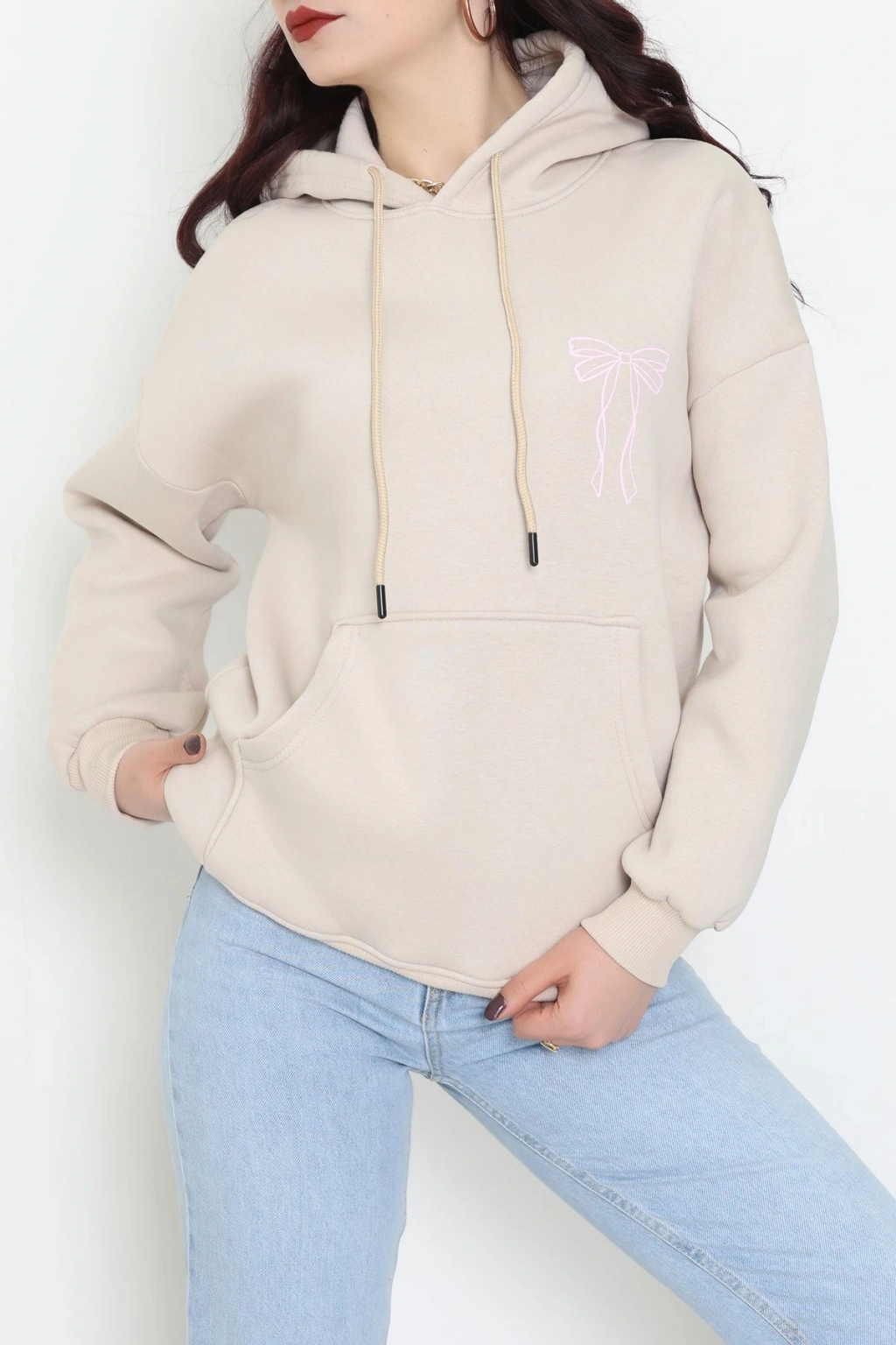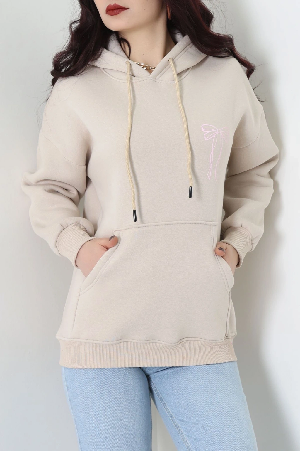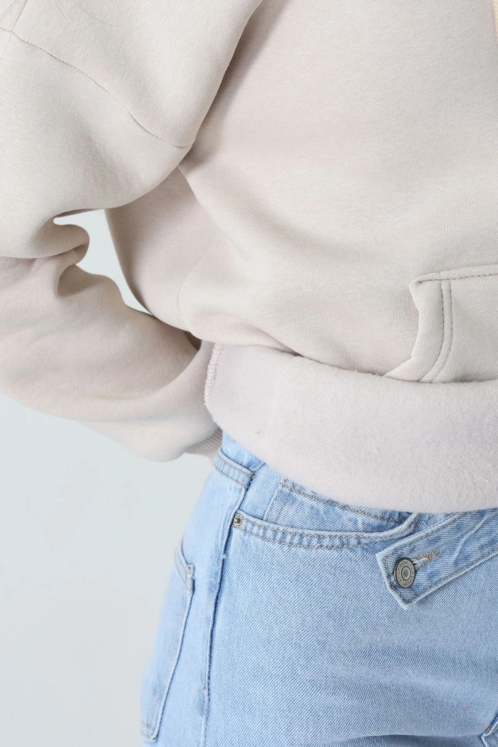 3 İplik Kanguru Cepli Kapşonlu Sweat Bejpembe - 42255.1878.