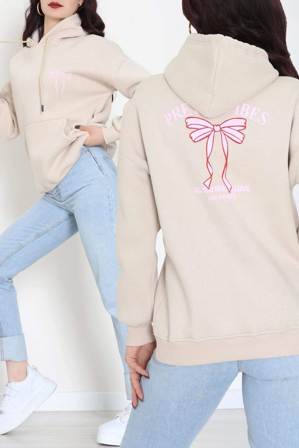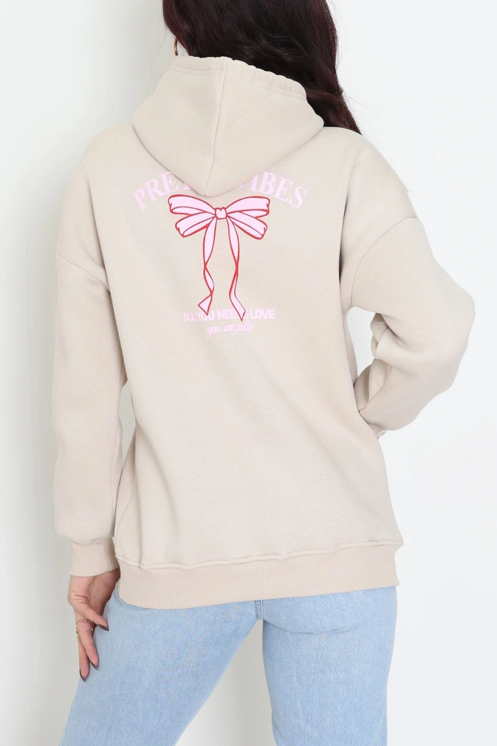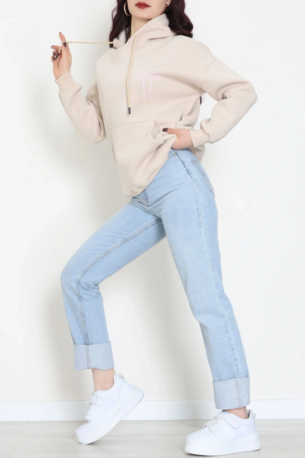 3 İplik Kanguru Cepli Kapşonlu Sweat Bejpembe - 42255.1878.