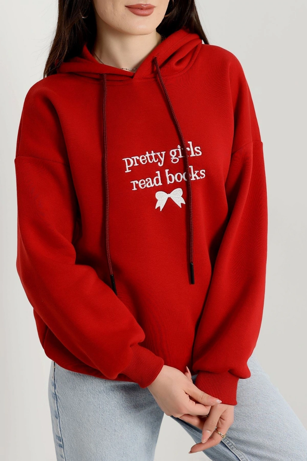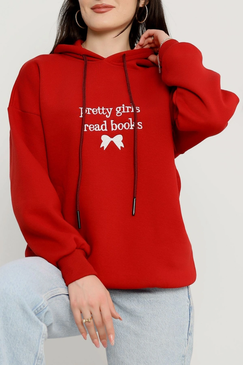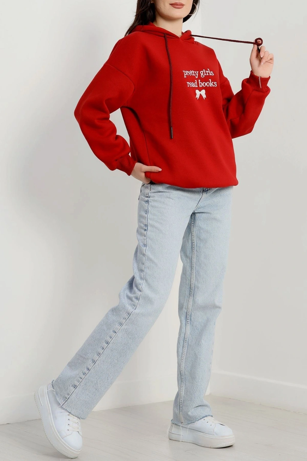 3 İplik Kapşonlu Nakışlı Sweat Bordobeyaz - 42228.1878.