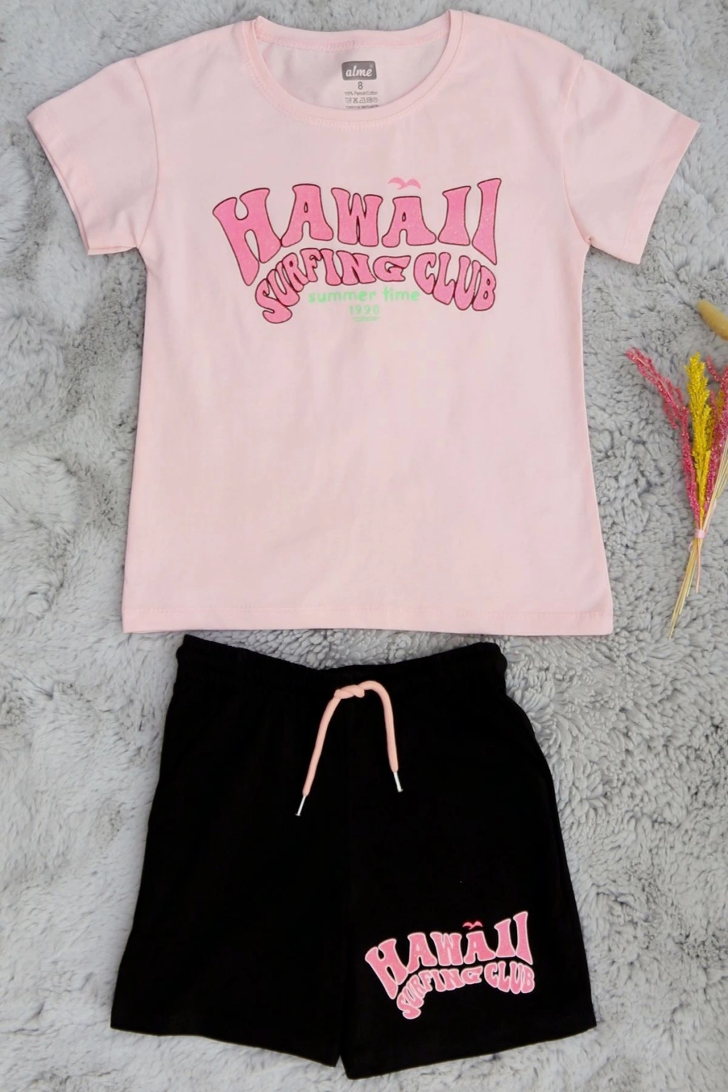 # Şortlu Genç Takım ## Tasarım ve Konfor Detayları Bu tasarım, enerjik çocukların hareket özgürlüğünü kısıtlamayan konforlu yapısı ile öne çıkan bir **genç takım** modelidir. Yumuşak dokulu kumaşı cildin doğal yollarla nefes almasını sağlayarak gün boyu serin ve kuru bir his bırakır. Modelimiz üzerindeki Hawaii yazılı pembe grafik baskılar, siyah şortla kontrast oluşturarak sportif görünüme canlılık katar. Bu şık ve işlevsel **şortlu takım** sayesinde hareketli aktiviteler sırasında beklenen esneklik kolayca yakalanır. Bel kısmındaki esnek yapı ve pembe bağcık detayı, siyah şortun tişört ile görsel uyumunu tamamlayarak estetik bir görünüm sağlar. Pamuklu ipliklerden dokunan tişörtün yakası, kullanım sırasında sarkma yapmayan sağlam dikişlerle desteklenmiştir. **Baskılı genç takım** arayanlar için bu model, hem ev içi hem de dış mekan kullanımında pratik çözümler sunar. Dayanıklı yapısı ve konfor odaklı kesimiyle bu genç takım ekonomik bir seçenektir. Siparişinizi oluşturun.