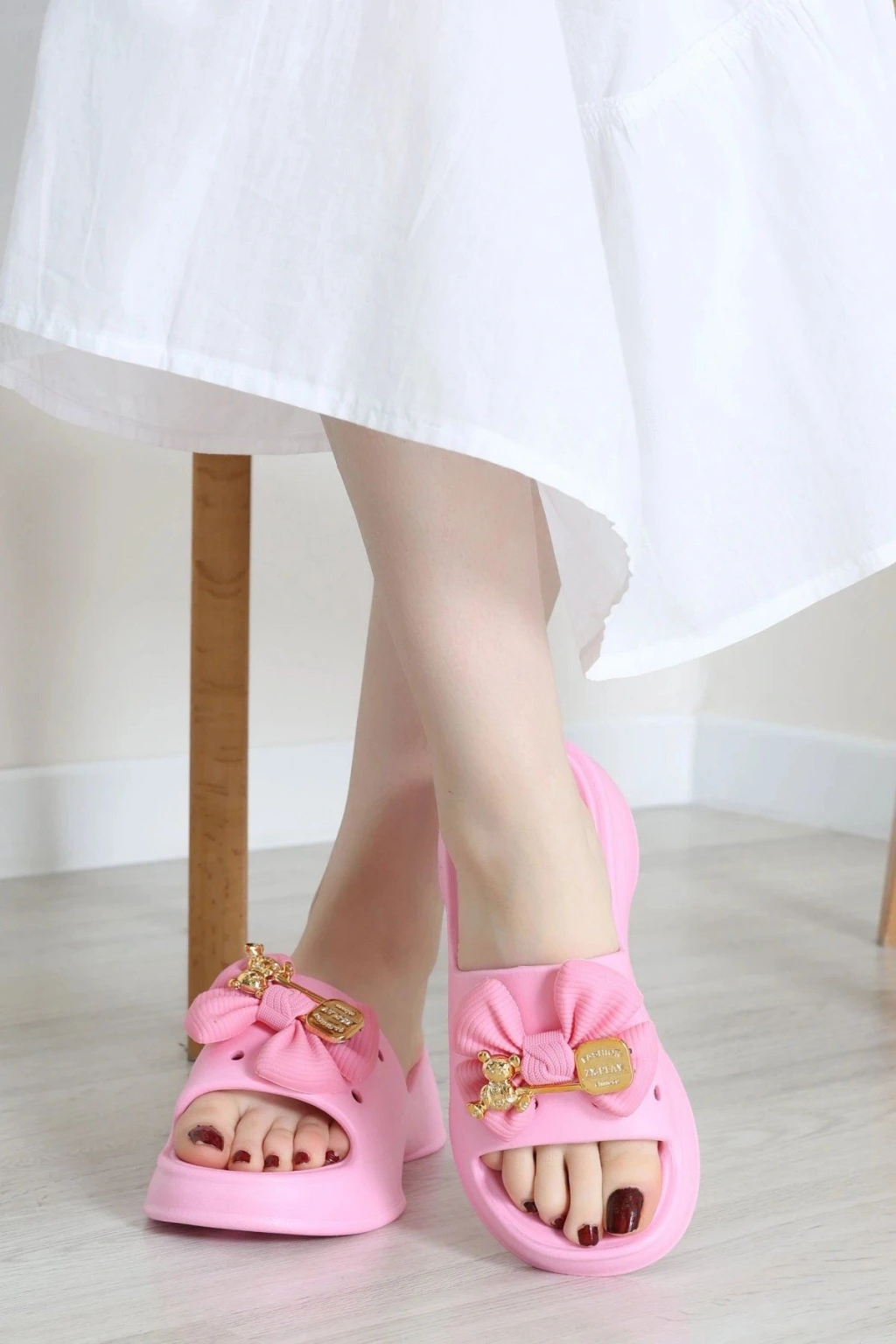# Fiyonk Aksesuarlı Pembe Terlik ## Konforlu Yapı ve Şık Tasarım Hafif yapısıyla ayakları yormayan **pembe terlik** modelimiz, gün boyu rahatlık sunarken canlı rengiyle enerjinizi her adımda yükseltir. Bu tasarım, kalın taban yapısı sayesinde zemin darbelerini etkili bir şekilde emerek oldukça yumuşak bir basış hissi sunar. Üzerinde yer alan büyük fiyonk detayı ve parlayan gold süslemeleriyle aksesuar terlik arayışında olanlara estetik bir çözüm sağlar. Modern kalıbıyla bu parça ayak anatomisine tam uyum göstererek bu **aksesuar terlik** modelinin sunduğu konforu ön plana çıkarır. Modelimiz üzerinde yer alan **fiyonklu terlik** ayrıntısı ve metalik ayıcık figürleri, düz yüzeye hareket katan belirgin fiziksel özellikler arasında bulunur. Suya dayanıklı materyali ve özel dokulu alt tabanı, farklı zeminlerde dengeli ve güvenli bir kullanım deneyimi yaşatır. **Yüksek taban terlik** seven kullanıcılar için tasarlanan bu model, esnek dokusuyla cildinizi tahriş etmeden kavrar. Aksesuar detaylı terlik arayanlar için uygun olan bu aksesuar terlik, dayanıklı malzemesiyle ekonomik bir tercih oluşturur. Hemen sepete ekleyin.