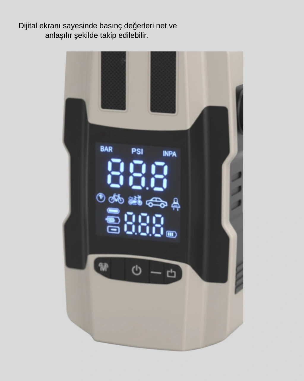 Bu çok amaçlı araç cihazı, sürüş güvenliğini artırmaya yönelik olarak tasarlanmıştır. Dahili hava pompası ile lastikler kolayca şişirilebilir. Akü takviye özelliği, araç aküsünün zayıf olduğu durumlarda destek sağlar. Powerbank fonksiyonu sayesinde telefon, tablet gibi cihazlar şarj edilebilir. Dijital ekranı, kullanım sırasında net bilgi sunarak işlemleri kolaylaştırır.