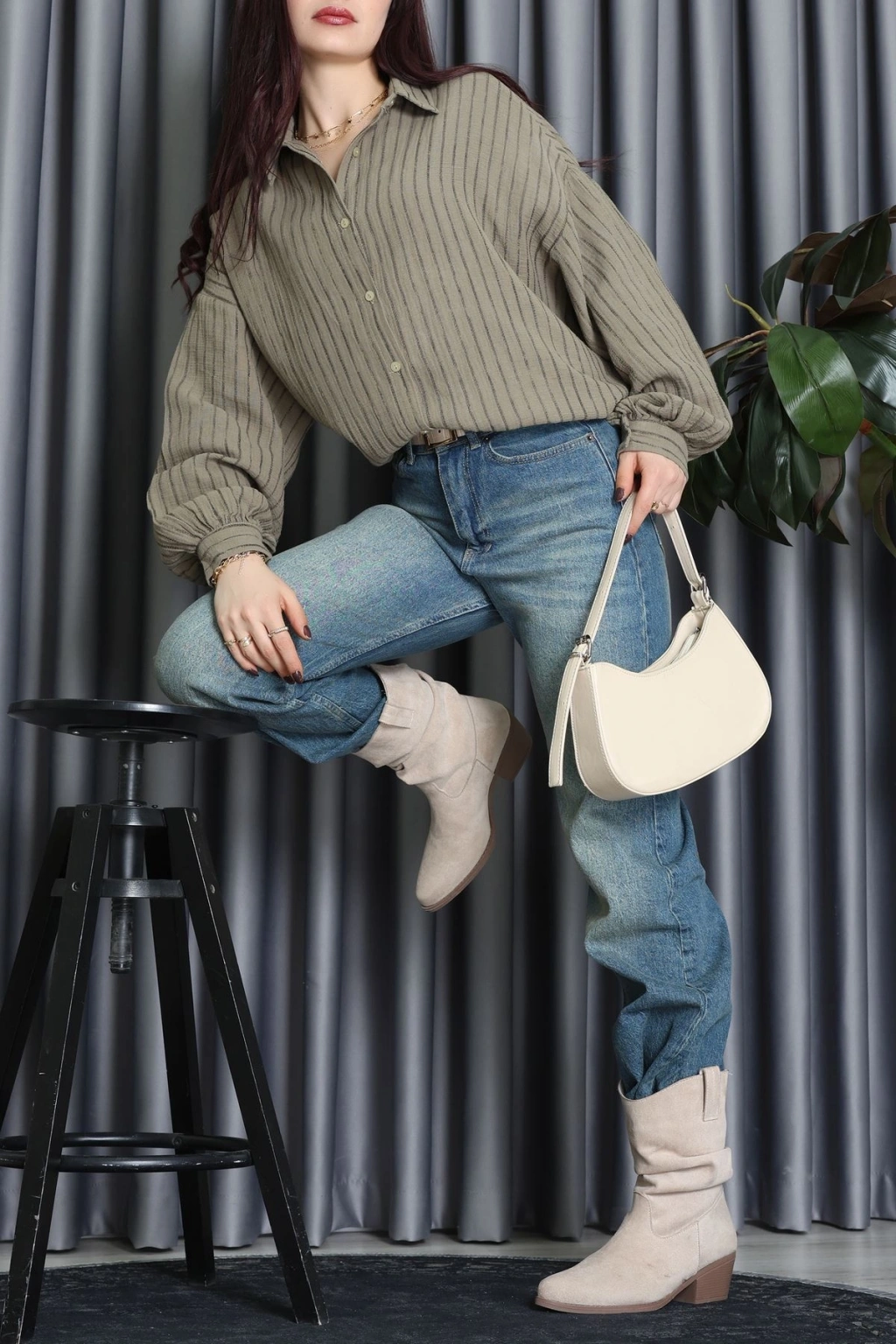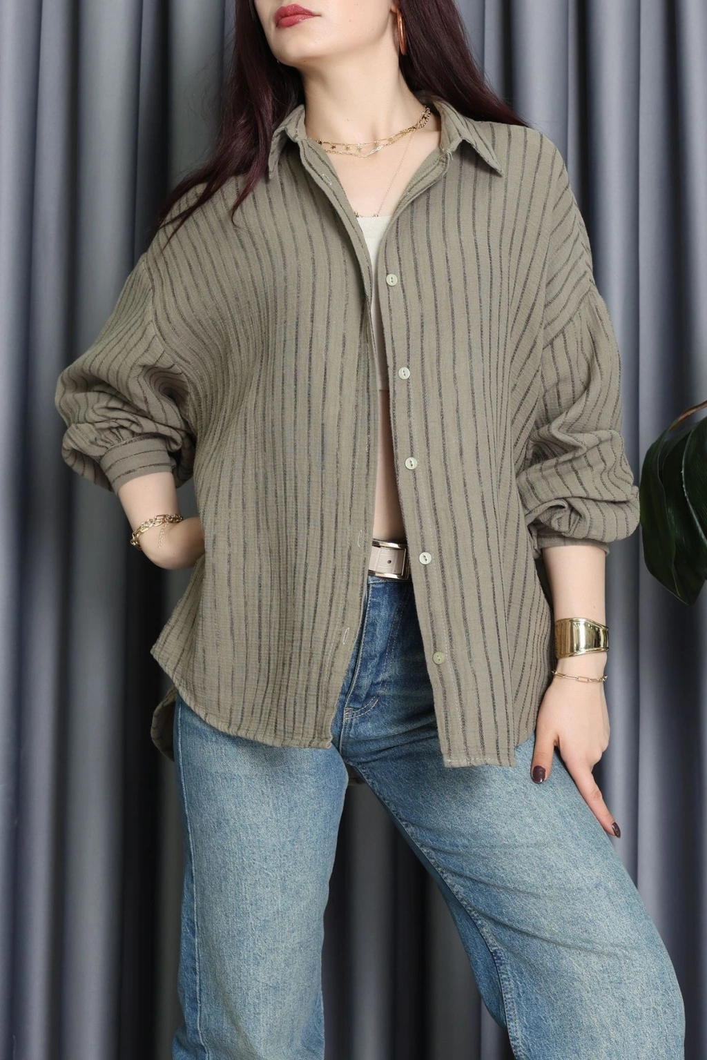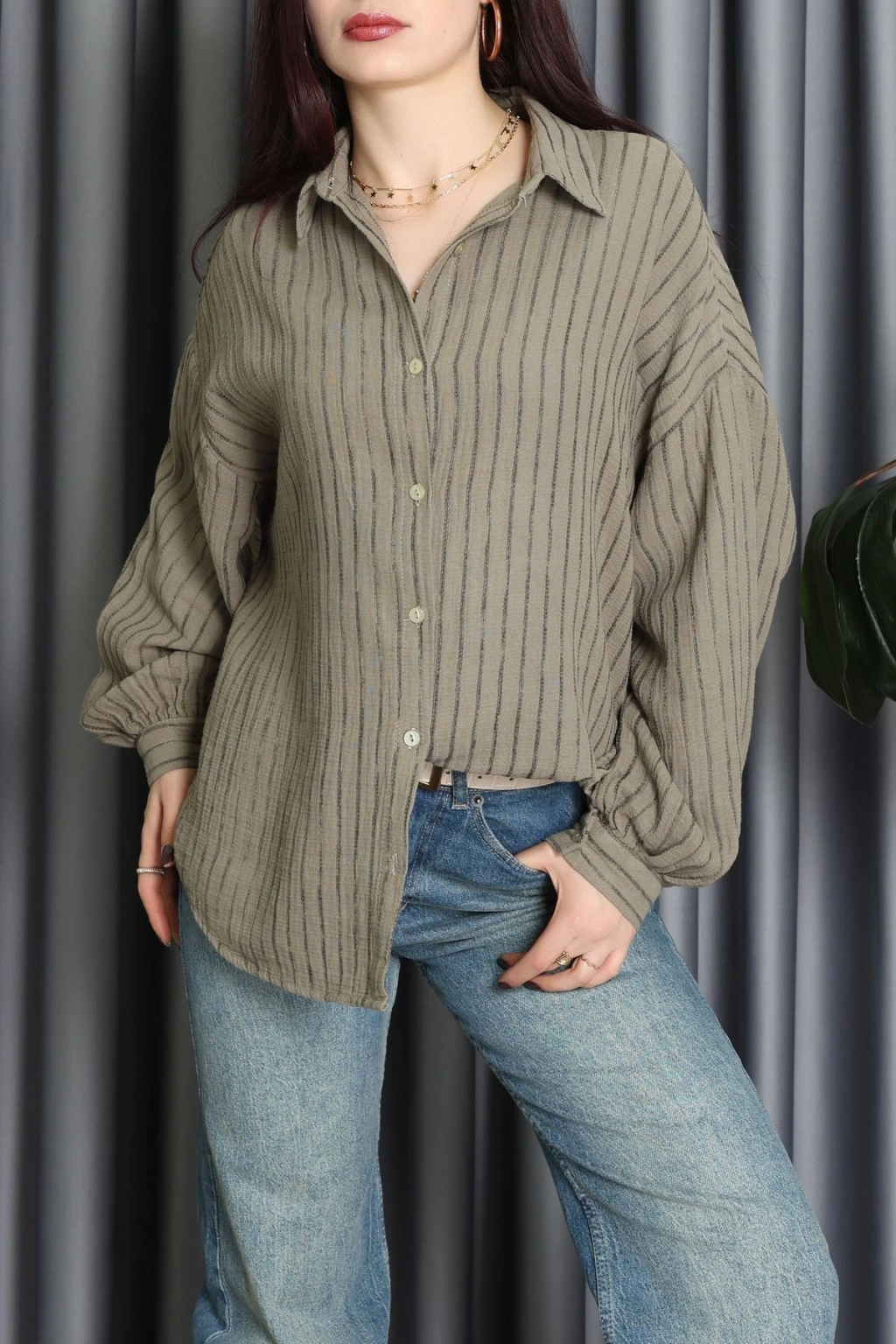Armürlü Müslin Oversize Gömlek Haki - 70994.1934.