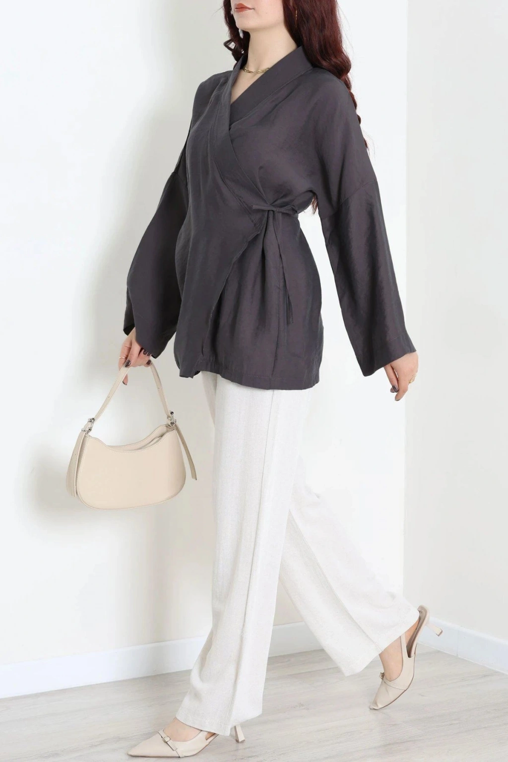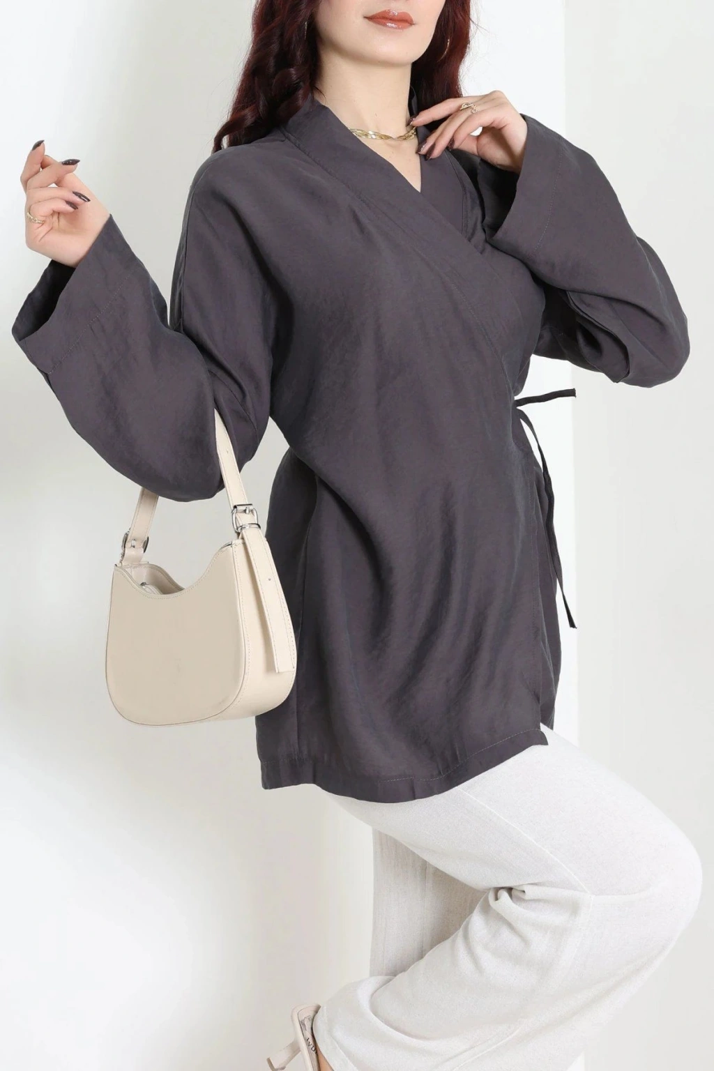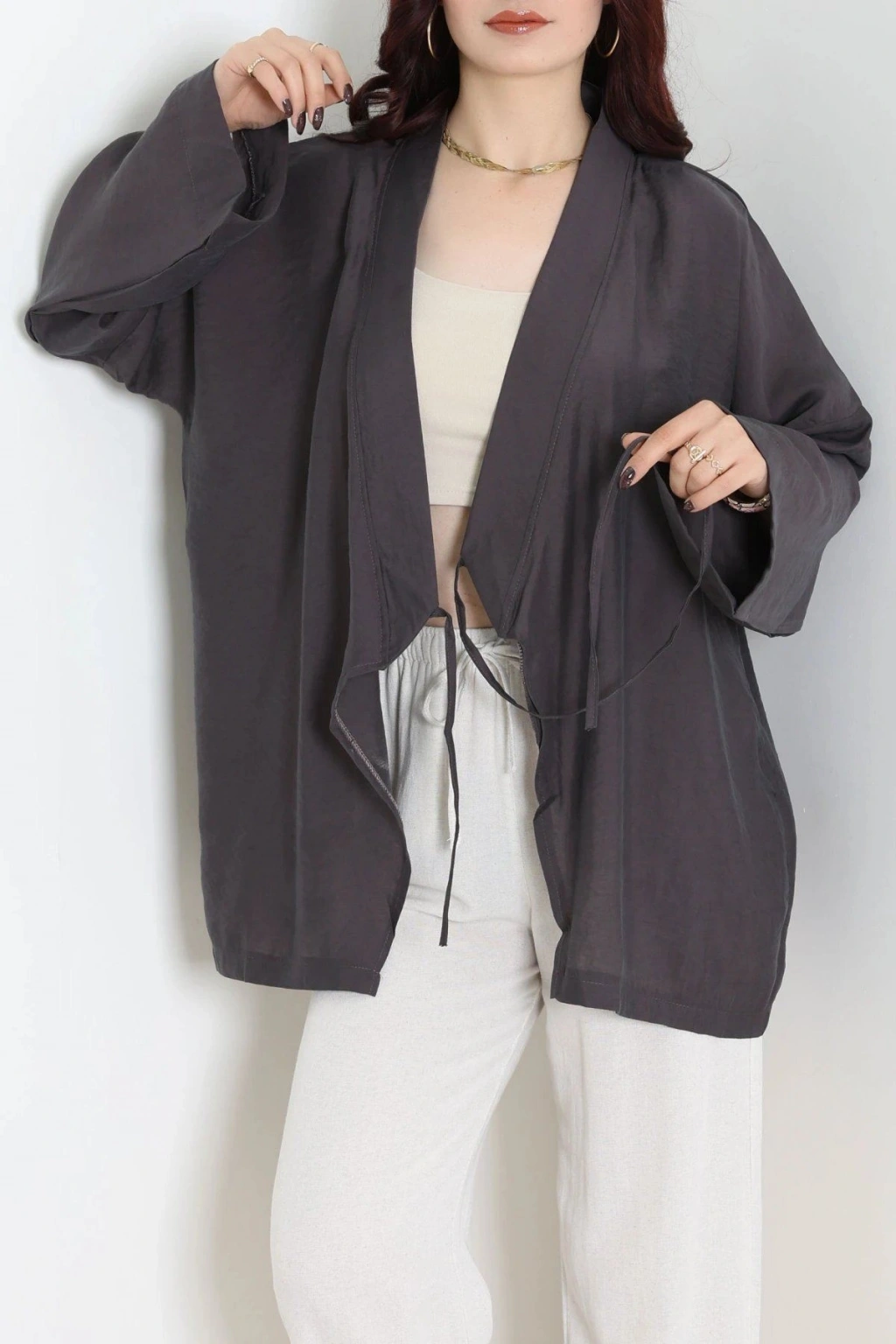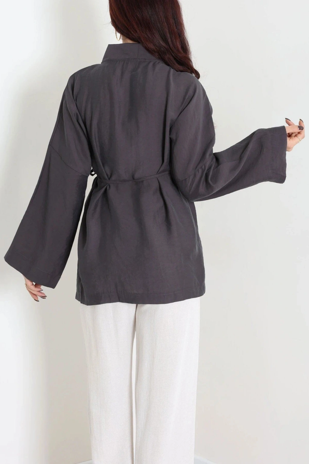 # Antrasit Bağlamalı Kimono ## Konfor ve Zarafetin Buluşması Şık duruşu ve **anlatılmaz rahatlığıyla antrasit bağlamalı kimono**, günlük ve özel anlarınızda vazgeçilmeziniz olmaya aday. Bu **modal kimono**, ipeksi dokunuşuyla cildinize narin bir his sunar. Esnek yapısı ve normal kalıbı sayesinde gün boyu hareket özgürlüğü sağlar. Uzun kollu tasarımı, sofistike bir silüet oluştururken, bağlama detayı ise modele özgünlük katar. Ön kısmındaki V yaka kesimi ve yandan bağlama detayı, beli vurgulayarak zarif bir görünüm sunar. Modal kumaşın antrasit rengiyle birleşimi, her ten rengine uyum sağlayarak kolay kombinlenebilirlik vaat eder. Özgün ve **rahat bir kadın kimono arayanlar için** bu parça, stilinizi bir üst seviyeye taşıyacak. Uzun ömürlü kullanımı ve kalitesiyle bu tasarım, fiyat performans ürünü olarak öne çıkar. Hemen sepete ekleyin.