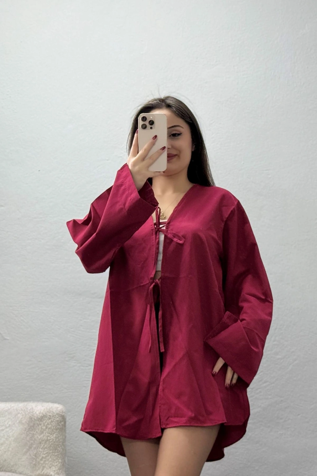 # Bağlamalı Terikoton Gömlek ## Hafif Doku ve Salaş Kesim Detayları Canlı vişne tonuyla dikkat çeken bu **terikoton gömlek**, terletmeyen dokusu ve dökümlü duruşuyla konforlu bir kullanım sunar. Modelimiz, ince kumaş kalitesi sayesinde vücudunuzda ağırlık yapmadan gün boyu rahat hareket etmenizi sağlar. Esnek olmayan yapısı formunu uzun süre korurken, **salaş kalıp** tasarımı sayesinde modern ve ferah bir silüet oluşturur. Bu parça, hafif yapısı sayesinde serin tutan bir bordo gömlek tercihi için uygun bir zemin hazırlar. Ön kısmındaki çift bağlama detayı ile hareketlenen bu tasarım, geniş kesim kolların sağladığı özgürlükle birleşerek kendine has bir tarz yaratır. **Bağlamalı gömlek** yapısı, ön açıklığı dilediğiniz gibi ayarlamanıza imkan tanırken terikoton kumaşın pürüzsüz dokusu teninize yumuşak bir temas sunar. Rahatlıktan ödün vermeyen salaş terikoton gömlek arayanlar için ideal olan tasarım, dikiş kalitesiyle uzun ömürlüdür. Canlı rengiyle öne çıkan bu model, bütçe dostu ve ekonomik seçenekler arasındadır. Siparişinizi oluşturun.