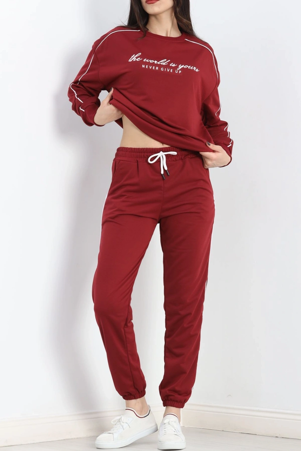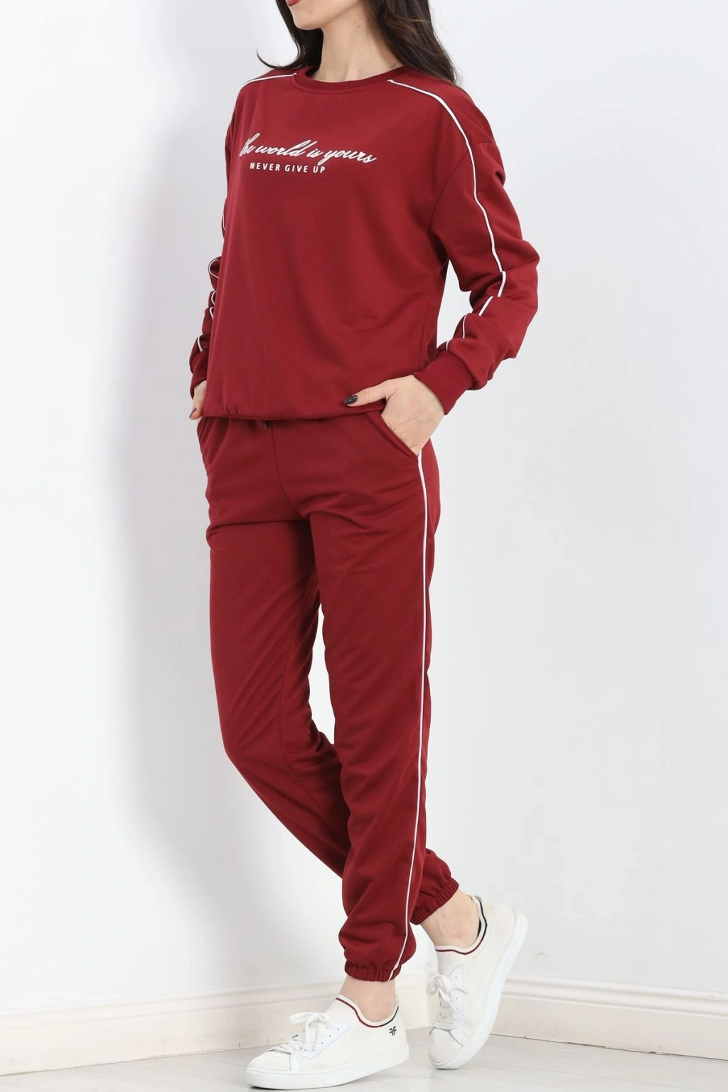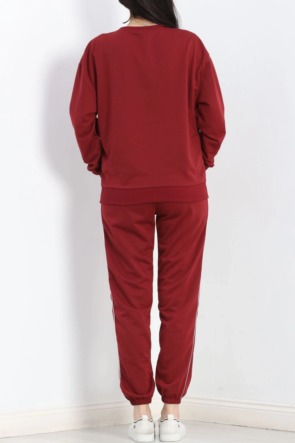 Baskılı Biyeli Eşofman Takımı Bordobeyaz - 20075.1857.