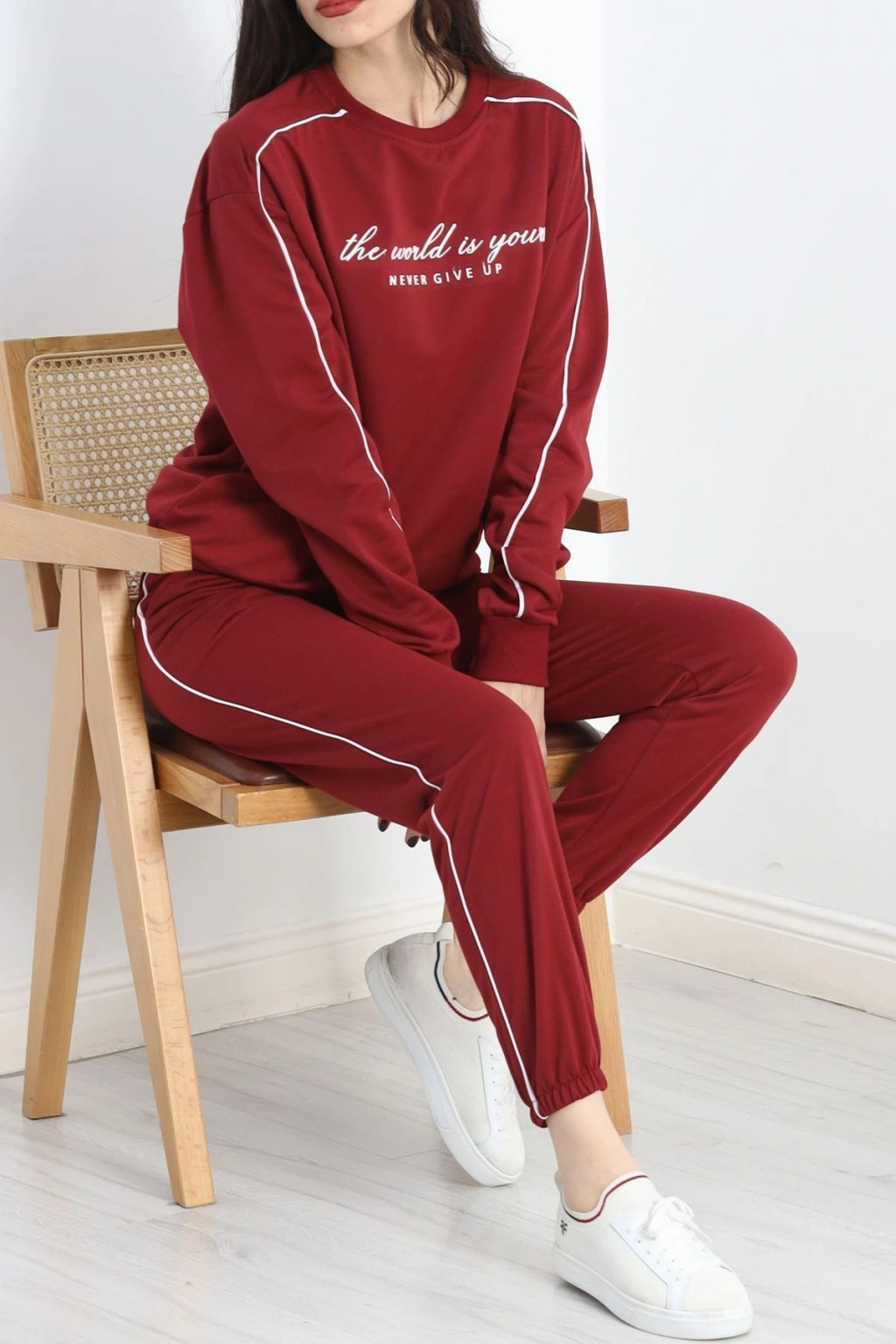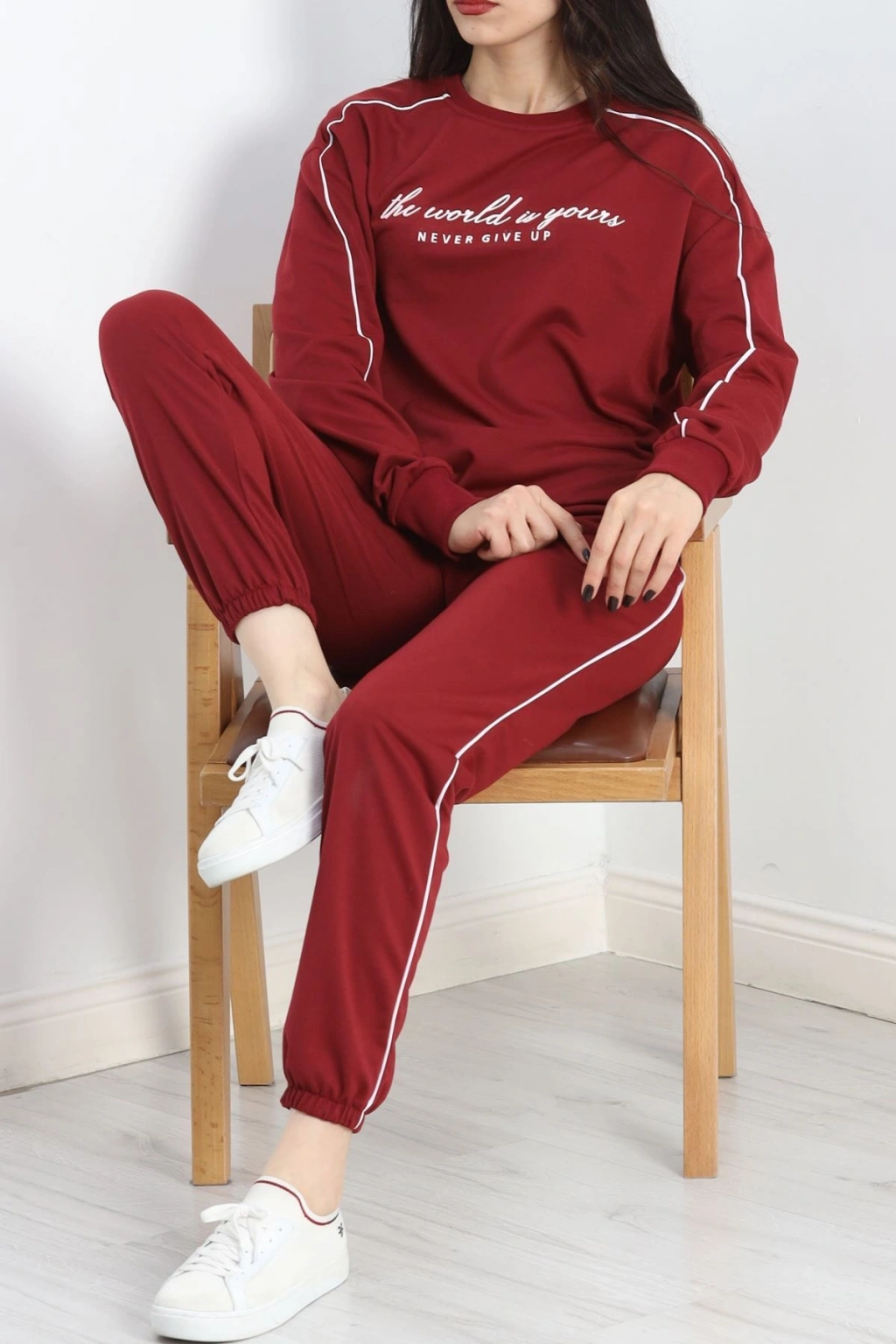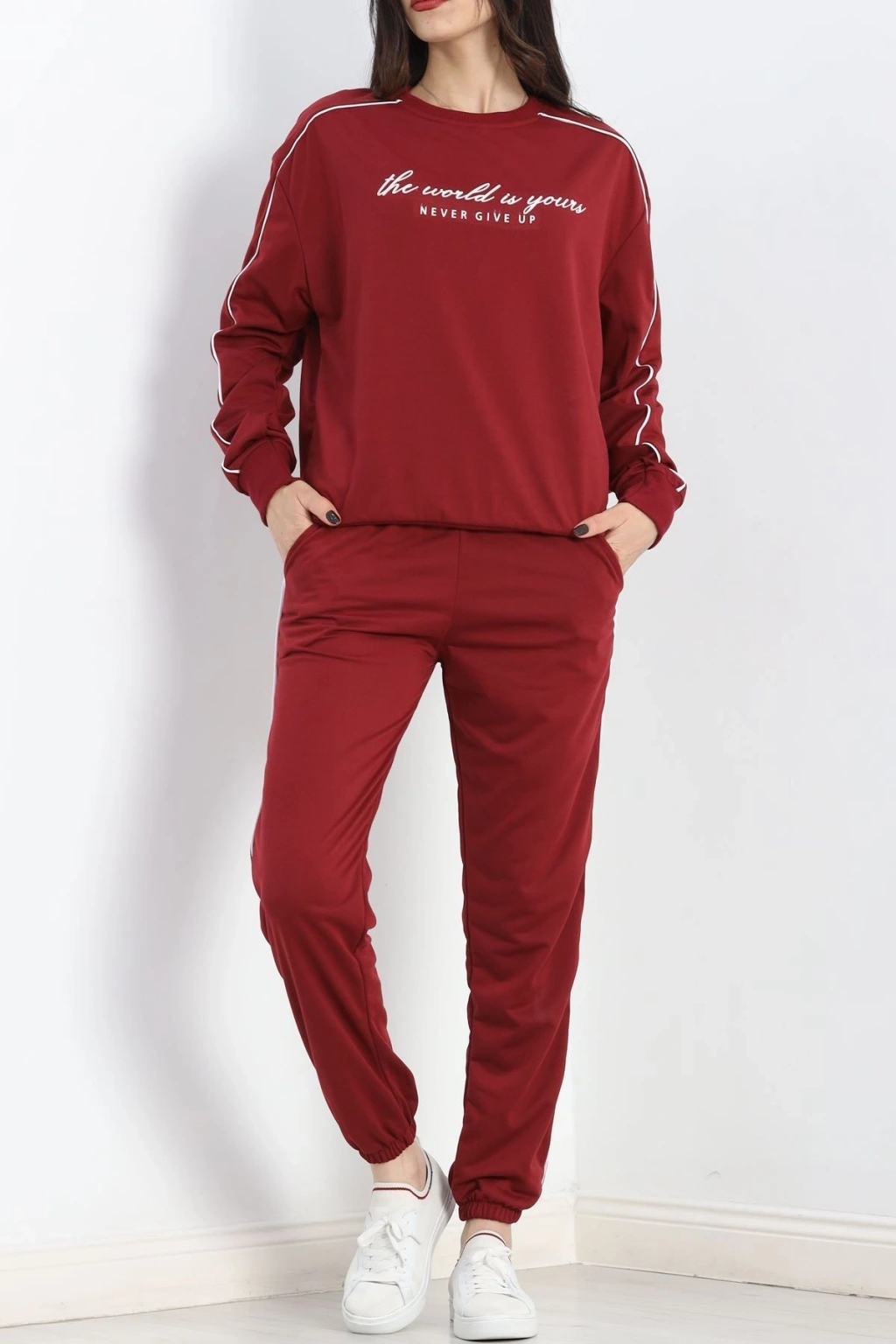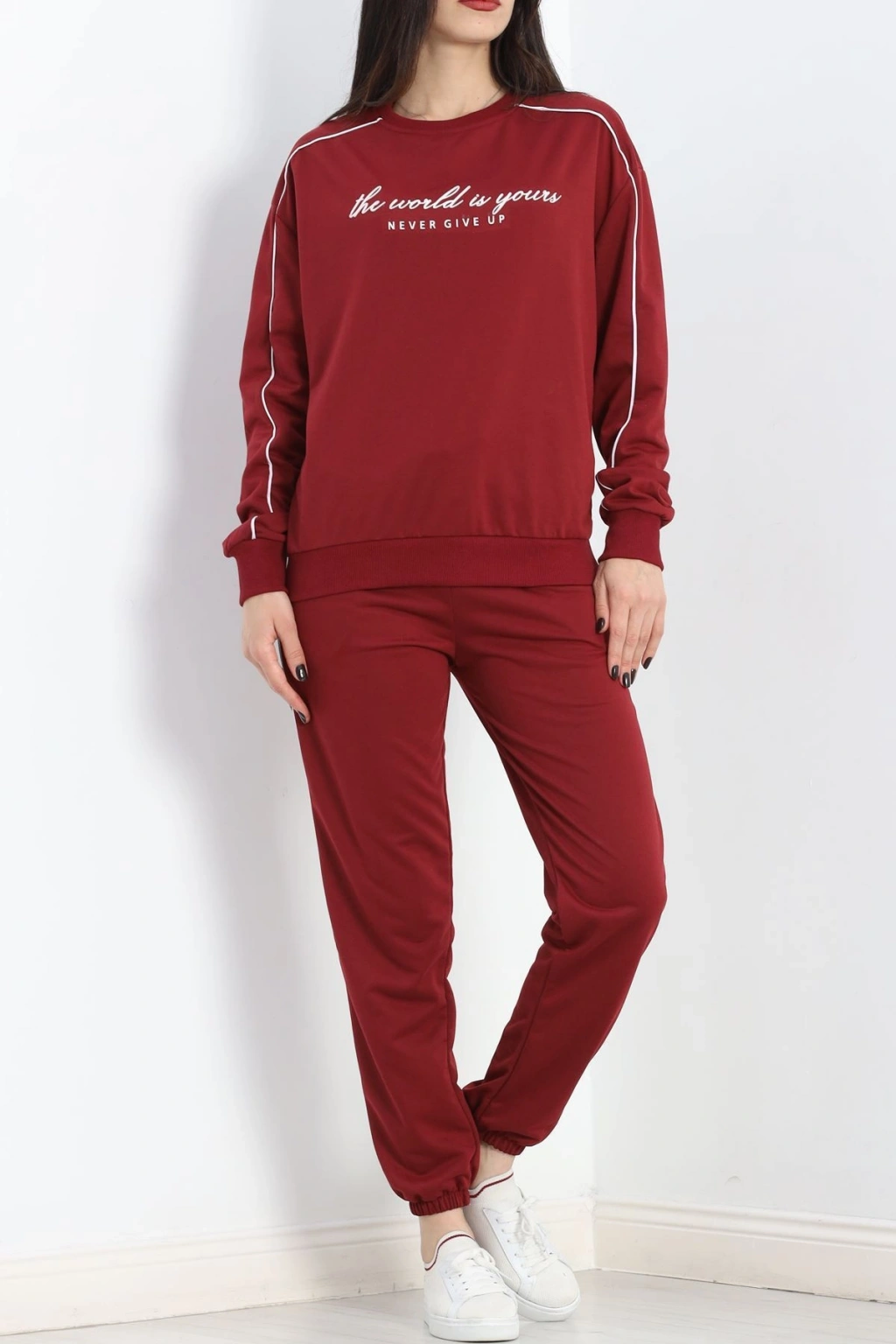 Baskılı Biyeli Eşofman Takımı Bordobeyaz - 20075.1857.
