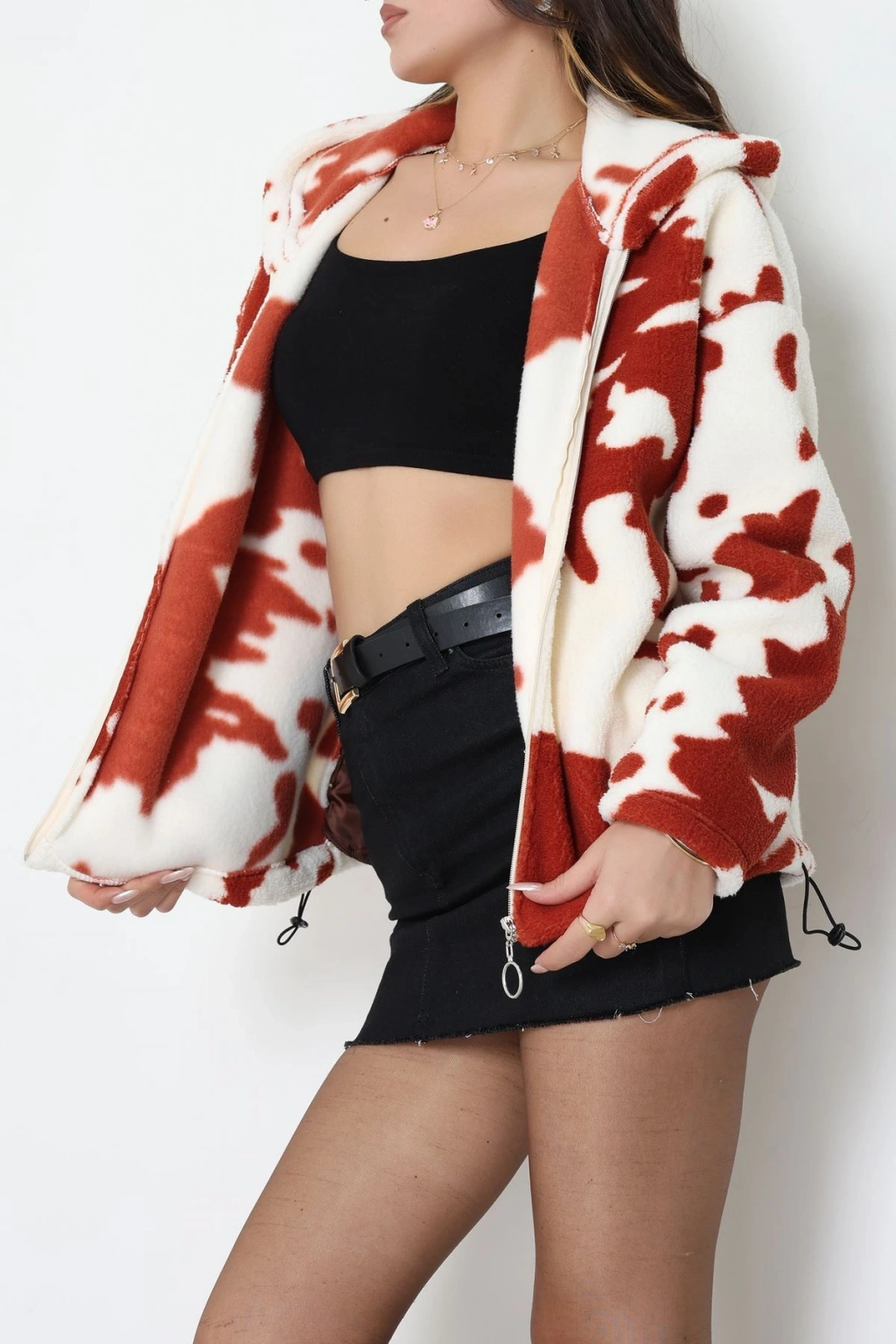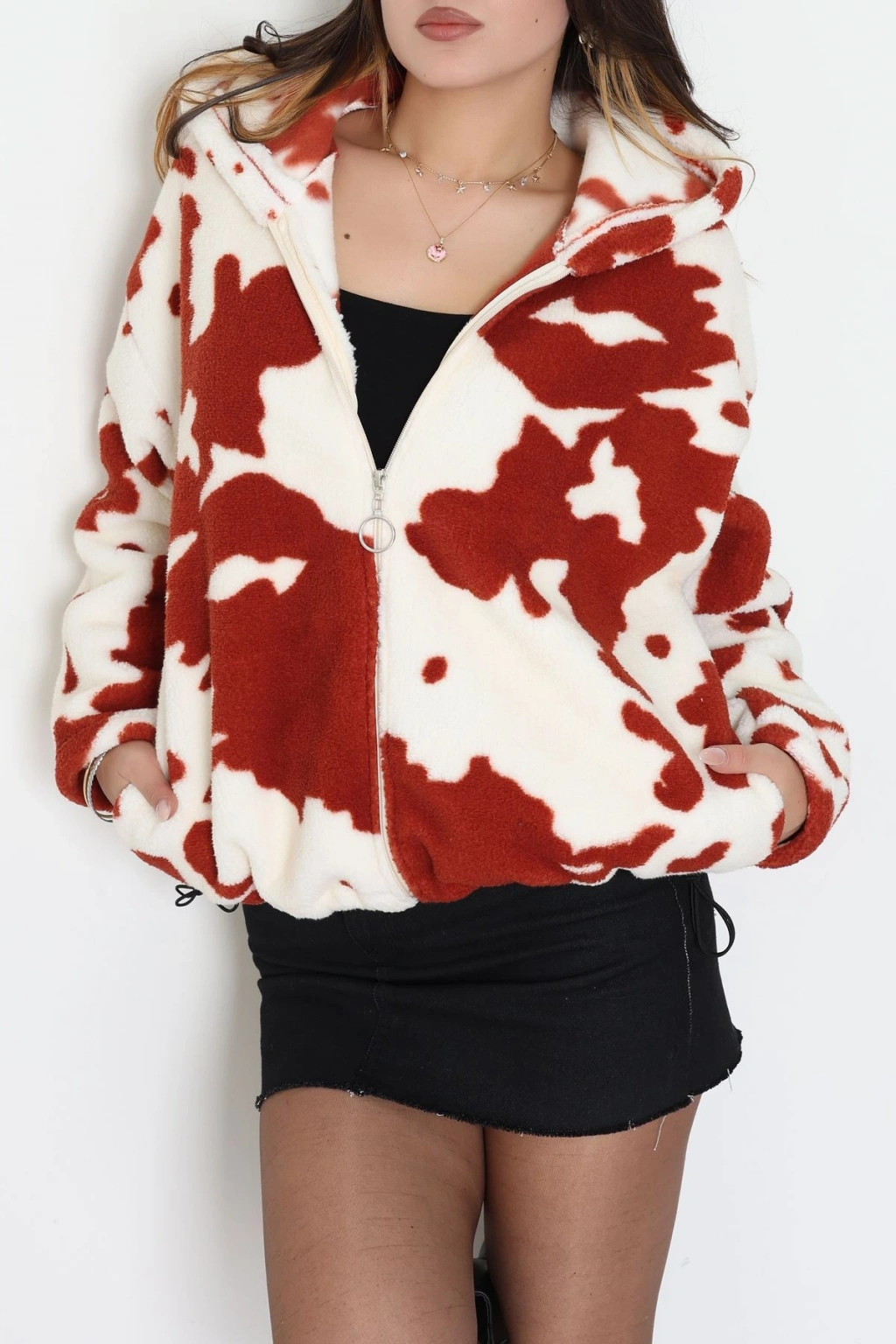 Baskılı Kapşonlu Polar Ceket Ekrukiremit - 31711.1247.