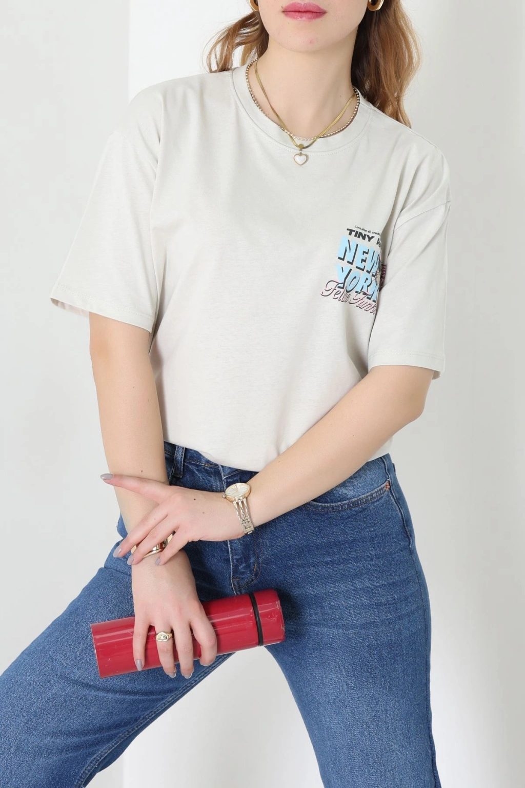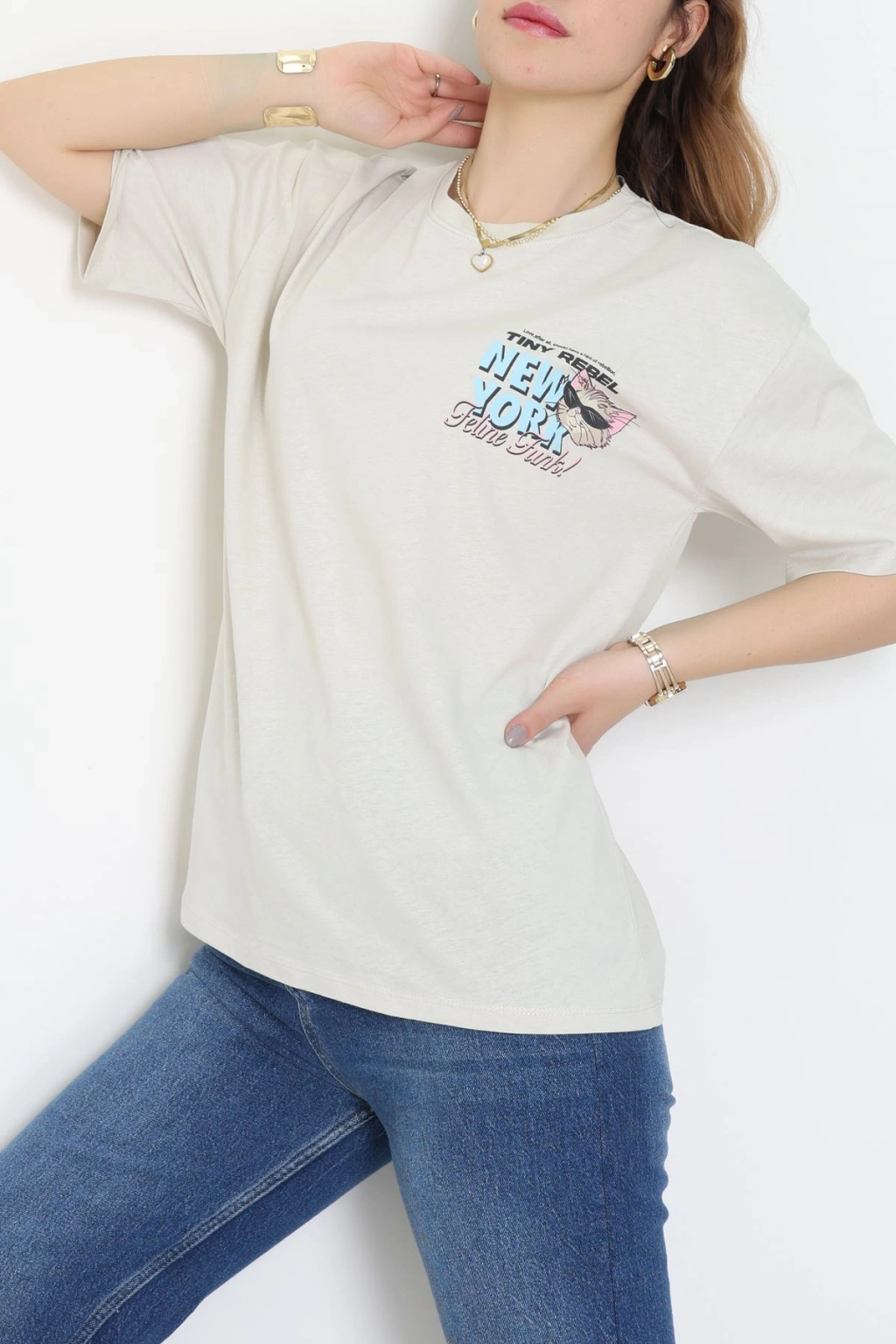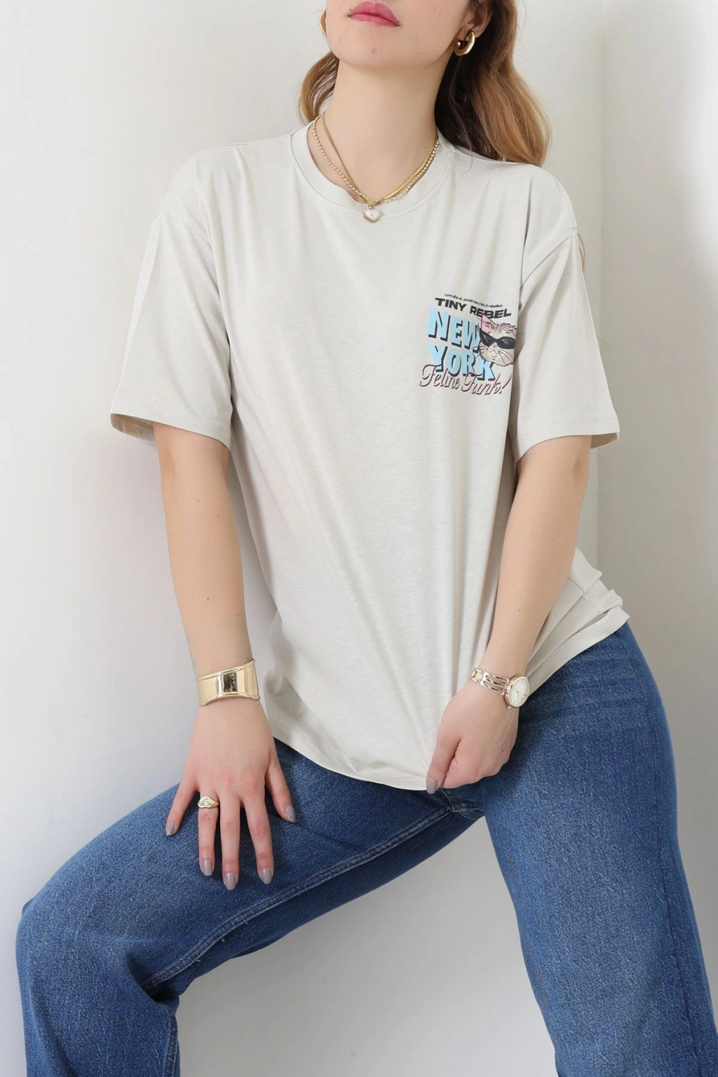 Baskılı Kompakt Penye Tişört Bejmavi - 55044.1872.