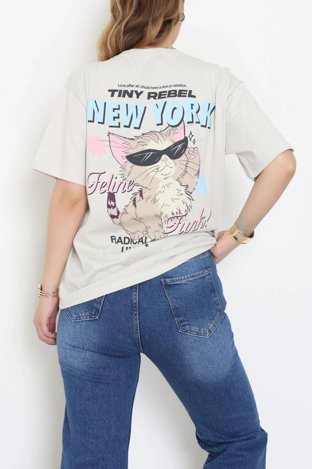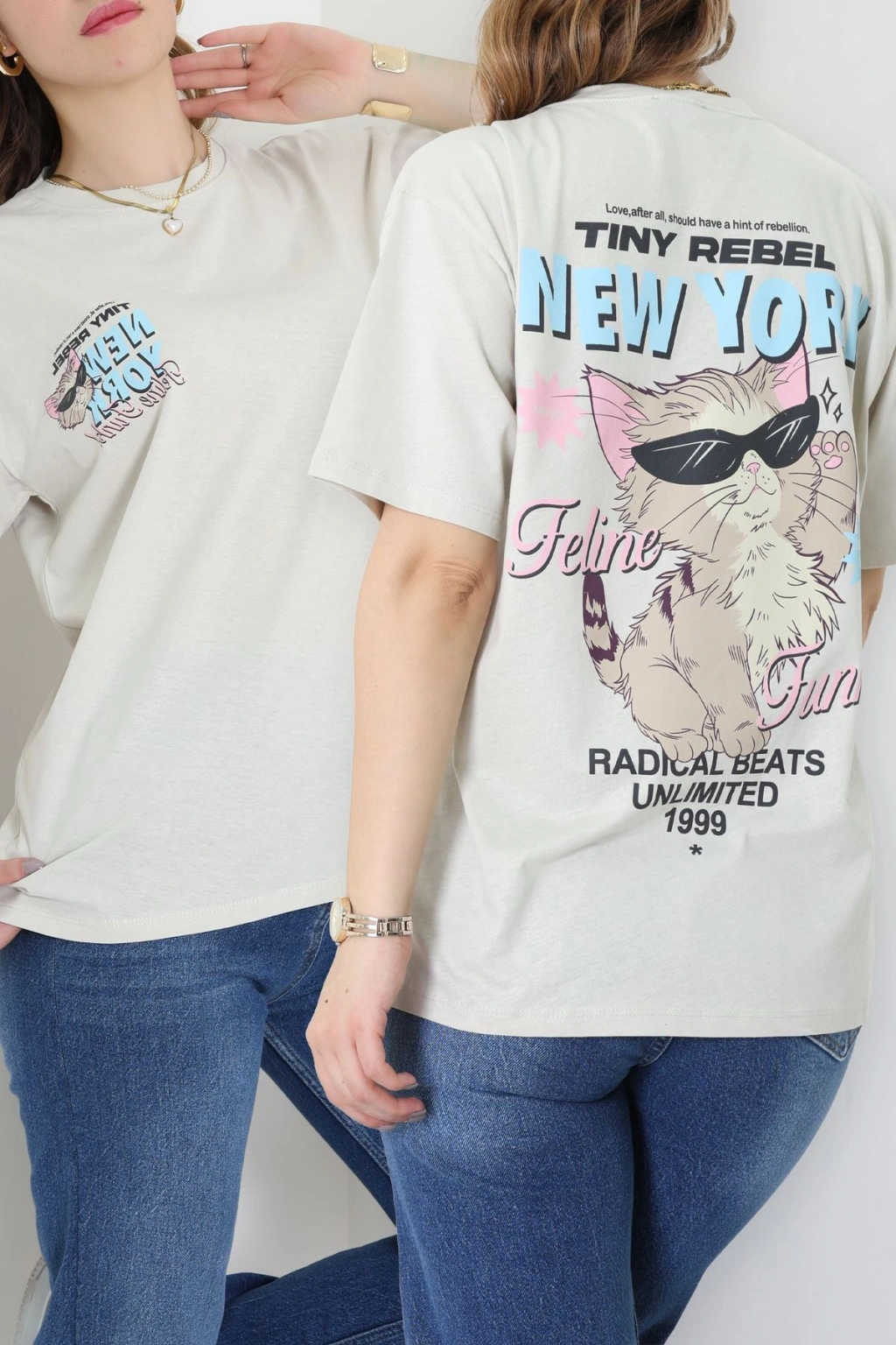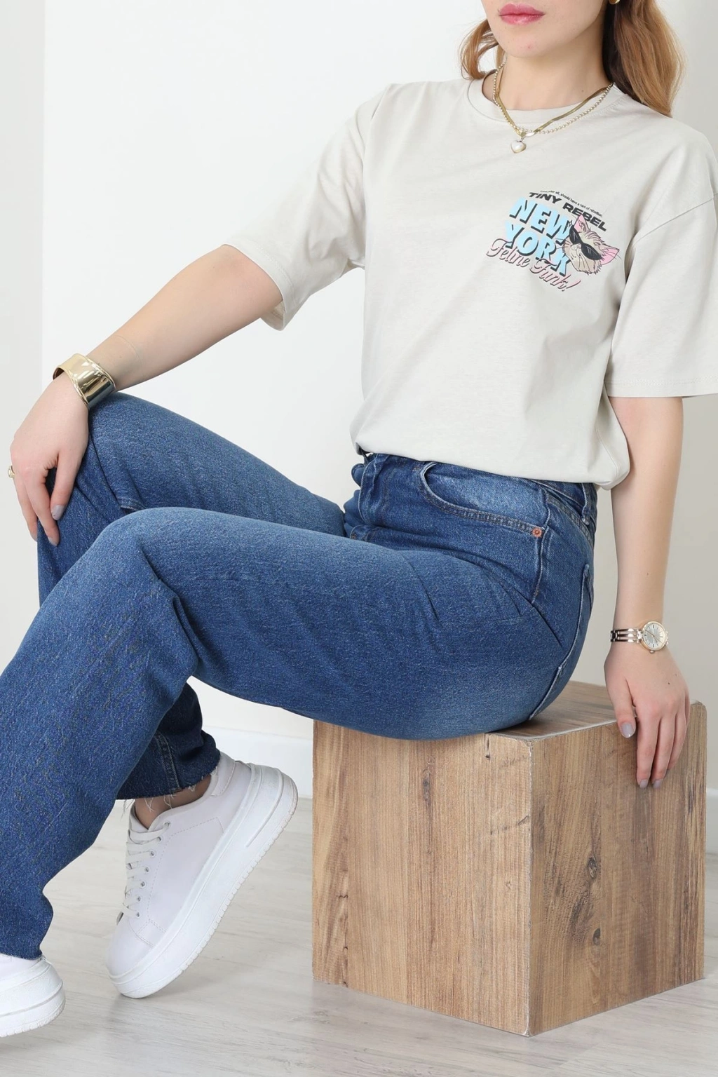Baskılı Kompakt Penye Tişört Bejmavi - 55044.1872.