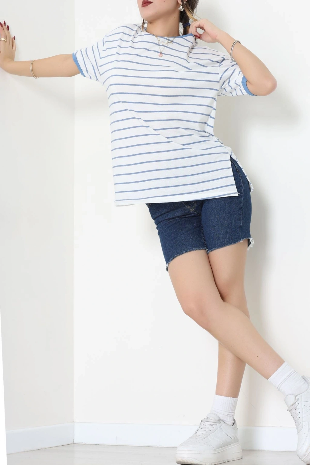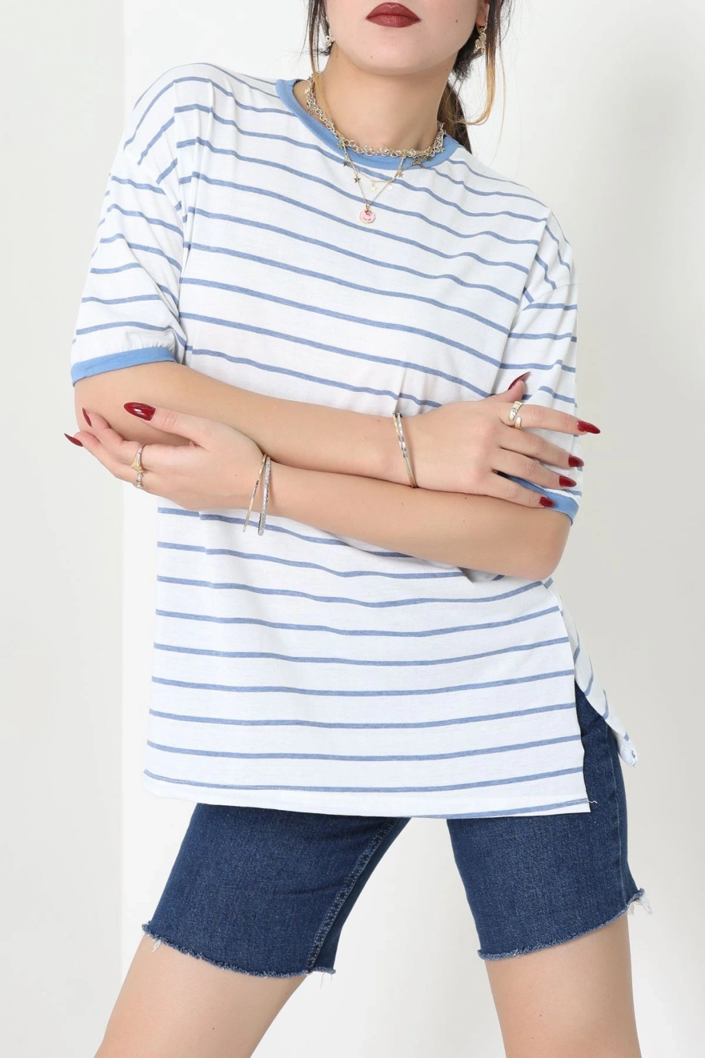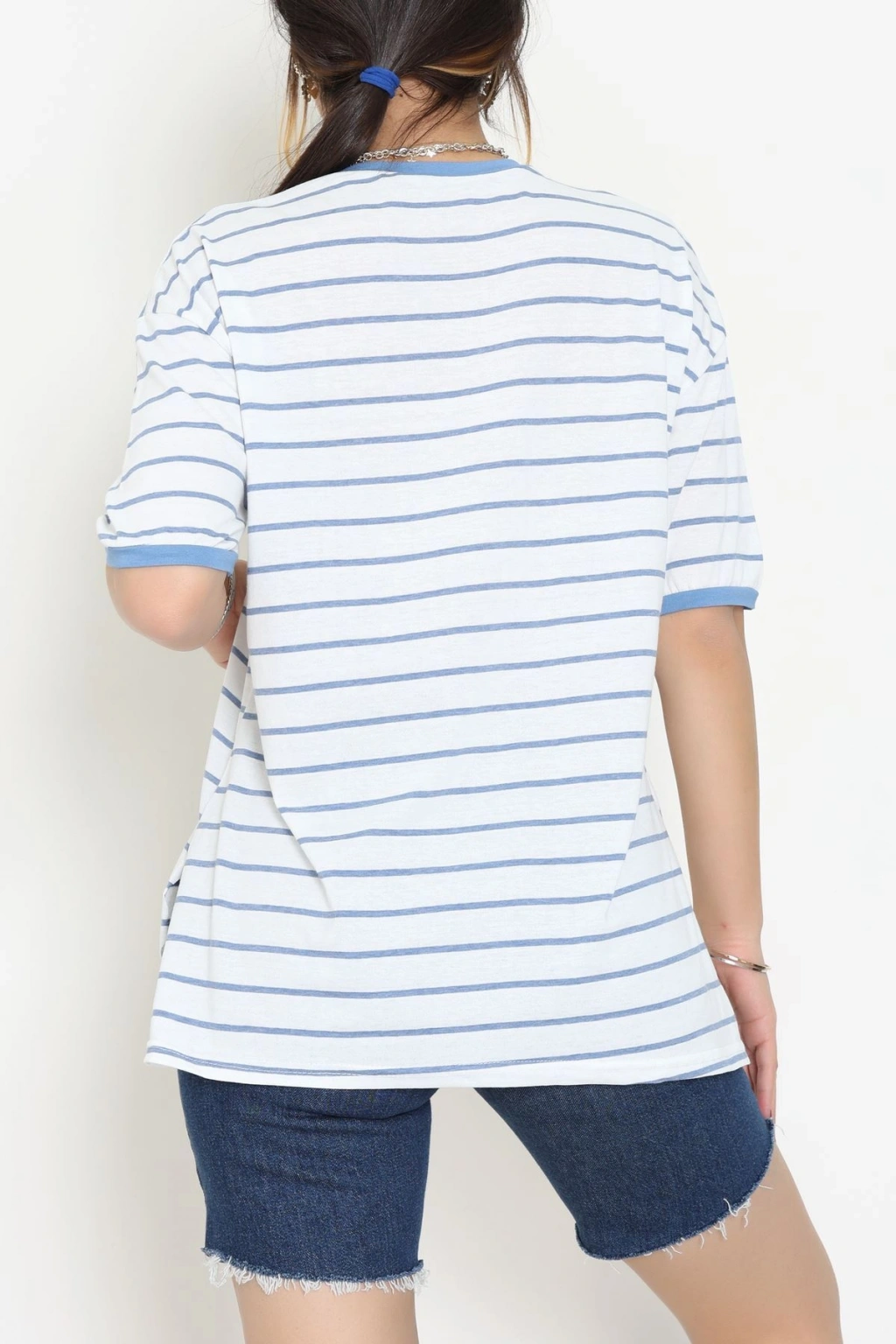 Bisiklet Yaka Çizgili Rejenere Süprem Tişört Beyazmavi - 601.1567.
