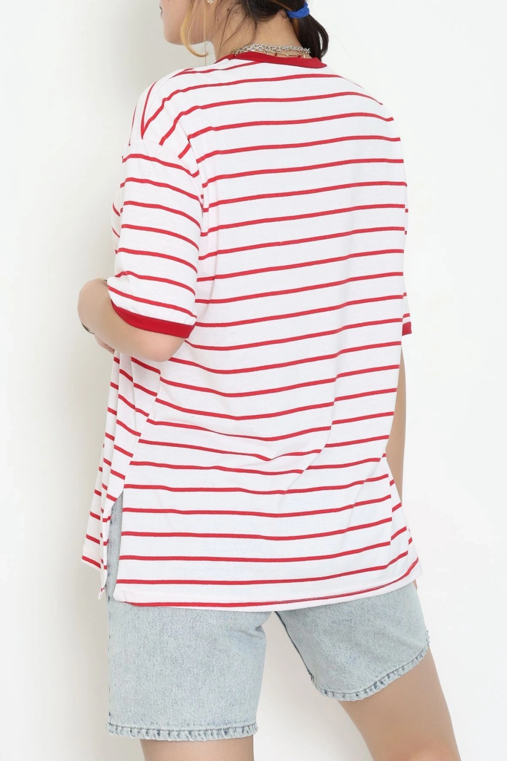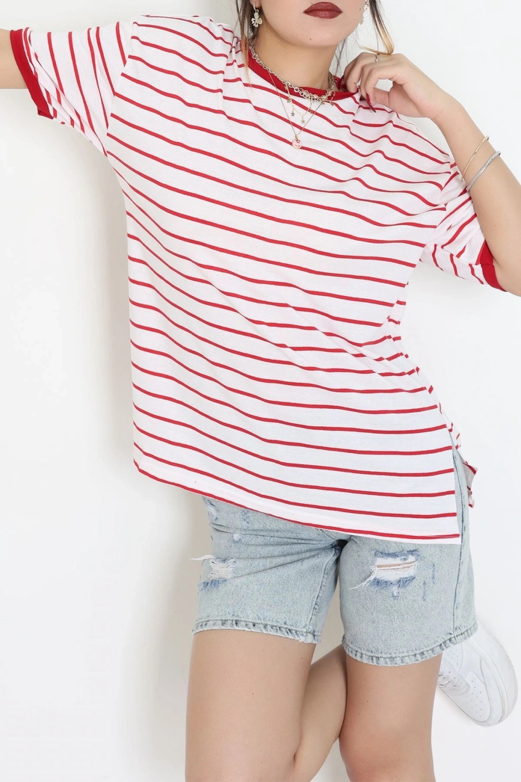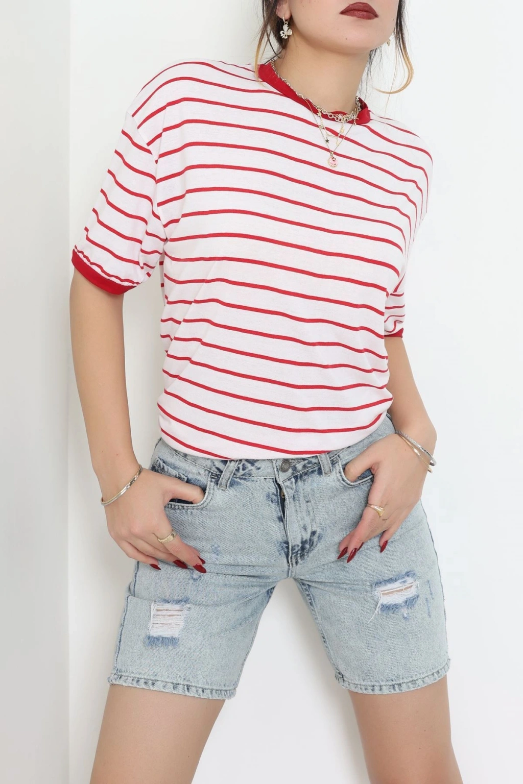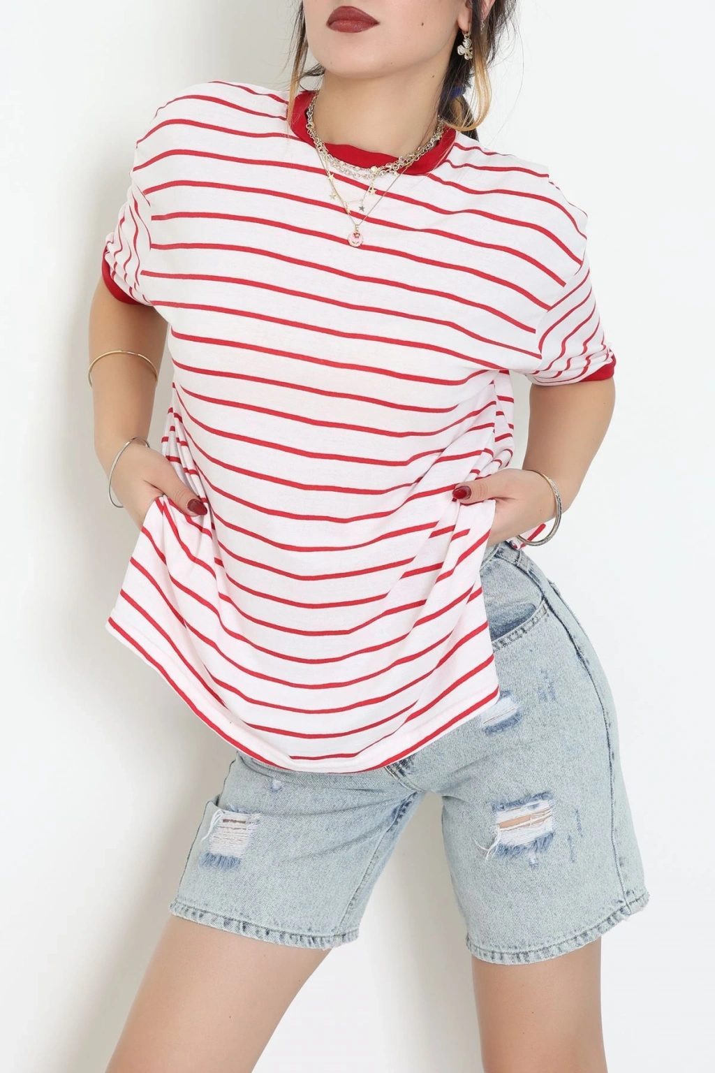 Bisiklet Yaka Çizgili Rejenere Süprem Tişört Ekrukırmızı - 601.1567.