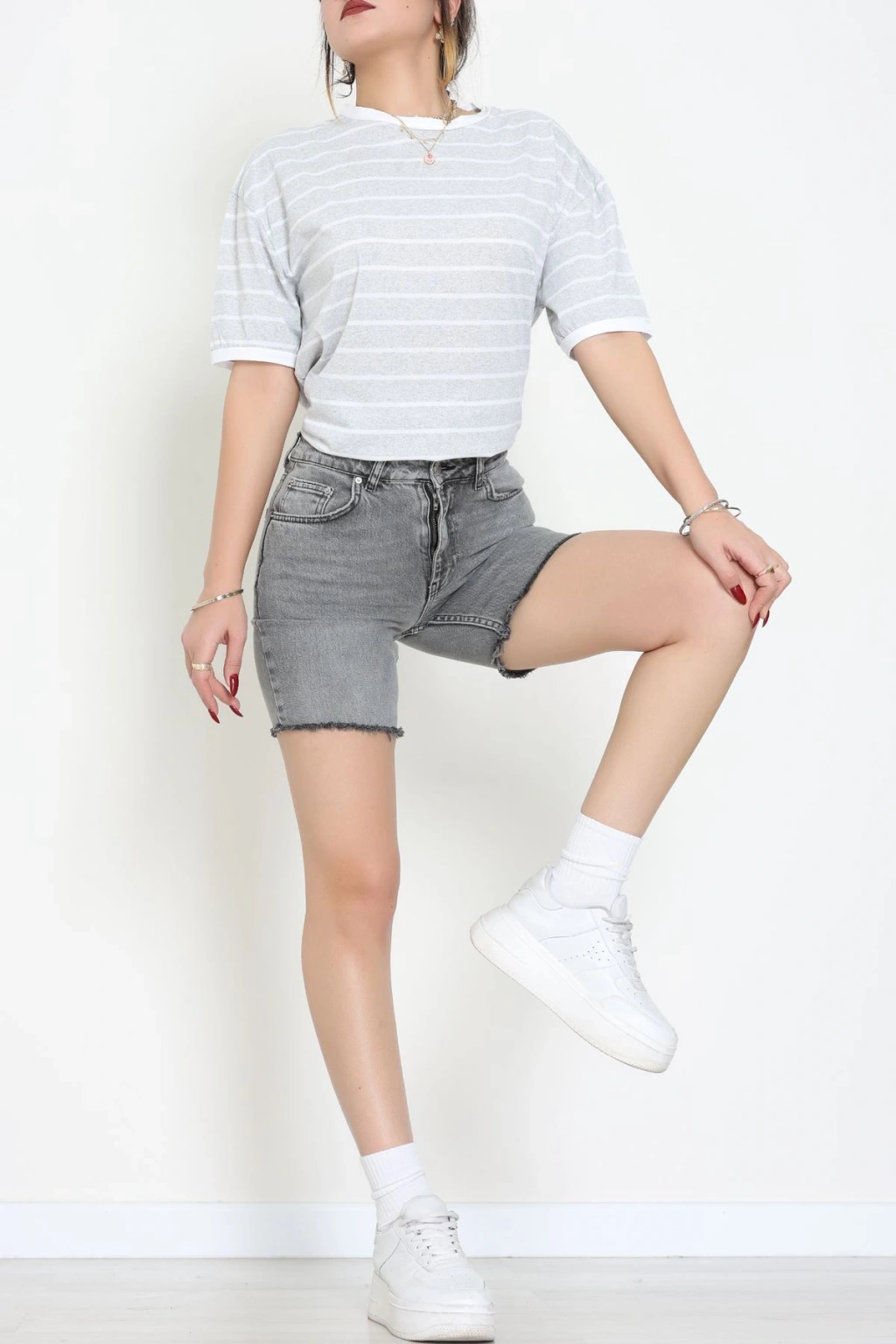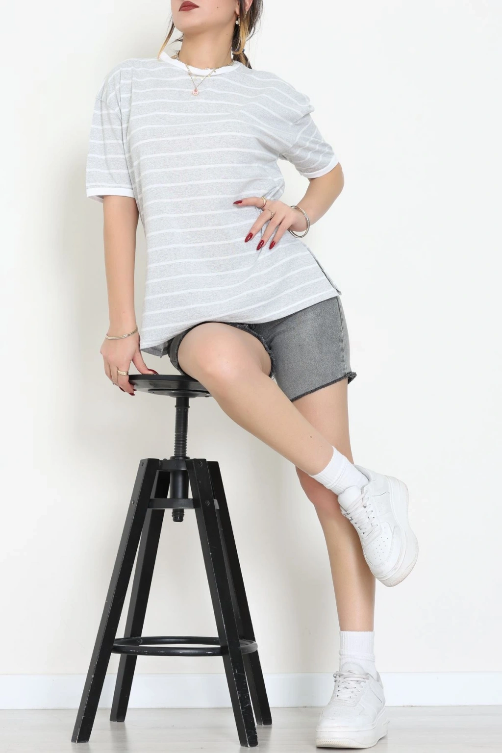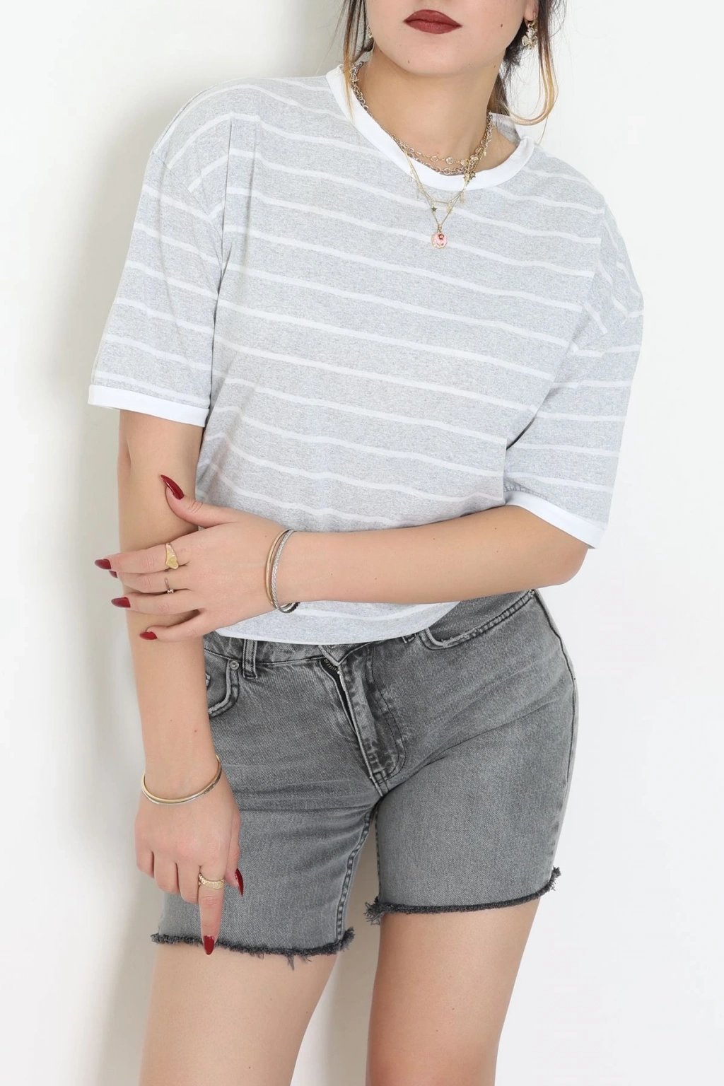 Bisiklet Yaka Çizgili Rejenere Süprem Tişört Gribeyaz - 601.1567.