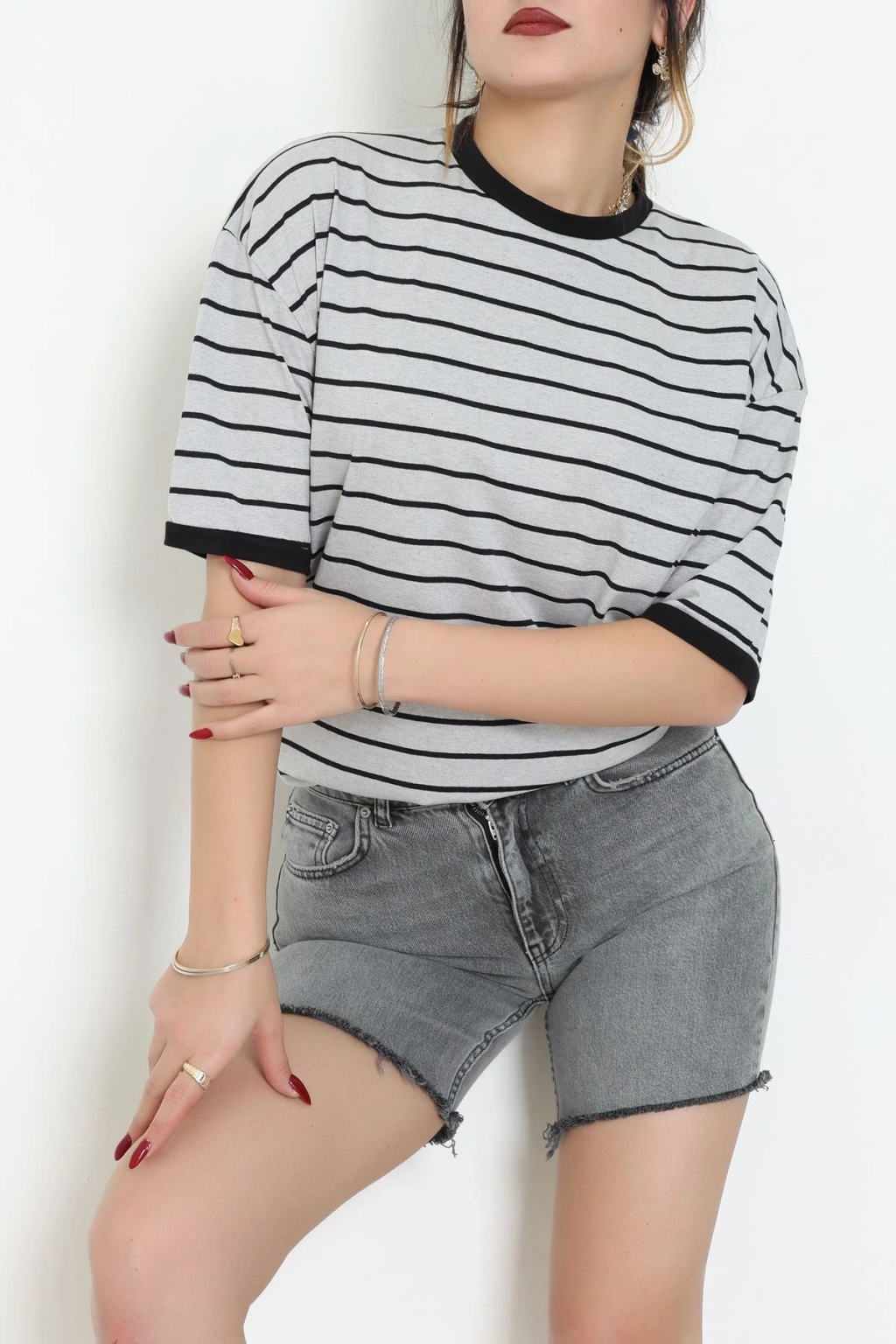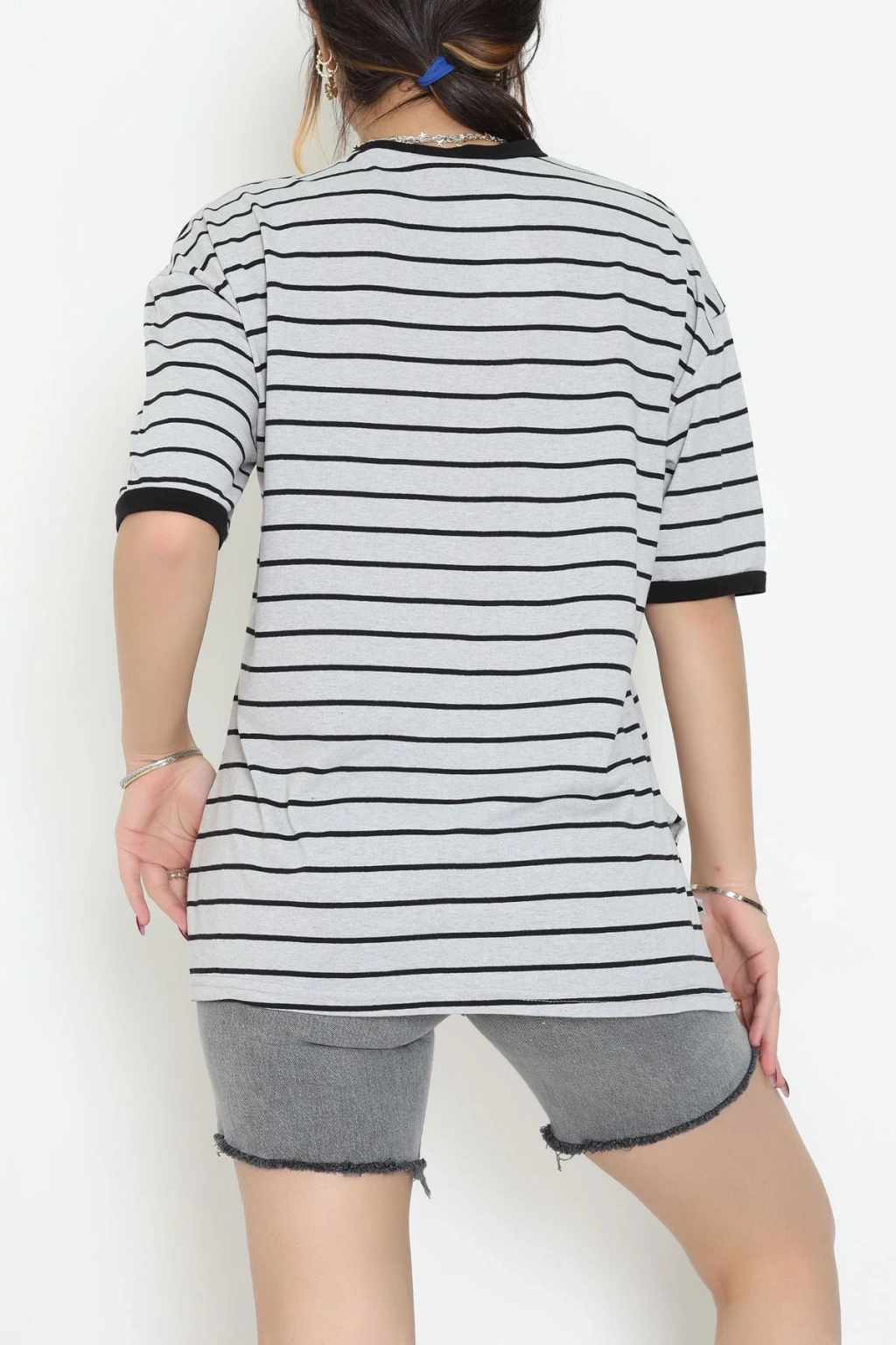 Bisiklet Yaka Çizgili Rejenere Süprem Tişört Grisiyah - 601.1567.