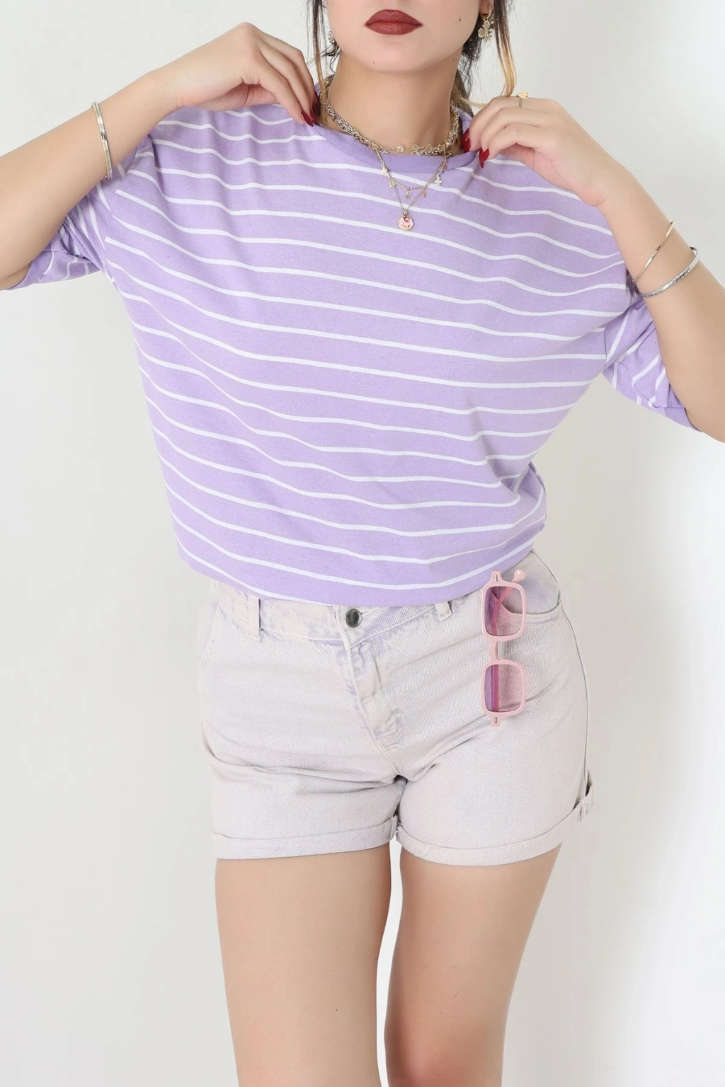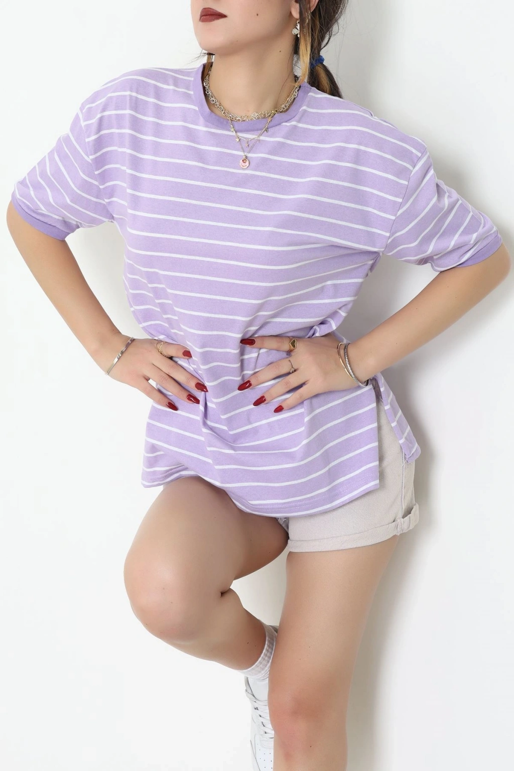Bisiklet Yaka Çizgili Rejenere Süprem Tişört Lilabeyaz - 601.1567.