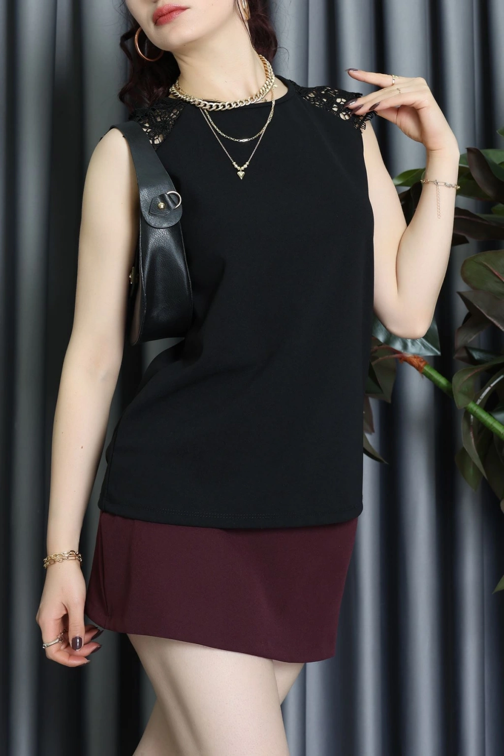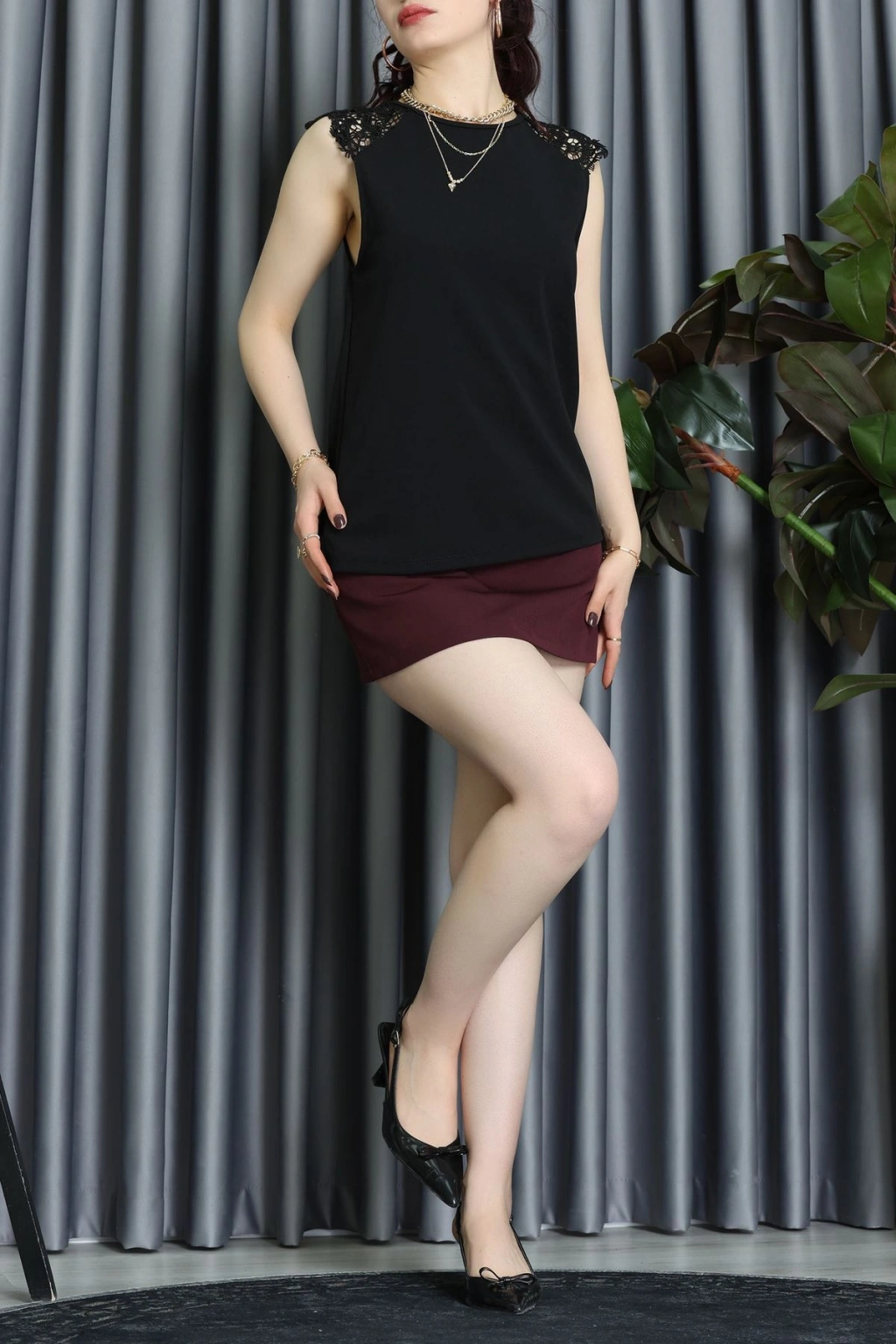 Bisiklet Yaka Omuz Dantel Detay İthal Krep Bluz Siyah - 61642.1256.