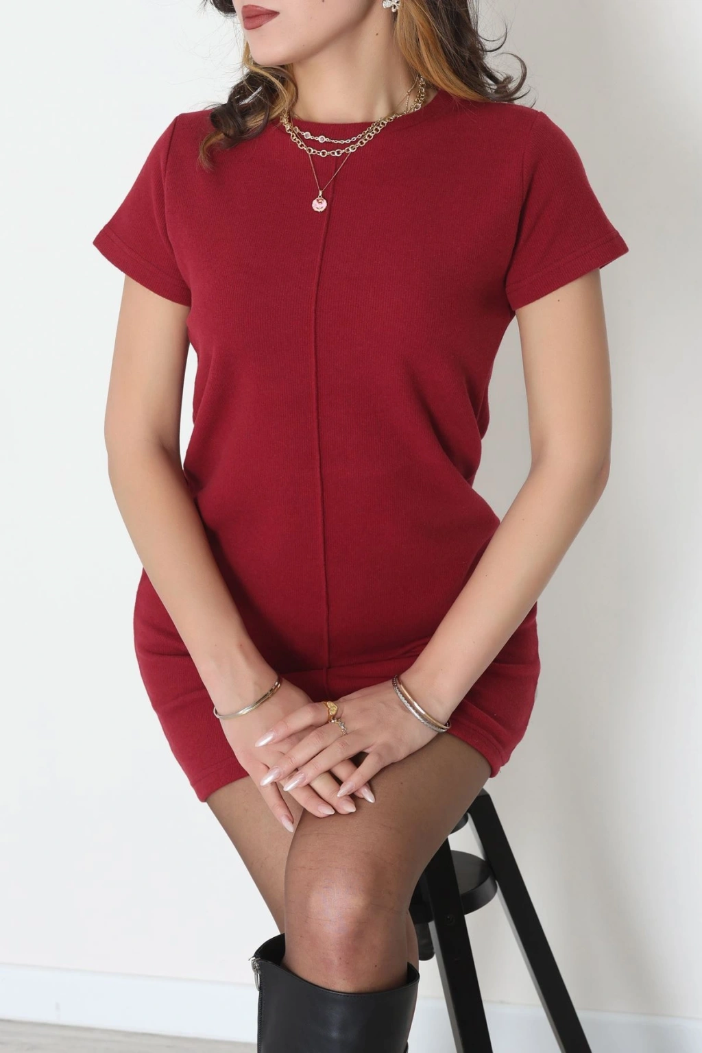 Dik Yaka İthal Krep 11 Parça Mini Elbise Bordo - 70816.1592.