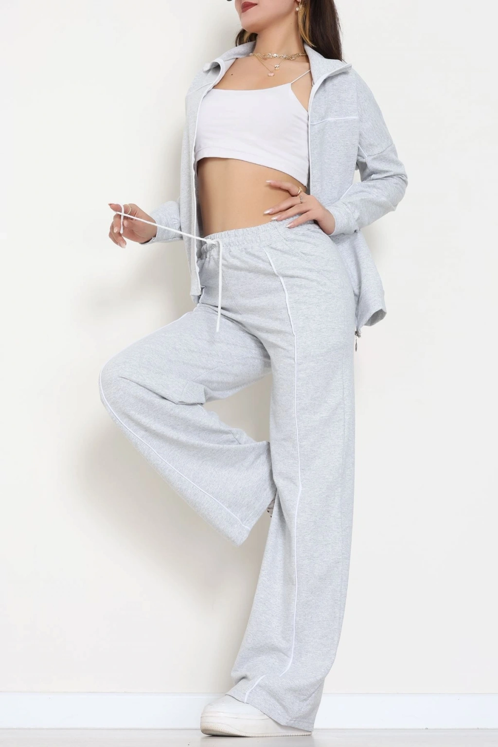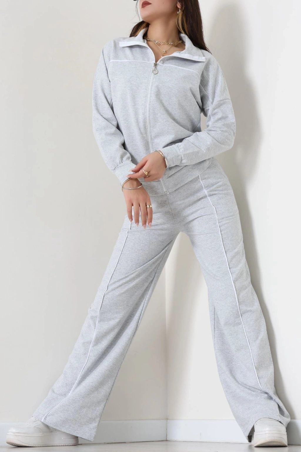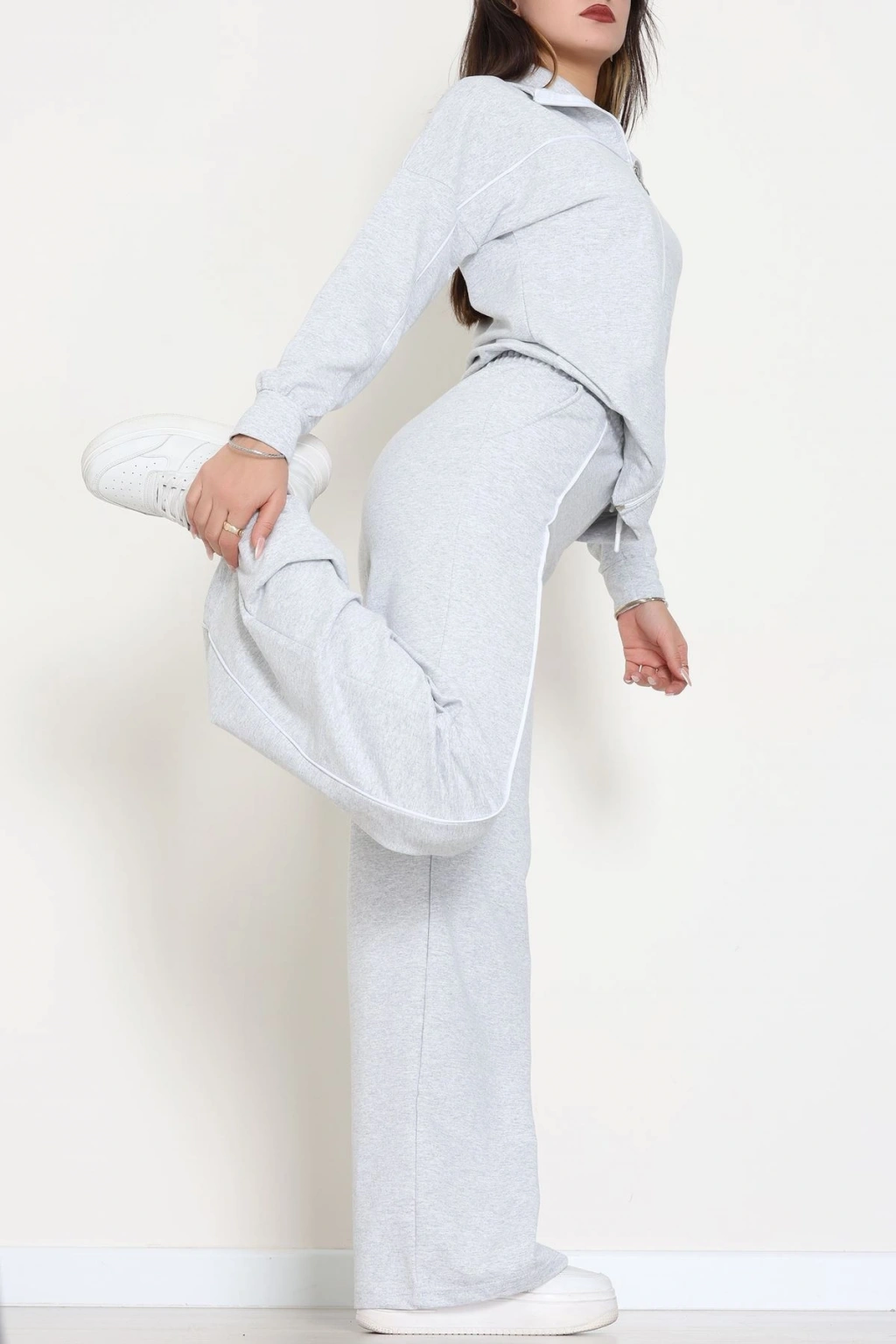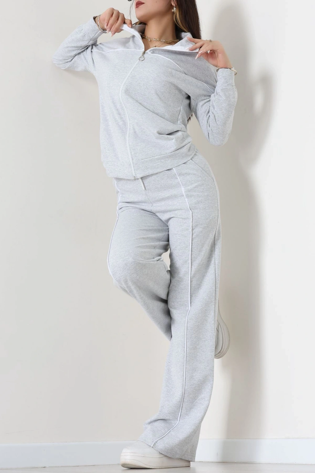 Biyeli Dik Yaka 2 İplik Eşofman Takımı Gri - 40030.1857.