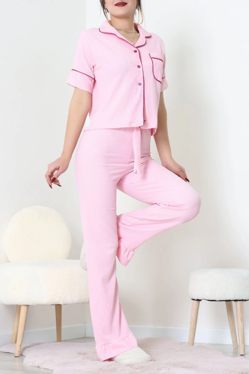 Süet Düğmeli Pijama Takımı Pembe - 31876.1049.