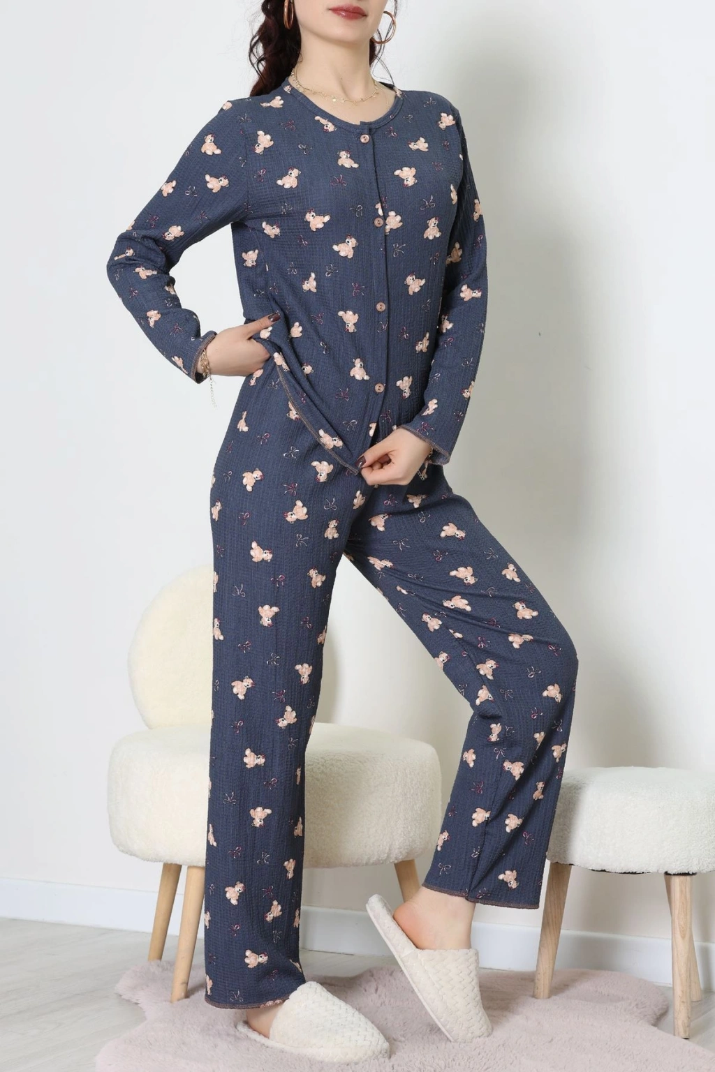 Süet Düğmeli Pijama Takımı Füme - 52179.2124.
