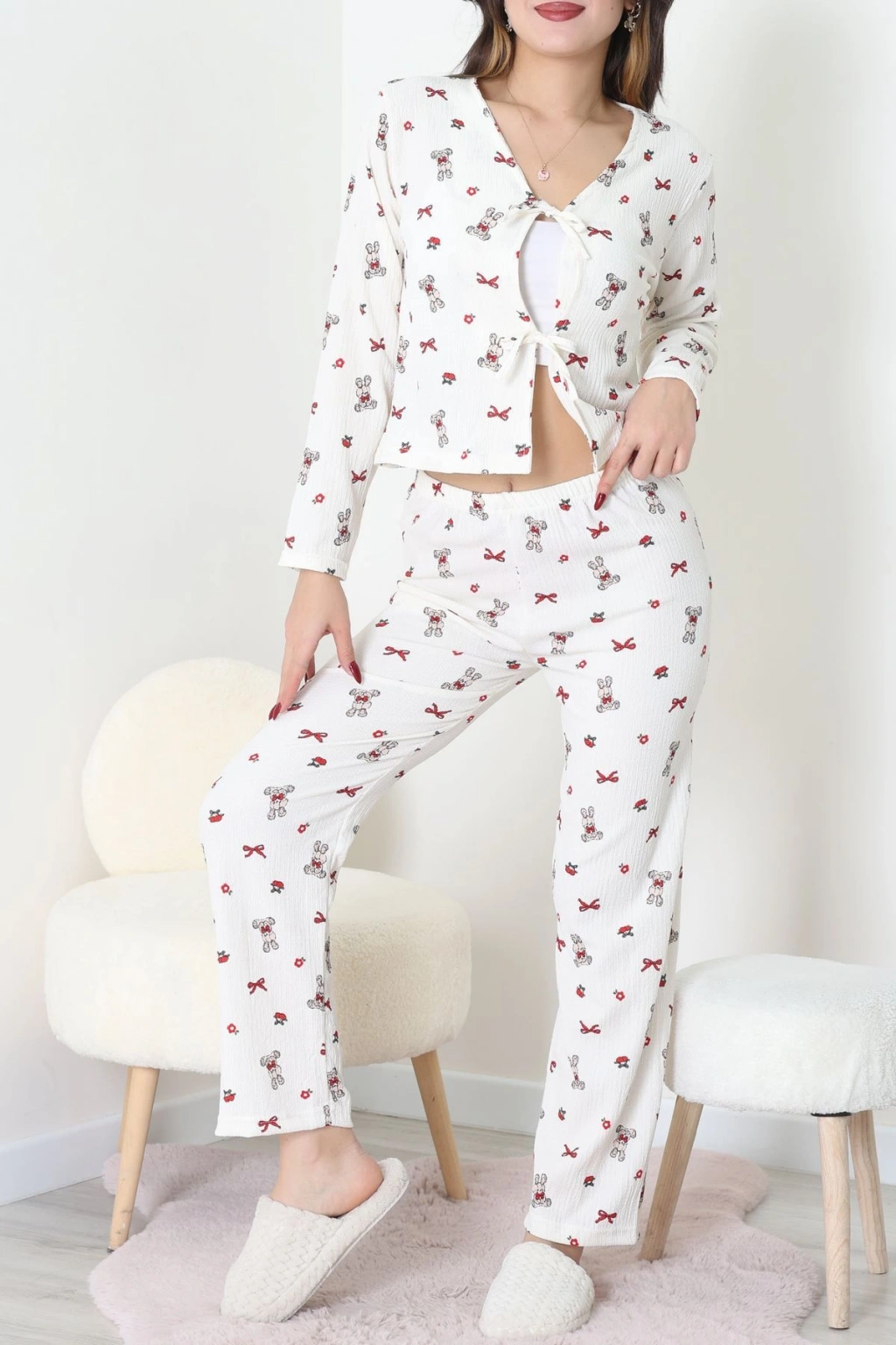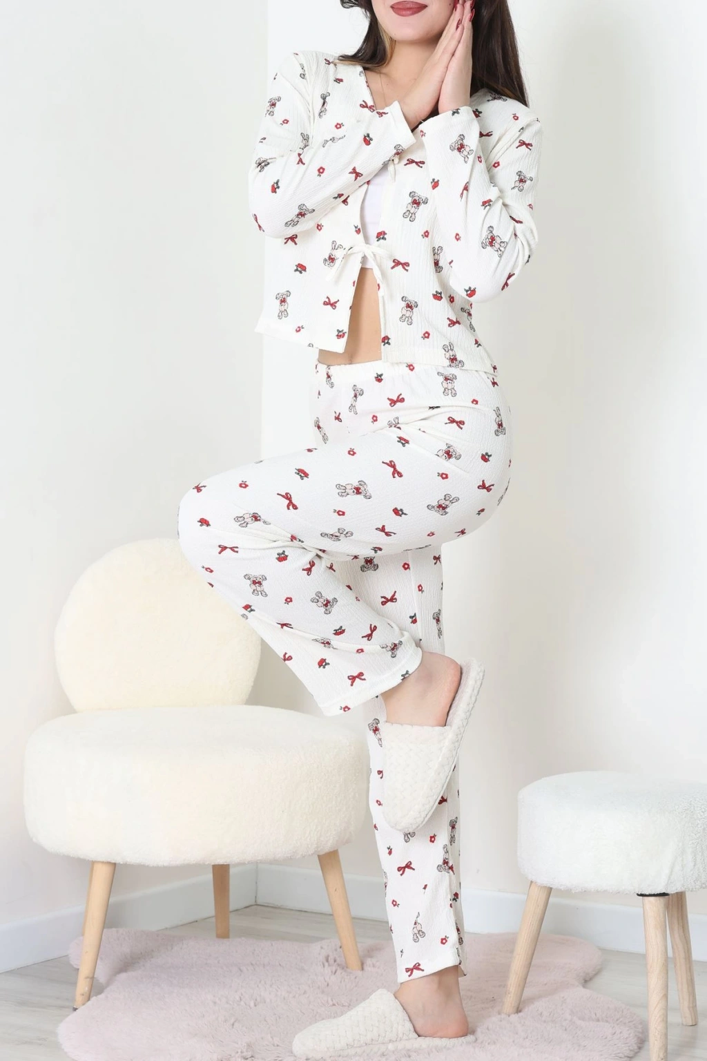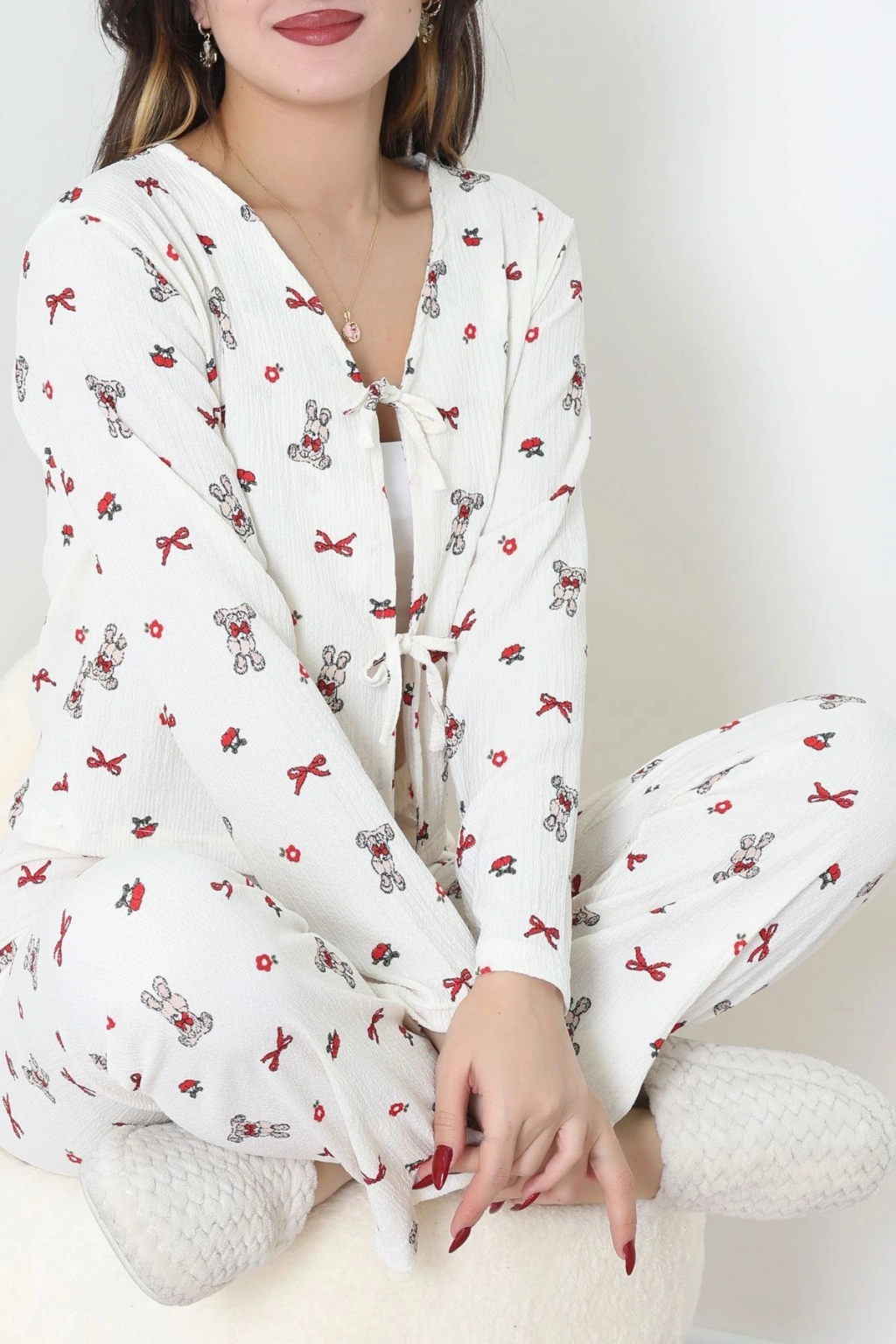 Süet Düğmeli Pijama Takımı Kırmızı - 31876.1049.