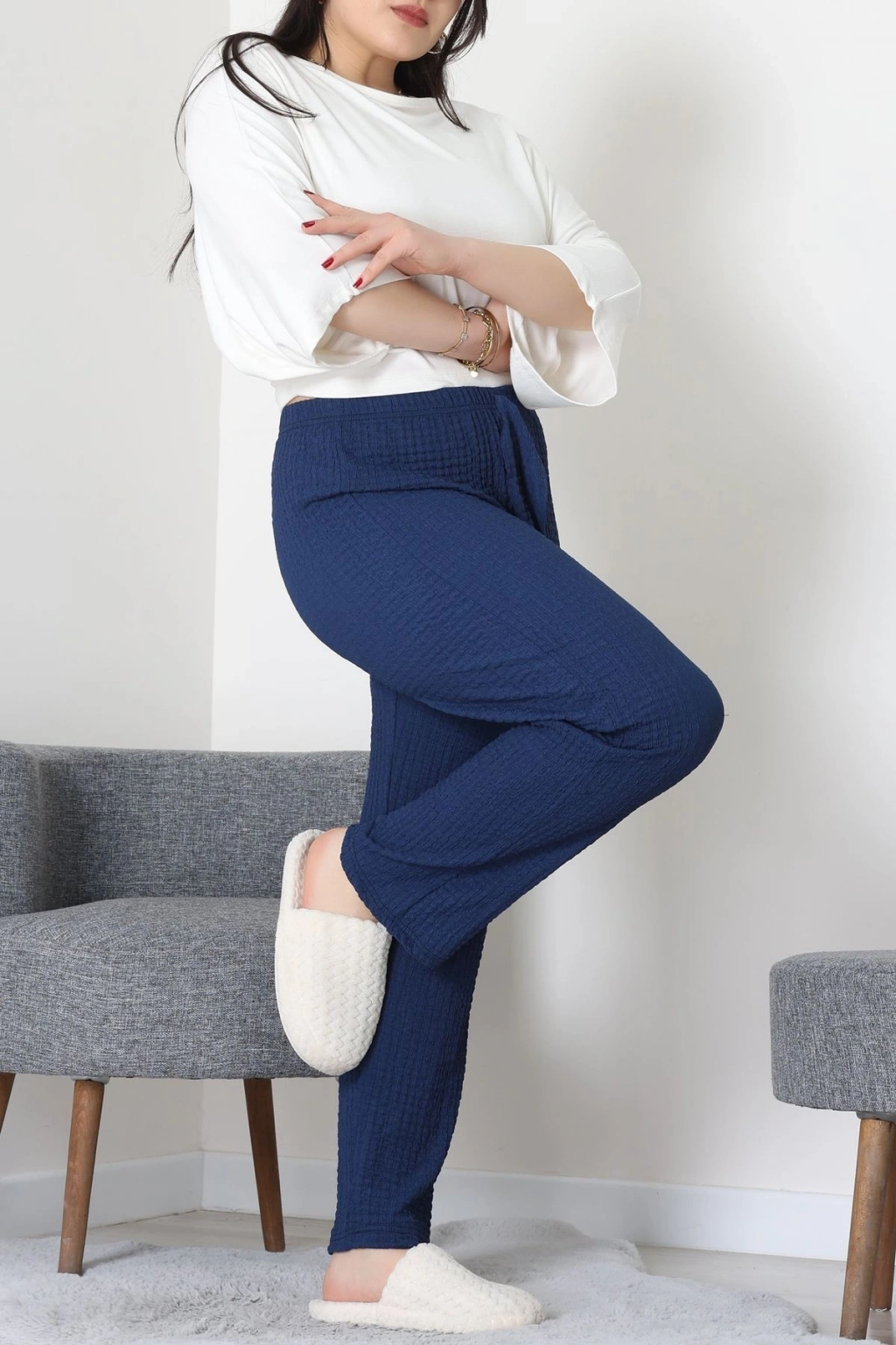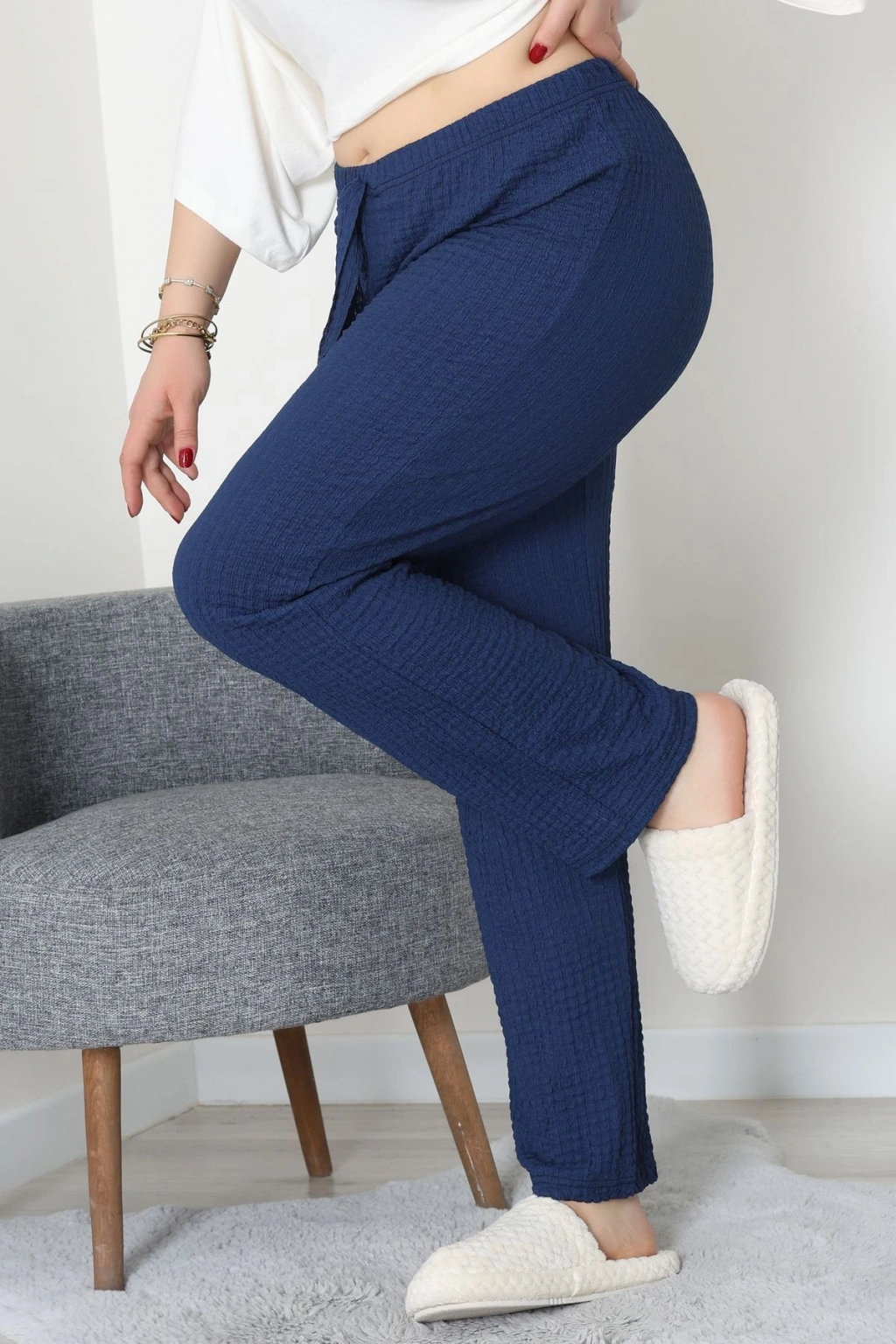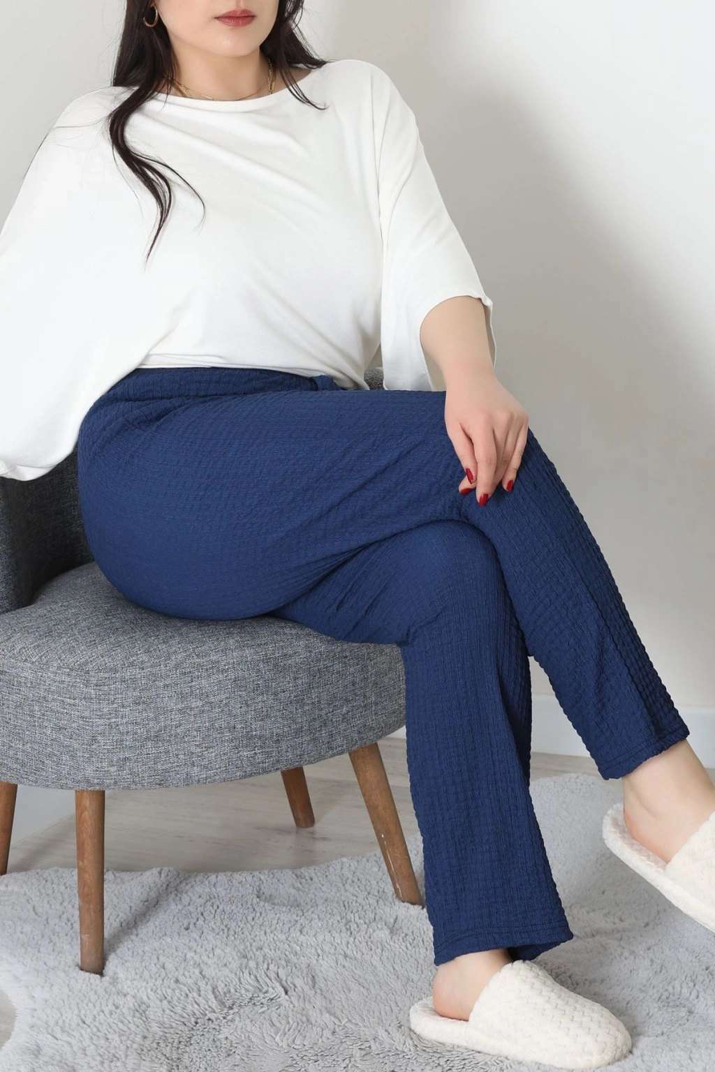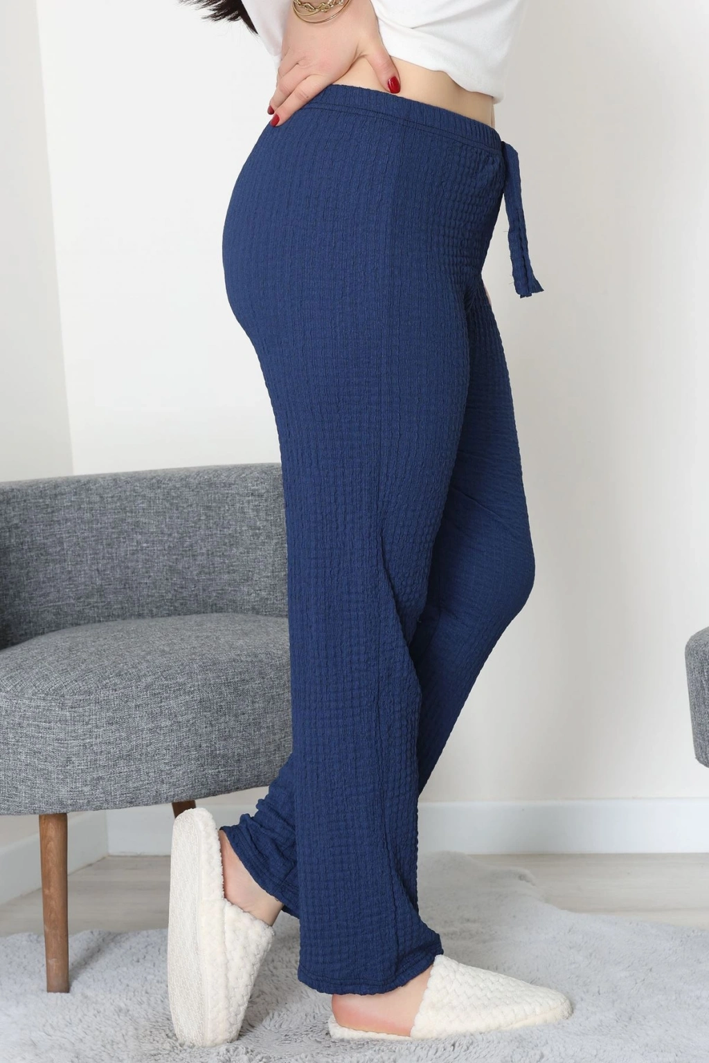 # Büyük Beden Bürümcük Pijama Altı ## Şık ve Rahat Tercih Rahatlığı ve şıklığı bir arada sunan bu **büyük beden bürümcük pijama altı**, günün yorgunluğunu atmak için idealdir. Vücuda dost %95 pamuk ve %5 elastan karışımı sayesinde üstün konfor sunan bu parça, esnek yapısıyla her hareketinize uyum sağlar. Lacivert rengi ve **yüksek bel** kesimiyle bu büyük beden bürümcük pijama altı, rahatlık ve estetiği bir araya getiren bir tasarımdır. Dokulu **bürümcük kumaş** yapısıyla dikkat çeken bu model, cilde nefes aldıran ve terletmeyen özellikleriyle dört mevsim konfor sunar. Geniş paça kesimi, bacaklarda ferah bir his bırakırken, esnek yapısı ev giyiminde konfor arayanlar için ideal bir seçenektir. Kaliteli malzemesi ve işçiliğiyle bu tasarım, uzun süreli kullanım vadeden ekonomik bir seçenektir. Hemen sepete ekleyin.