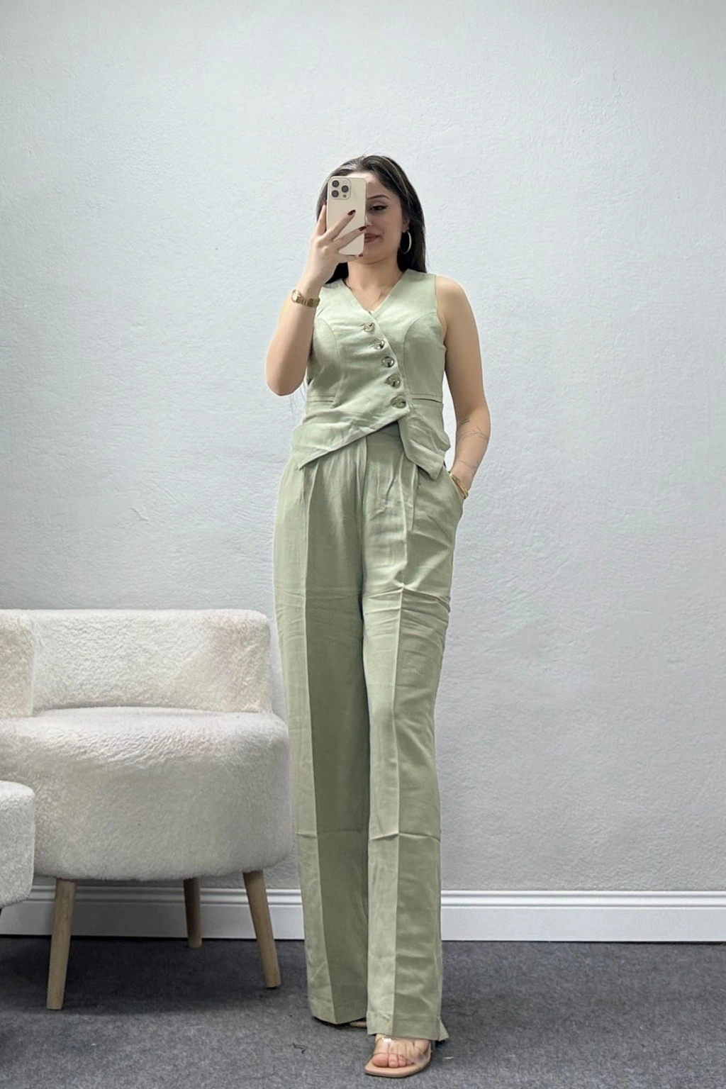 # Haki Çapraz Düğmeli Yelekli Takım ## Zarif Kesim ve Keten Konforu Bu nefes alan kumaşa sahip **yelekli takım** modeli, sıcak havalarda ferahlık sağlayan pamuklu dokusu ve modern haki rengi ile öne çıkıyor. Tasarımın üst kısmındaki çapraz düğme detayları bu parça için asimetrik ve özgün bir hava oluştururken, astarlı yapısı kullanım konforunu artırıyor. Alt parçada kullanılan dökümlü keten pantolon, hareket özgürlüğü sunan geniş kesimiyle dikkat çekiyor. Şık ve rahat bir **keten yelekli takım** arayanlar için bu tasarım konforlu bir kullanım vaat ediyor. Doğal pamuklu ipliklerden üretilen modelimiz, cildinizin hava almasına yardımcı olarak gün boyu terlemeyi önleyen bir yapı sunar. Modelin ön kısmında yer alan çapraz yerleşimli sıralı düğmeler, tasarımı sıradan yeleklerden ayırarak sofistike bir görünüm kazandırır. Dayanıklı dikiş yapısı ve solmaya dirençli haki tonu sayesinde bu **çapraz düğmeli yelek** ve pantolon ikilisi uzun ömürlü bir deneyim sağlar. Kaliteli materyallerle hazırlanan bu set, bütçe dostu yapısıyla öne çıkan tam bir fiyat performans ürünüdür. Satın almak için hemen sepete ekleyin.