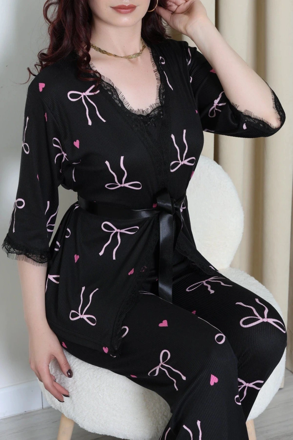 # Siyah Üçlü Kadın Pijama Takımı ## Dantel Detaylı ve Konforlu Tasarım Yumuşak dokusuyla gece boyunca rahatlık sunan bu **kadın pijama takımı**, şıklığı ve fonksiyonelliği bir araya getiren özel bir settir. Siyah zemin üzerine yerleşen pembe fiyonk desenleri, bu tasarımın enerjik ruhunu ön plana çıkarıyor. Esnek yapısıyla hareket özgürlüğünü kısıtlamayan bu parça, ev giyiminde konforu odağına alıyor. **Üçlü pijama takımı arayanlar için ideal** olan modelimiz, hem şık bir sabahlık hem de ip askılı iç takımdan oluşur. Fitilli kumaş yapısı sayesinde cildinizde pürüzsüz bir his bırakan bu **üçlü pijama takımı**, dayanıklı dokusuyla uzun süreli kullanım imkanı tanır. Yaka ve kol kısımlarında bulunan zarif siyah dantel işlemeler, modelin görsel derinliğini artırarak feminen bir dokunuş ekler. Bel kısmındaki saten kuşak detayı, silüetinizi dilediğiniz gibi ayarlamanıza olanak tanıyarak kullanım kolaylığı sağlar. Kaliteli materyalleri şık desenlerle birleştiren bu kadın pijama takımı, oldukça ekonomik bir seçenek olarak dikkat çekmektedir. Satın almak için hemen sepete ekleyin.