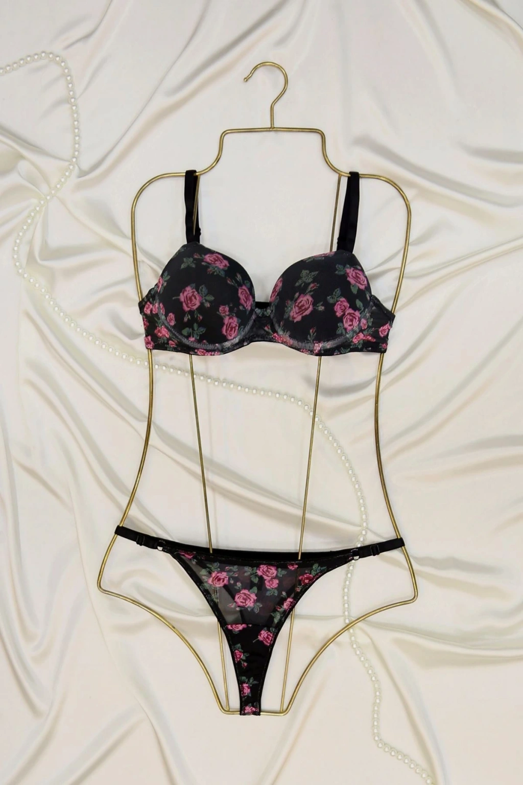 Çiçek Baskılı Dikine Flok Çizgili Takım Dolu Siyah - 2565.1783.