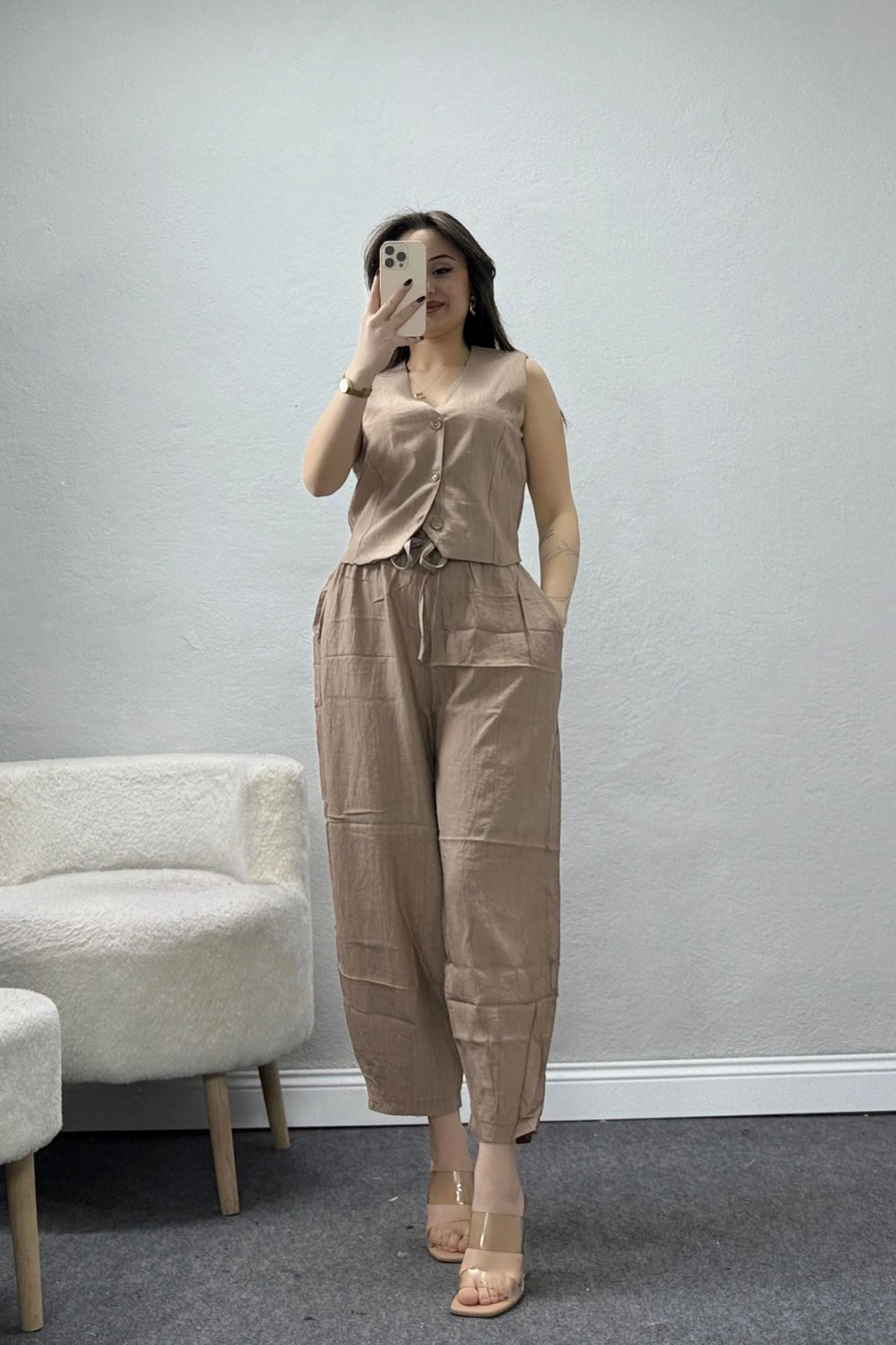 # Vizon Yelekli Takım ## Çilek Kumaş ve Salaş Kesim Detayları Yumuşak dokusuyla öne çıkan bu **vizon yelekli takım**, gün boyu hareket özgürlüğü sunan dökümlü yapısı sayesinde konforu en üst seviyeye taşır. Doğal görünümlü çilek kumaş kullanılarak titizlikle hazırlanan bu parça, nefes alan dokusuyla teninize her an nazik bir dokunuş sergiler. Rahat pantolonu ve ön kısmında yer alan düğme detaylı yeleğiyle dikkat çeken bu vizon yelekli takım, modern silüetiyle sadeliği estetik biçimde yansıtır. Bu özel tasarım, esnemeyen tok kumaş yapısı ve sağlam dikişleri sayesinde formunu uzun süre koruyarak her zaman özenli bir görünüm sergilemenizi vadeder. Bel kısmındaki ayarlanabilir bağcık detayı ve geniş paça yapısı, bu **vizon kadın takım** modeline hem pratik kullanım hem de farklı bir hava katar. Zarif bir V yaka kesimine sahip olan kolsuz yelek parçası, gövdeyi dengeli bir şekilde sararken pantolonun derin yan cepleri kullanım kolaylığı yaratır. **Salaş kesim pantolon** sevenler için ideal bir tercih olan bu özel set, vizon renginin dingin tonlarını kumaşın pürüzlü karakteriyle buluşturur. Dokuma kalitesiyle fark yaratan vizon yelekli takım, kalitesine oranla oldukça uygun fiyatlı ve ekonomik bir seçenektir. Satın almak için hemen sepete ekleyin.
