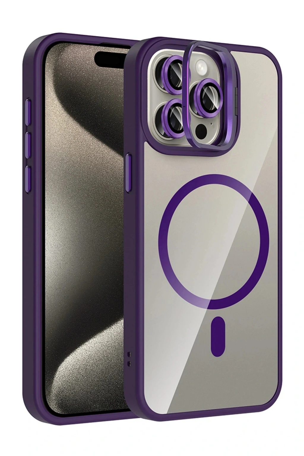 CPT05 Apple iPhone 14 Pro Max Remim Lensli Magsafe Standlı Kapak - Derin Mor