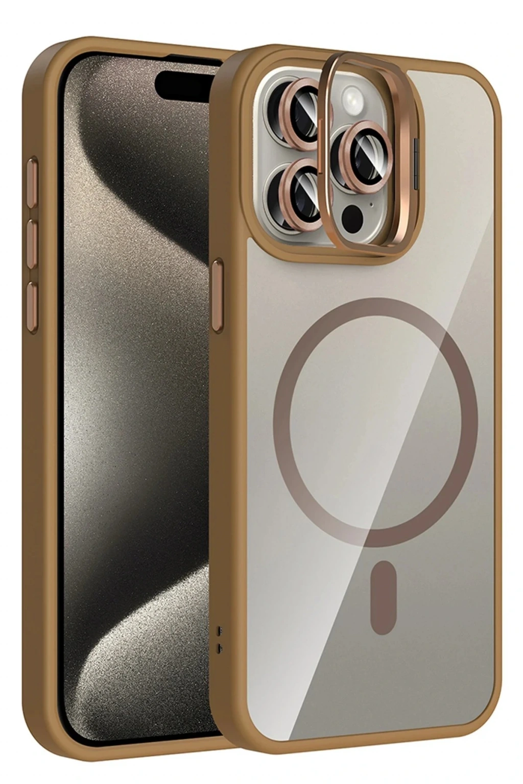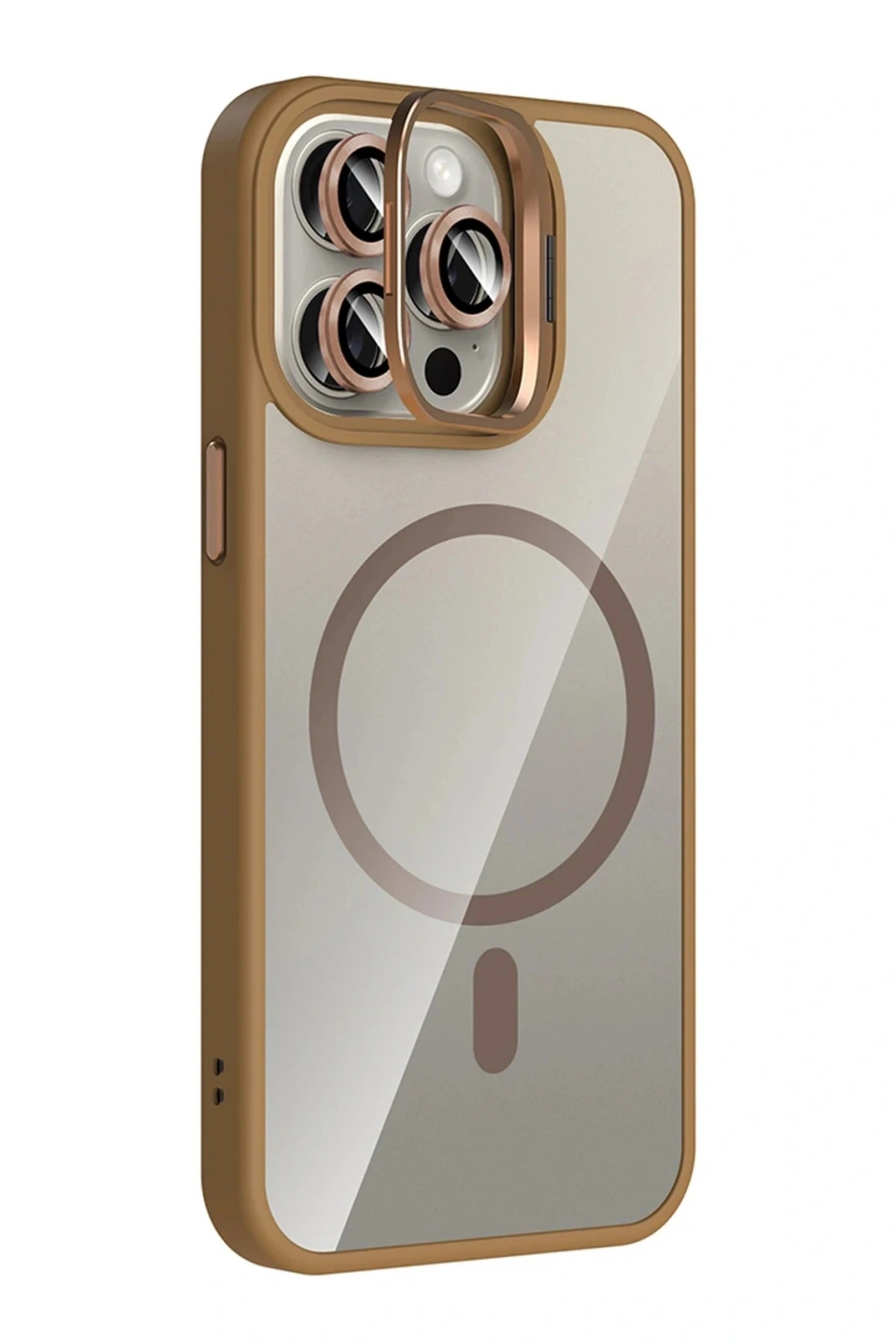 CPT05 Apple iPhone 15 Pro Max Remim Lensli Magsafe Standlı Kapak - Kahverengi