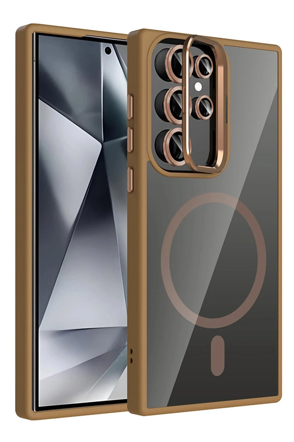 CPT05 Samsung Galaxy S25 Ultra Remim Lensli Magsafe Standlı Kapak - Kahverengi