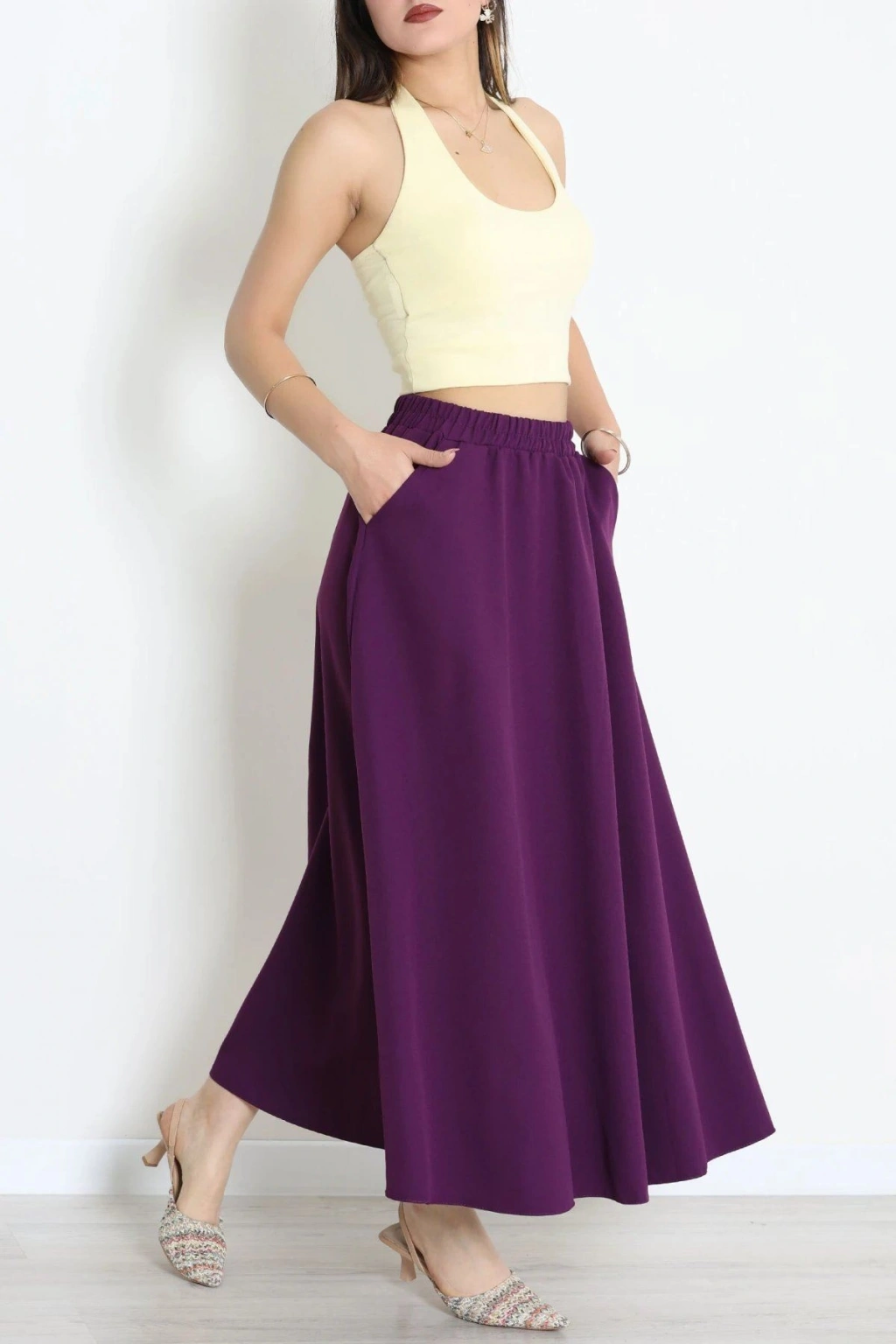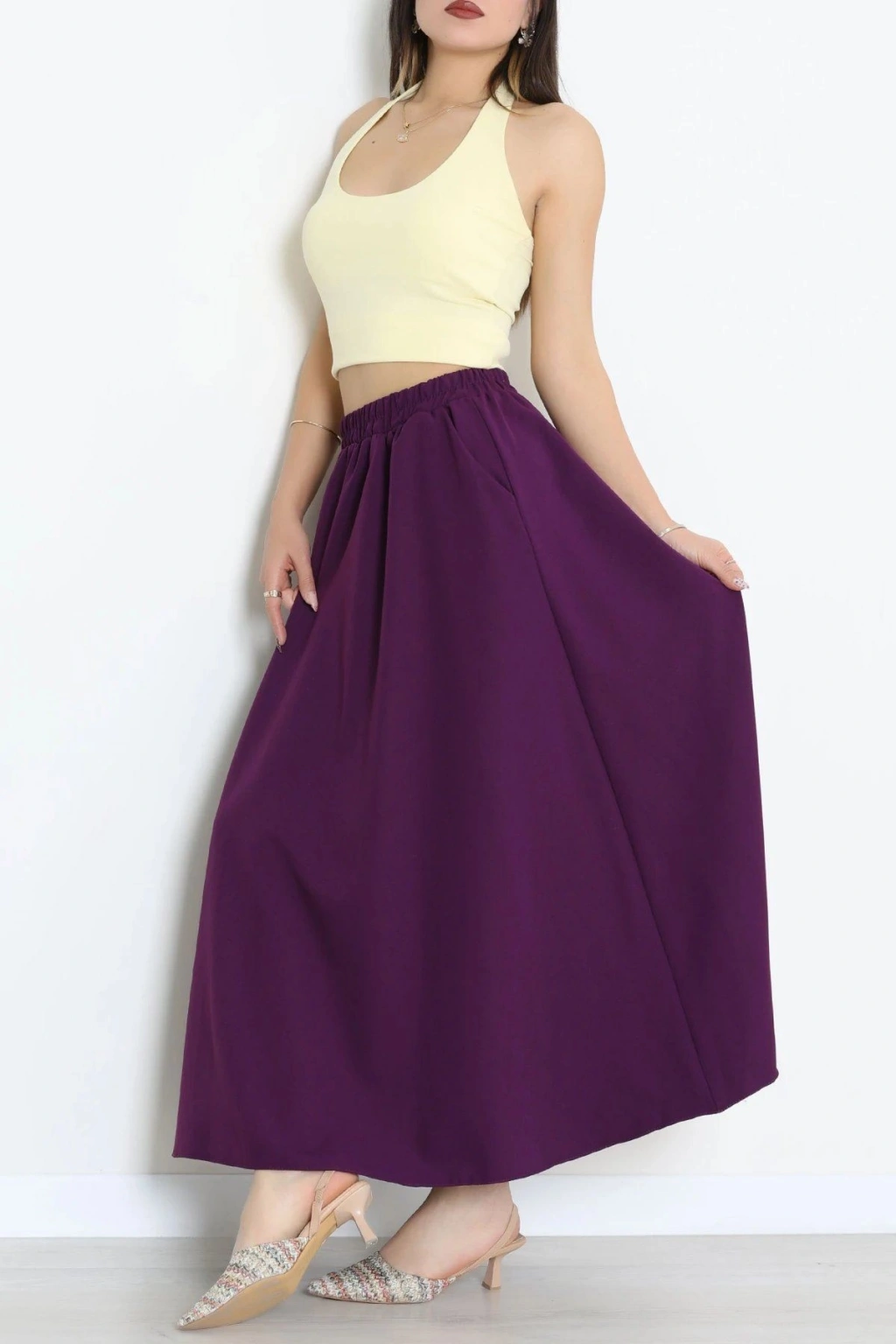 # Mor Dabıl Kumaş Cepli Etek ## Konforlu Tasarım ve Esnek Doku Zarif duruşuyla dikkat çeken bu **dabıl kumaş etek**, gün boyu hareket özgürlüğü sunan esnek yapısıyla ön plana çıkar. Derin mor tonuna sahip bu tasarım, kaliteli dokusu sayesinde uzun süreli kullanımda formunu koruyarak beklentilerinizi karşılar. Bel kısmındaki lastik detayı vücuda tam otururken, yanlarda bulunan işlevsel cepler pratiklik sağlar. **Dabıl kumaş etek** arayışında olanlar için bu parça konforu ve şıklığı bir arada sunan ideal bir seçenektir. Modelimiz, dökümlü kesimi ve tok duruşuyla her adımda zarif bir silüet oluşturmanıza yardımcı olur. Bel bölgesindeki büzgülü lastik yapısı vücudu nazikçe kavrayarak konforlu bir deneyim vadeder. **Esnek kumaş** özelliği, kumaşın gerilmesini önleyerek gün boyu pürüzsüz bir görünüm sergilemesini sağlar. Kaliteli **dabıl kumaş etek** yapısı, bu tasarımın her detayında dayanıklılığını hissettirir. Modern kesimiyle fark yaratan bu **cepli etek**, ekonomik ve tam bir fiyat performans ürünüdür. Satın almak için sepete ekleyin.
