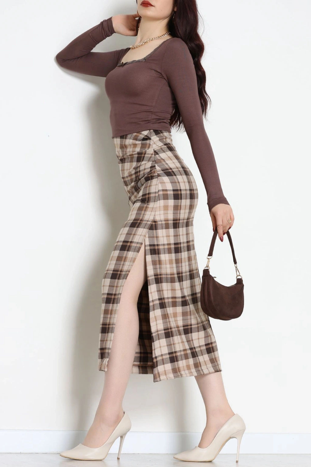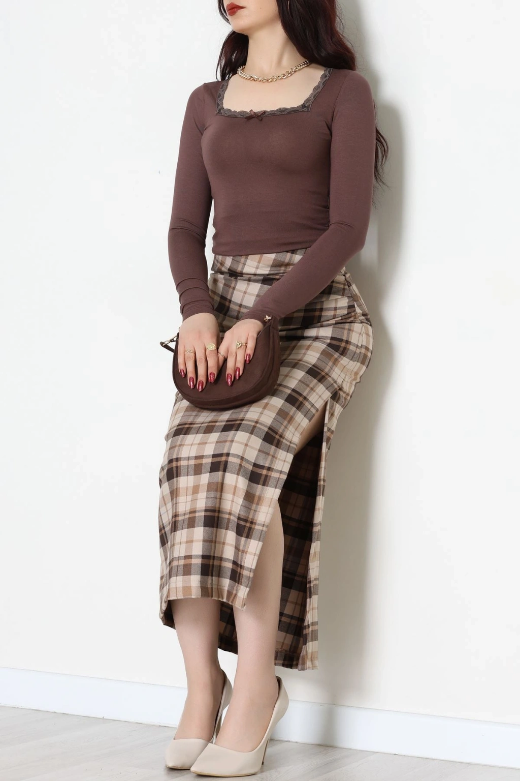 Dantel Detaylı Çerçeve Yaka Viskon Body Kahve - 5505.599.