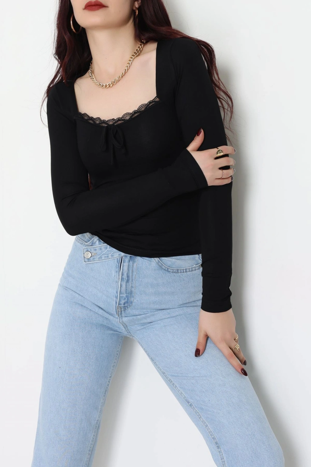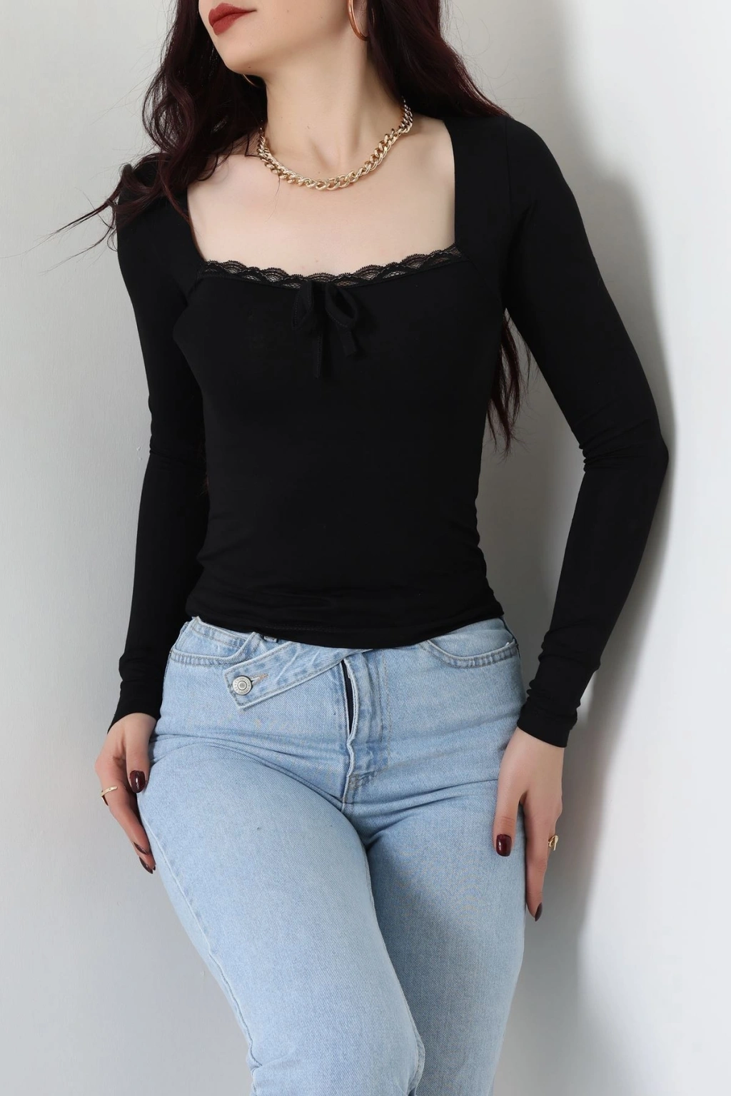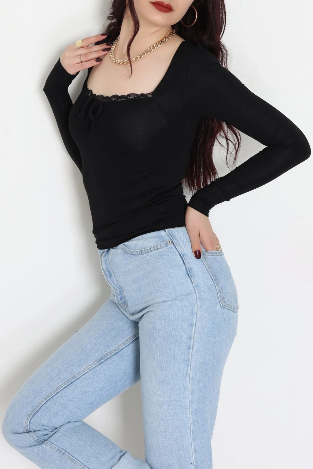 Dantel Detaylı Kare Yaka Viskon Body Siyah - 5504.599.