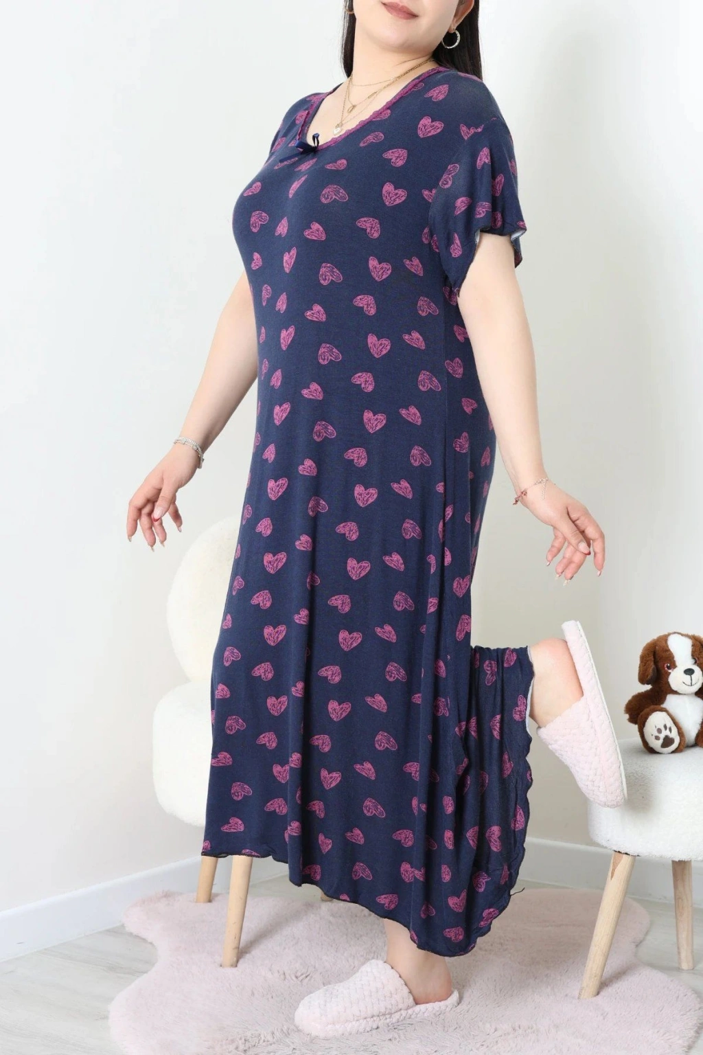 # Rahat Büyük Beden Gecelik Elbise ## Viskon Kumaş ve Dantel Detayları Yumuşak dokusuyla kesintisiz bir uyku deneyimi sunan bu **büyük beden gecelik elbise**, lacivert zemin üzerine pembe kalp desenleriyle enerjik bir görünüm kazanıyor. Bu parça, cildin nefes almasını sağlayan doğal lifli yapısı sayesinde gece boyunca vücut ısınızı dengeler ve ferah hissetmenize yardımcı olur. Viskon liflerinin dökümlü yapısı vücut hatlarını nazikçe sararken ev içindeki hareket özgürlüğünüzü asla kısıtlamaz. **Lacivert gecelik** modelimiz, geniş kesimi ve yumuşak yüzeyiyle konforu ön planda tutan kadınların öncelikli tercihi olmaktadır. Kısa kollu tasarımı ve esnek yapısı ile bu tasarım her vücut tipine zahmetsizce uyum gösteren ergonomik bir formdadır. Yakasındaki zarif dantel işlemesi ve minik fiyonk detayı modele estetik bir hava katarken kumaşın **viskon kumaş** kalitesi serinlik hissi sağlar. Kumaşın likralı esnekliği sayesinde uyku esnasında hiçbir baskı veya rahatsızlık hissetmeden büyük beden gecelik elbise konforunu yaşayabilirsiniz. Büyük beden gecelik elbise arayanlar için ideal olan bu tasarım, dayanıklı dokusuyla uzun süreli kullanım vadeden fiyat performans ürünü kategorisindedir. Siparişinizi hemen oluşturun.