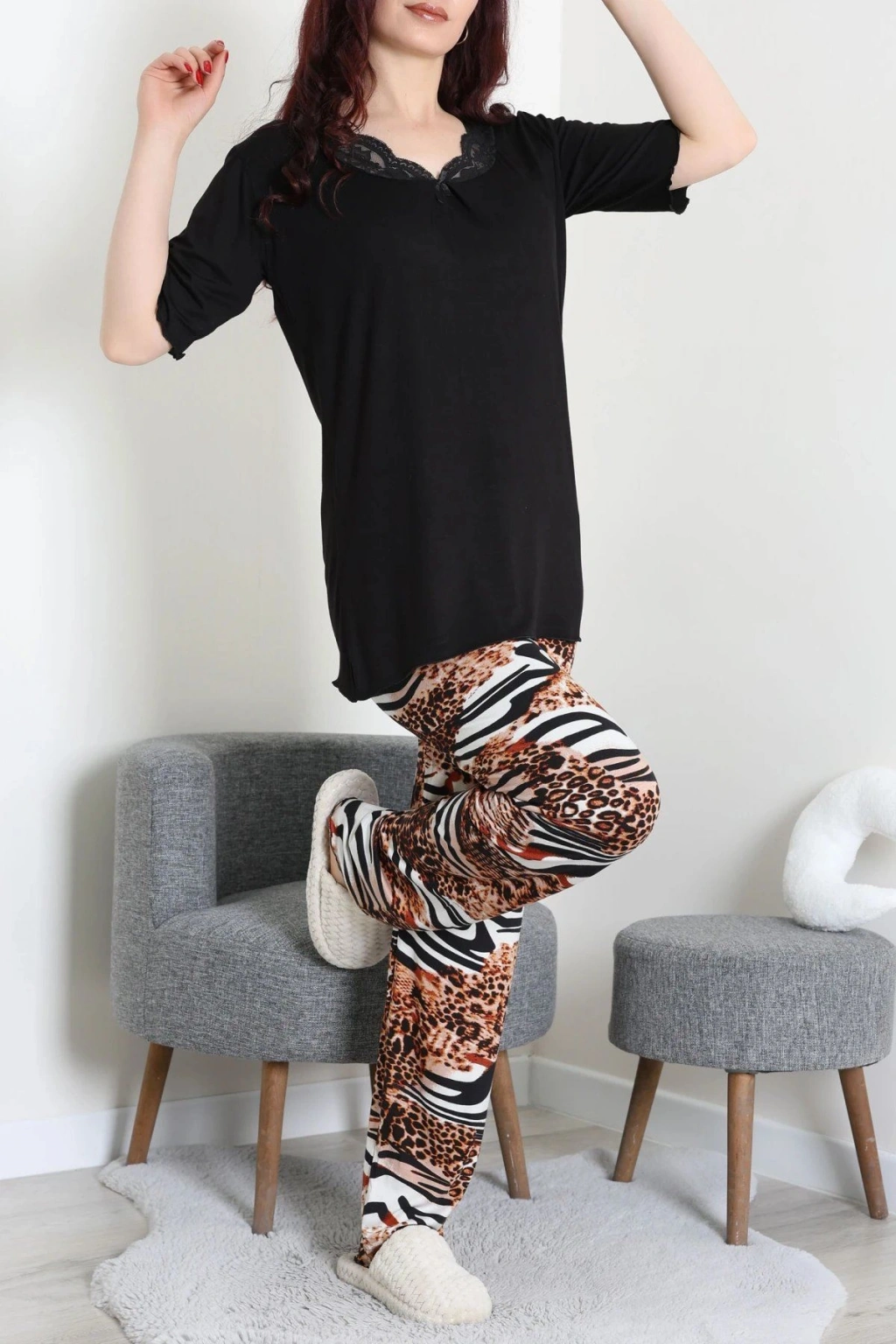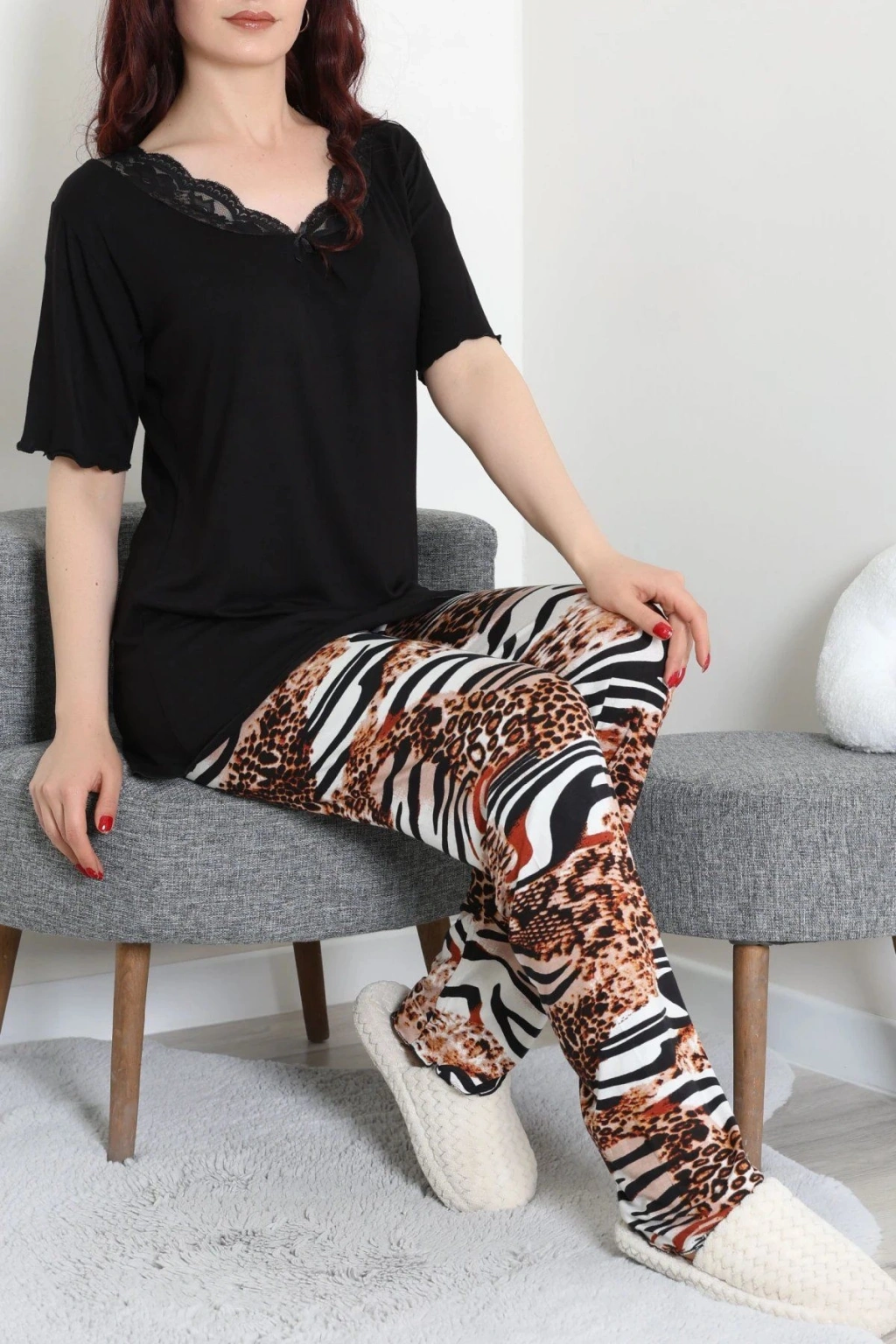 # Dantelli Pijama Takımı ## Pamuklu Doku ve Estetik Detaylar Yumuşak dokusuyla gece boyunca konfor sağlayan bu **kadın pijama takımı**, cildin nefes almasına yardımcı olan kaliteli milan kumaştan üretilmiştir. Bu parça, siyah üst kısmındaki zarif dantel işlemesiyle şıklığı ve rahatlığı bir araya getiren estetik bir yapı sunar. **Dantelli pijama** arayışında olanlar için ideal bir seçenek olan bu tasarım, esnek lifleri sayesinde hareket özgürlüğünü kısıtlamadan vücut hatlarına uyum sağlar. Rahat kesimli **kadın pijama takımı** modelimiz, pamuklu dokusuyla dinlenme saatlerini her mevsim daha keyifli hale getirir. V yakasında yer alan ince işçilikli siyah dantel detayı, bu tasarımı klasik modellerden ayırarak sofistike bir dokunuş kazandırır. Alt parçada kullanılan leopar ve zebra desenli canlı grafikler, üst kısmın sadeliğiyle dengeli bir kontrast oluşturur. **Pamuklu pijama takımı** özelliği taşıyan milan kumaşı, yıkama sonrası formunu koruyarak uzun süreli kullanım avantajı sağlar. Kısa kollu kesimiyle ferah bir his uyandıran bu **kadın pijama takımı**, bütçe dostu yapısıyla öne çıkan bir **fiyat performans ürünü** seçeneğidir. Siparişinizi oluşturun.