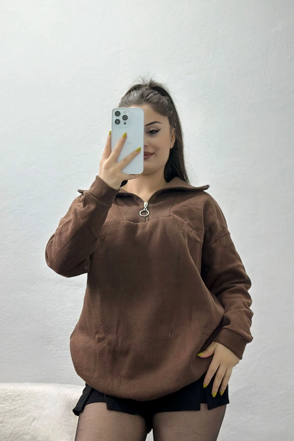 Fermuarlı İki İplik Şardonlu Sweat Kahve - 21389.200.