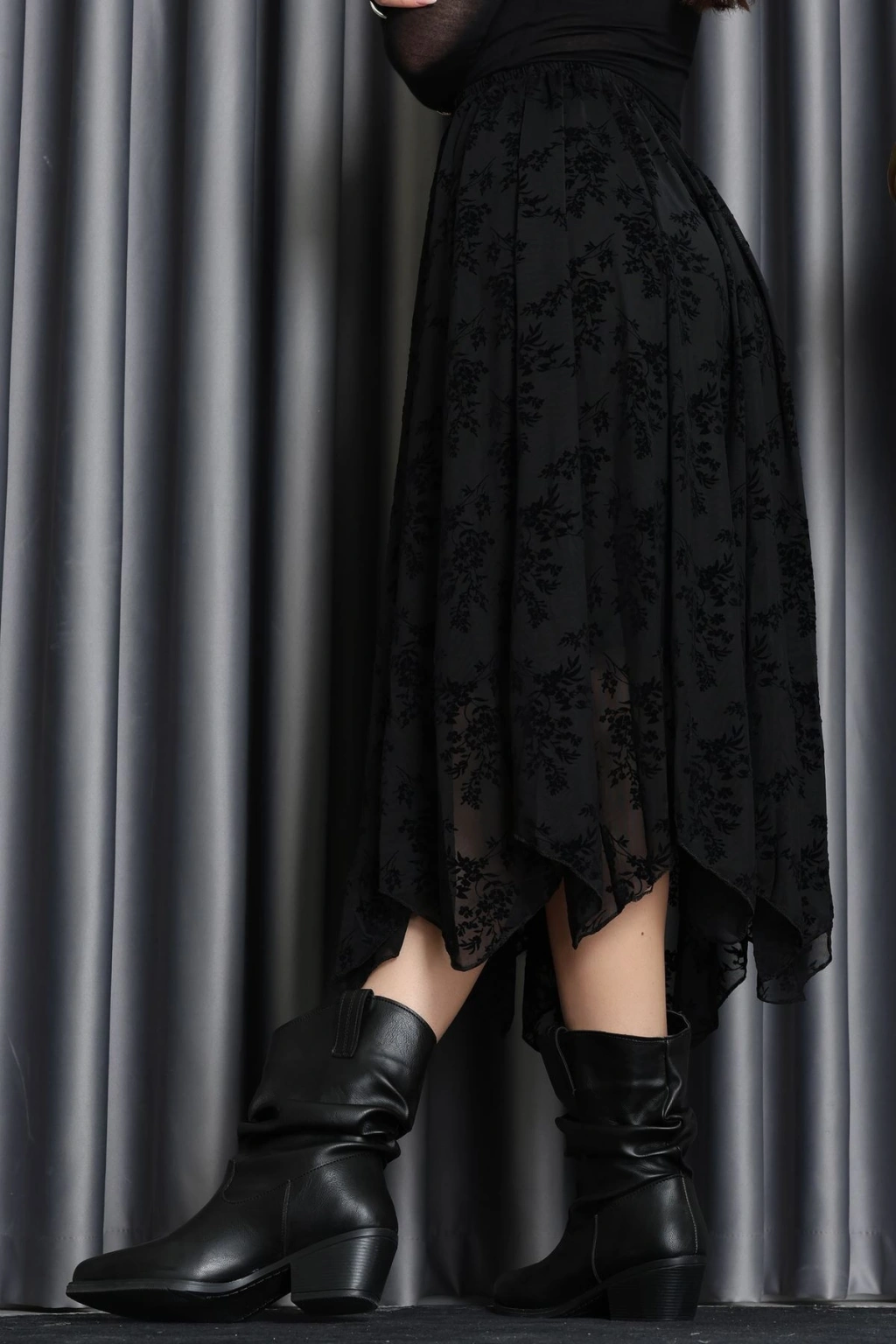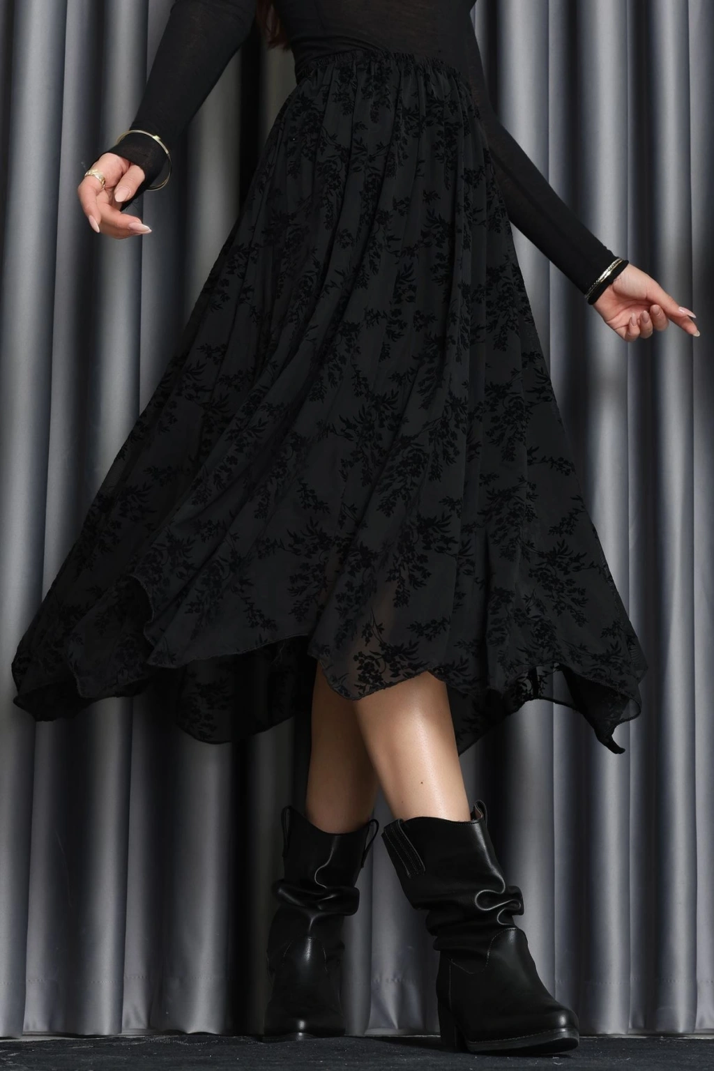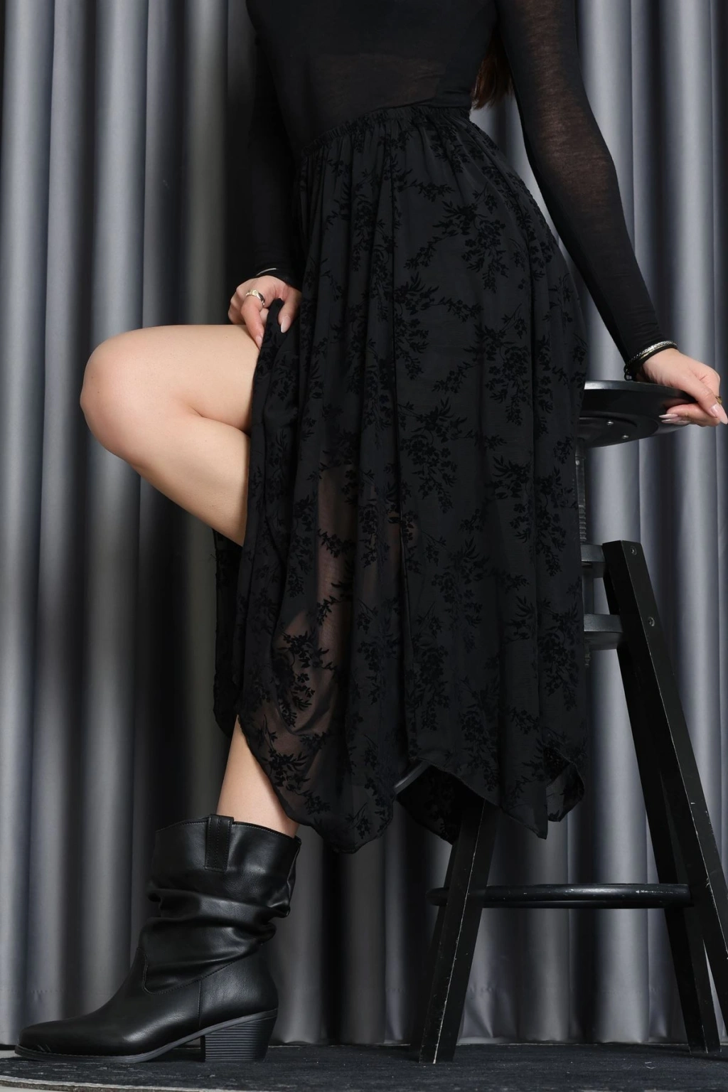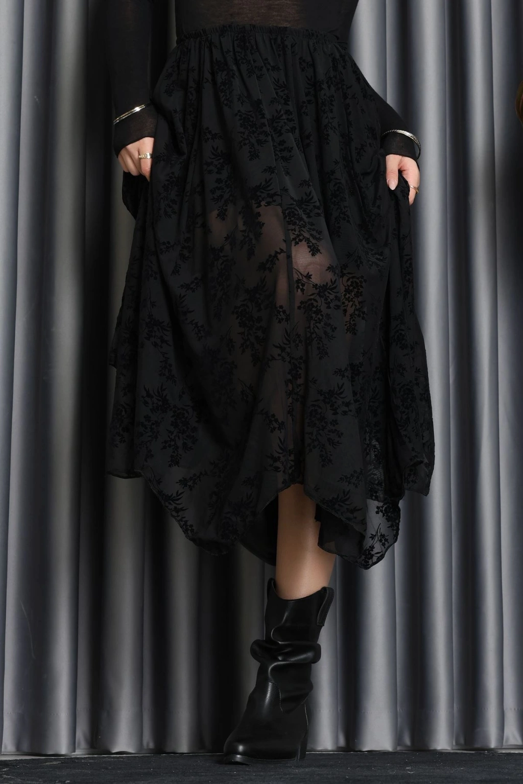 Flok Kabartma Baskılı Şifon Astarlı Etek Siyah - 70845.2078.