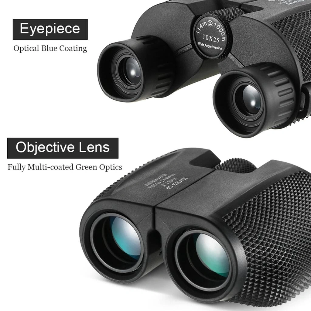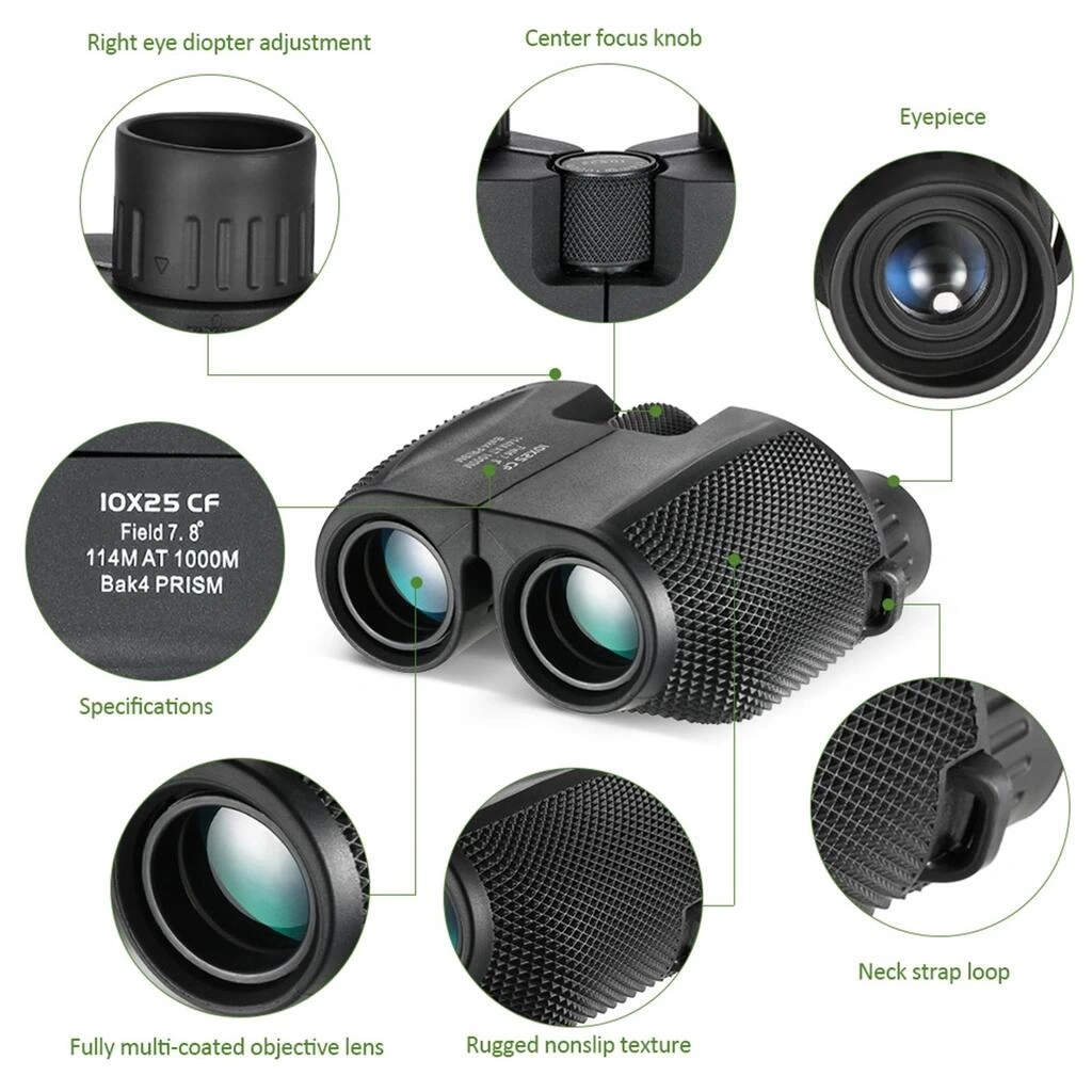 Özellikleri:Güçlü 10x büyütme ve 25mm objektif lens ile kompakt dürbün.Gelişmiş ışık iletimi ve görüntü netliği için Bak4 prizma ve çok kaplamalı lens.Ergonomik kauçuk zırh, güvenli bir kavrama sağlarken şoku emer.Orta düğmesi düzgün çalışması için duruluyor. Görüş alanı: 114m / 1000m.Hassas ayar için bükümlü diyopter ayarı.Hafif ve kompakt, kamp yapmak, yürüyüş yapmak, konserler, kuş gözlemciliği, seyahat etmek, golf oynamak, spor etkinlikleri ve diğer açık hava etkinlikleri için idealdir..Taşıma çantası, temizleme bezi, boyun askısı ve kullanım kılavuzu ile birlikte gelir.