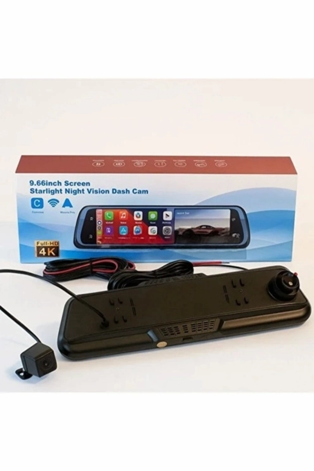 TEKNİK ÖZELLİKLER Ekran: 9.66” Tam Dokunmatik IPS Kamera: Ön 4K (2MP) | Arka 1080P (1MP) Lens Açısı: Ön 170° | Arka 140° Diyafram: F2.0 (ön ve arka) Fotoğraf Çözünürlüğü: 12MP Video Formatı: MJPG Özellikler: G-sensör, hareket algılama, park monitörü, çevrimsel kayıt, zaman/tarih ekranı, WDR Hafıza: Micro SD kart destekler (Dahil değildir) Gece Görüşü: Var CarPlay / Android Auto: Var Arka Kamera Kablosu: 6-10 metre destekler Batarya: Dahili (yalnızca ayar hafızası içindir, çalışırken harici güç gerekir)