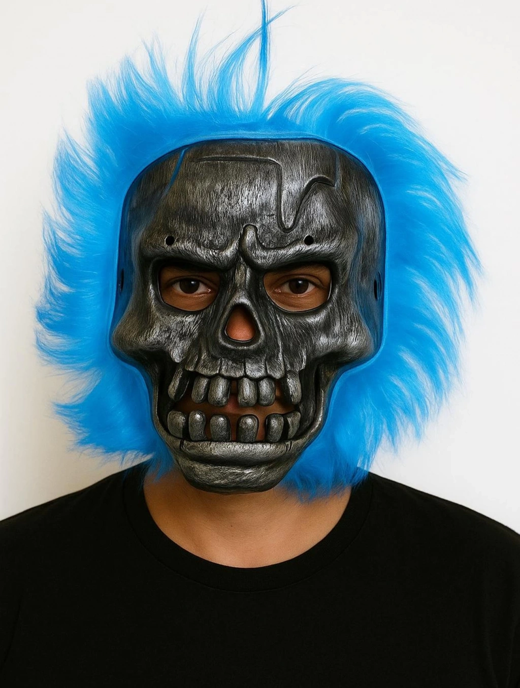 Maskenin etrafı lacivert saçlarla çevrilmiştir