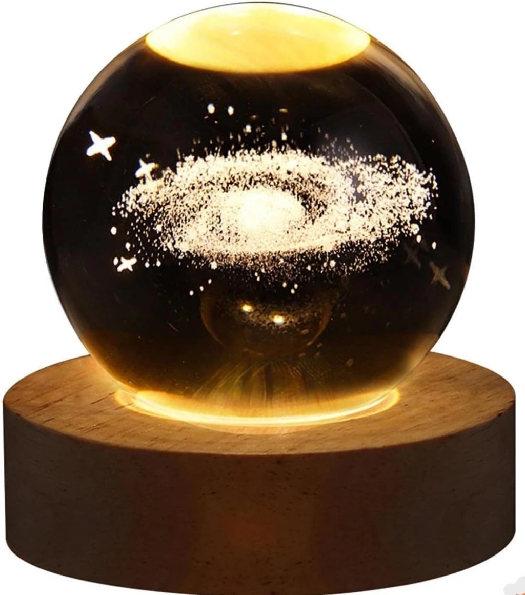 Dekoratif Samanyolu Tasarımlı Ahşap Altlıklı Işıklı Cam Küre Cam:6cm Ahşap:2cm