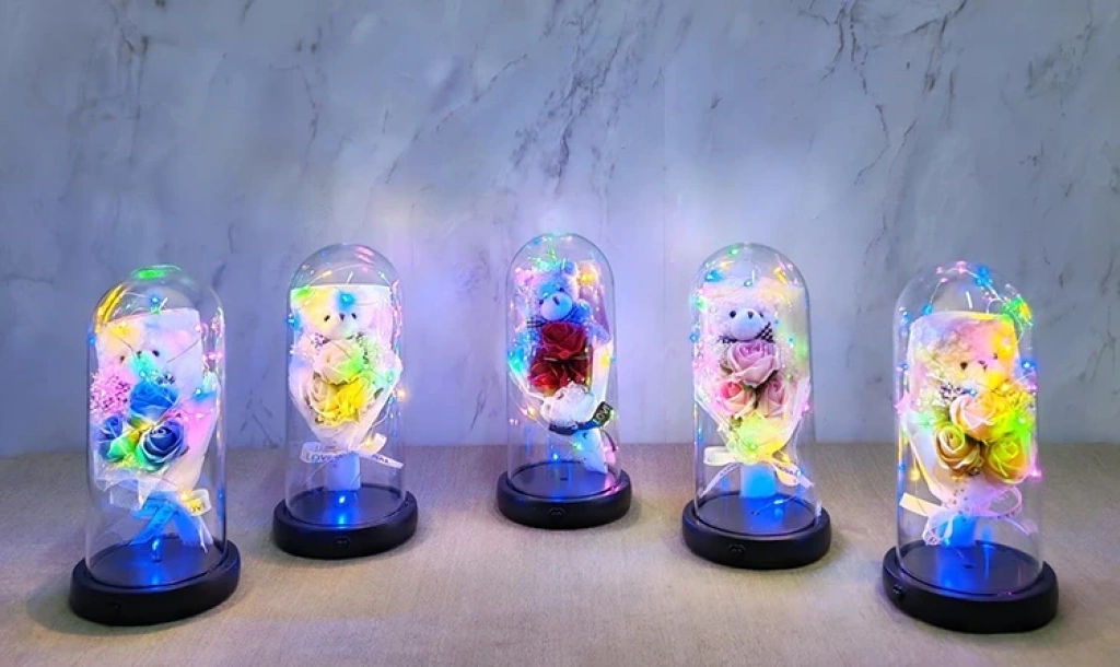 Işıklı Müzikli Fanus içinde Sevimli Ayıcıklı Gül Buketi Alk5002 Ürün Ölçüleri 21*11 Cm