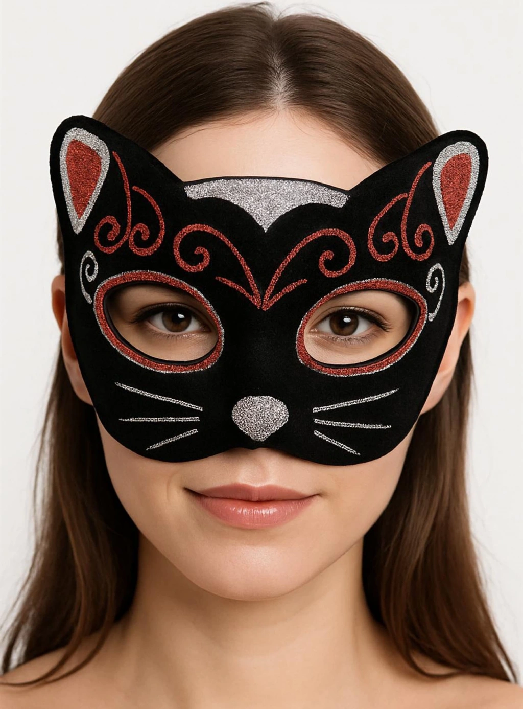Karnaval, parti ya da özel konseptli davetler için tasarlanmış bu süet dokulu, ışıltılı kedi maskesi, şıklığın ve gizemin buluşma noktası. Siyah zemin üzerine kırmızı ve gümüş sim işlemeleriyle bezenmiş olan bu maske, hem konfor hem de göz alıcılık sunar.