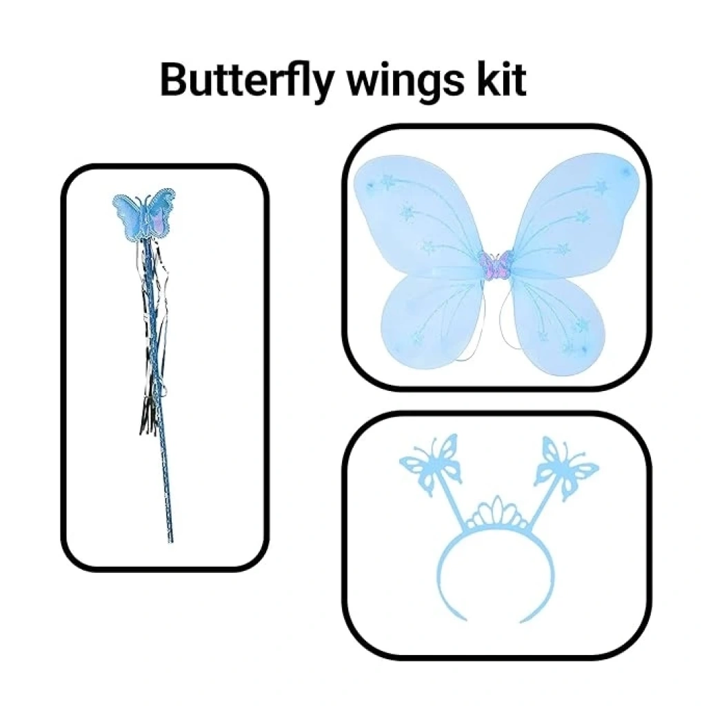 Küçük çocuklarınızın kelebek olma hayalini gerçeğe dönüştürmek için Mavi Renk Çocuk Kelebek Kanat Taç Asa Seti 50 cm tam size göre Bu setle minik prensesiniz masalsı bir kelebeğe dönüşecek ve hayal gücünün sınırlarını zorlayacak.