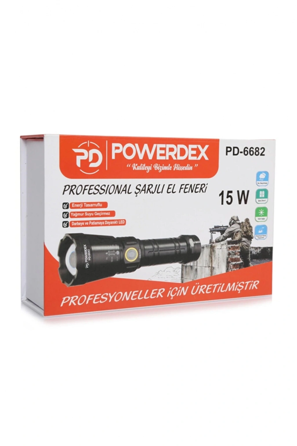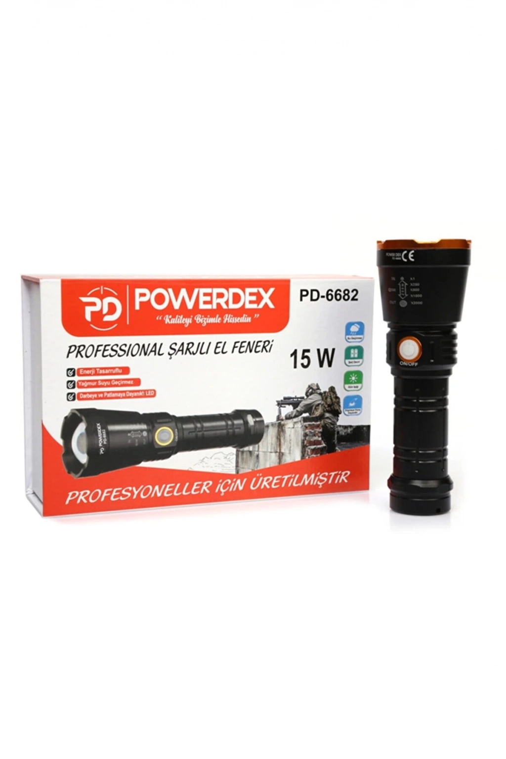 Özellikler 26650 4800mAh 3.7V Li-ion pil Süper LED Zoom ( x1 - x250 -x1000 - x2000) 6 saat kesintisiz çalışma 8 saat şarj dolum süresi Enerji tasarruflu Yağmur suyu geçirmez Darbeye ve patlamaya dayanıklı LED Ağırlık : 310 gr. Uzunluk : 17 cm (Zoom Hariç) 1000 Lümen Paket İçeriği 1 Adet PD-6682 1 Adet 26650 4800mAh 3.7V Li-ion Pil 1 Adet Şarj Aleti 1 Adet İnce Kalem Pil Yuvası 1 Adet Taşıma İpi